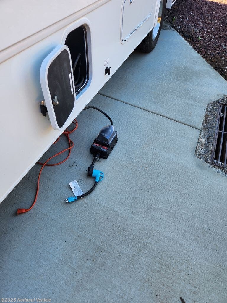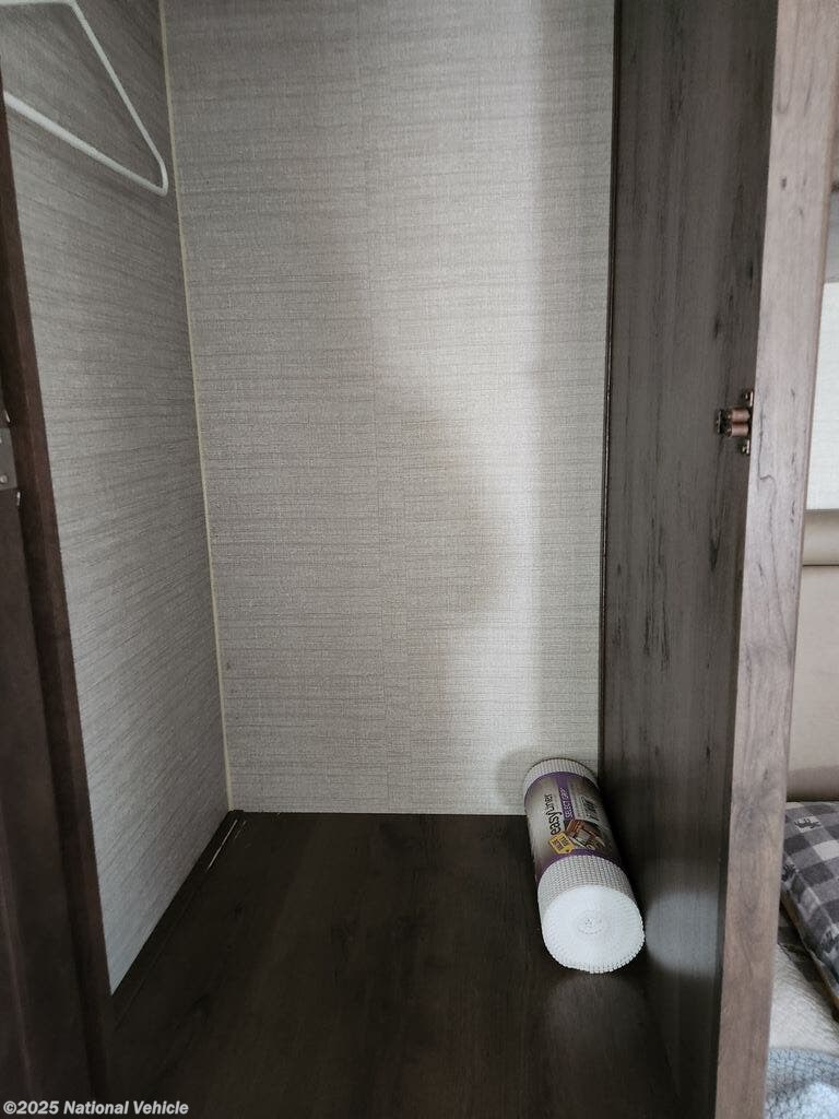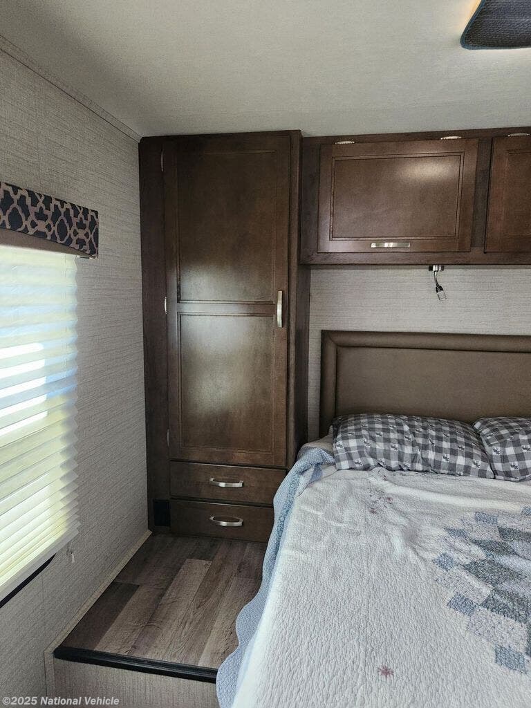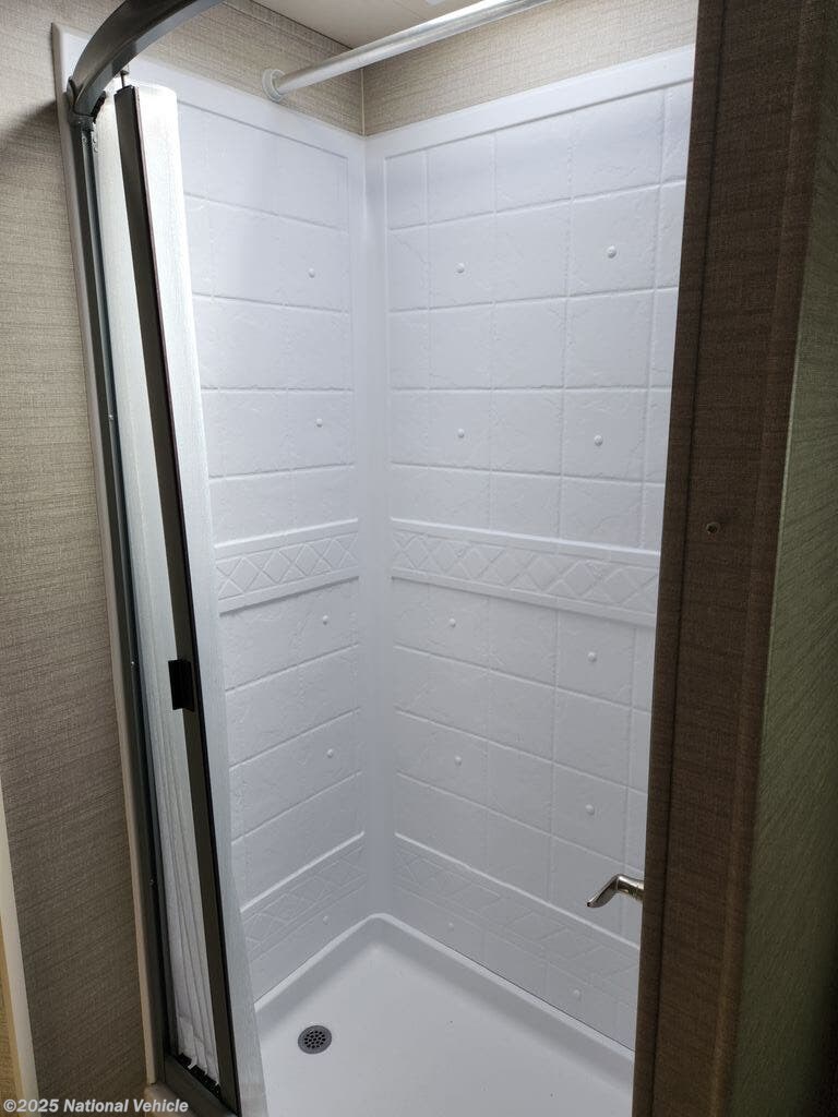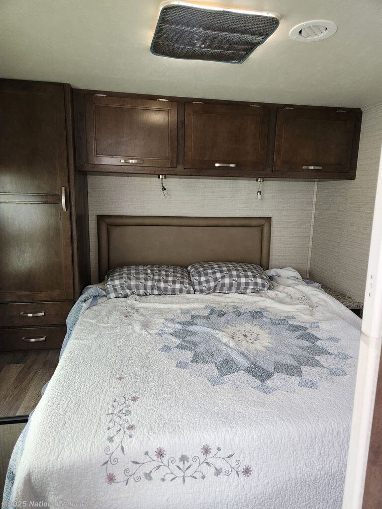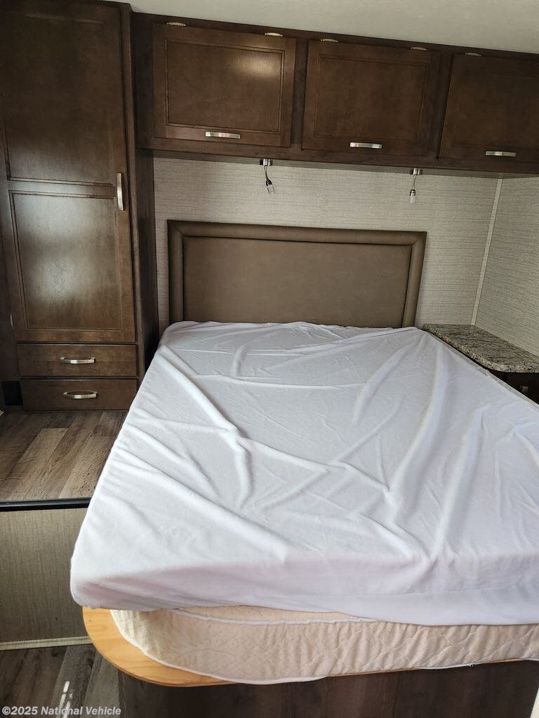 You can travel as far as you like, and sleep in comfort as well as dine and get cleaned up with your own accommodations. There is storage for a weekend or week-long trip, a TV over the cab, and a private rear bedroom when you close the divider. When it's time to retire for the evening, the walk-around queen bed provides you with a good night's rest no matter where you go, and the furniture plus the cab-over bunk offers extra sleeping space when needed. You also have a split bath allowing more than one person to be getting ready at once. You can either cook meals or heat up take-out in the kitchen, the choice is yours. You will even find a place for your golf clubs or camp chairs in the exterior pass-through storage compartment.