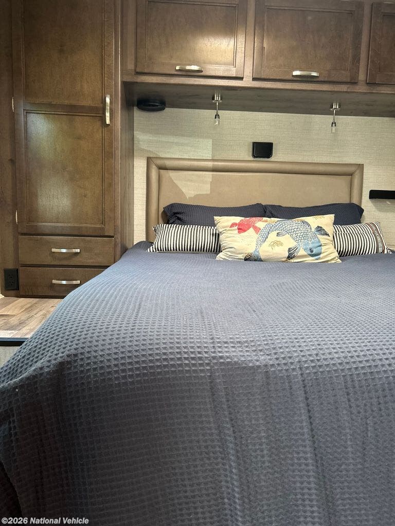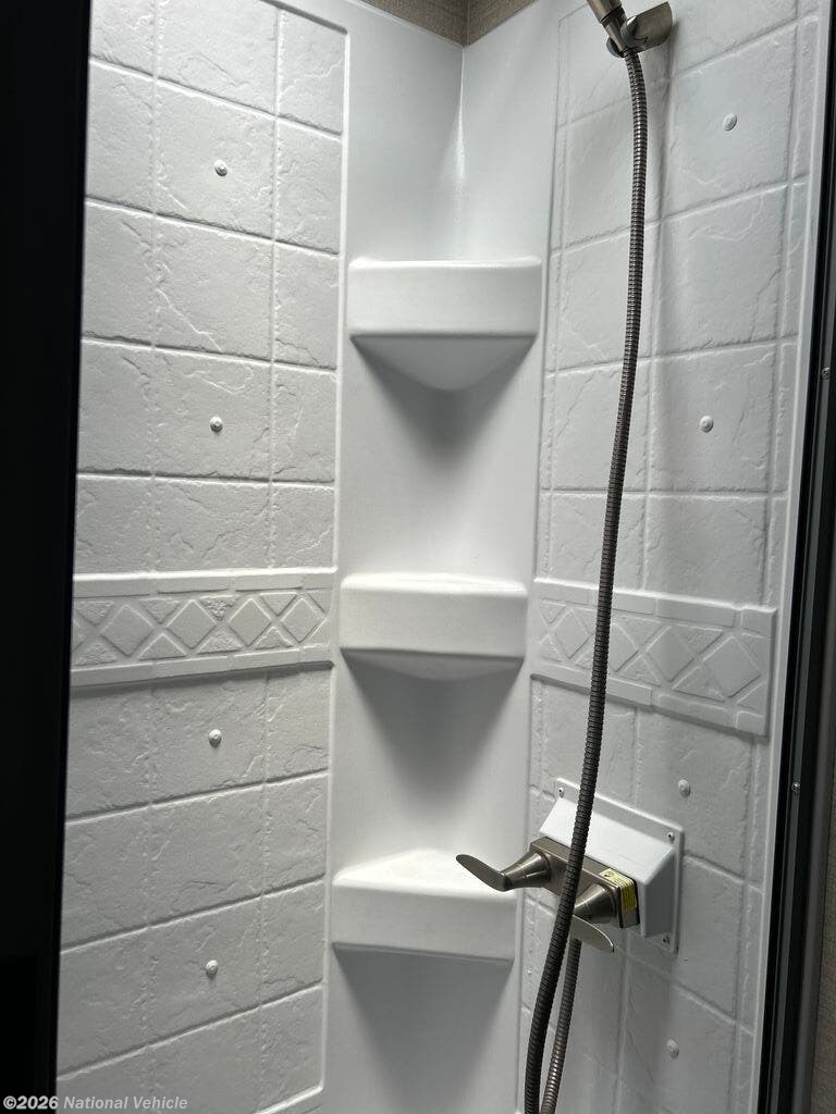 The private rear bedroom offers a comfortable walk-around queen bed with overhead storage and wardrobe space, while the cab-over bunk and convertible dinette provide additional sleeping accommodations?ideal for families or guests. The bathroom includes a roomy shower, vanity, and toilet, giving you all the conveniences of home on the road.