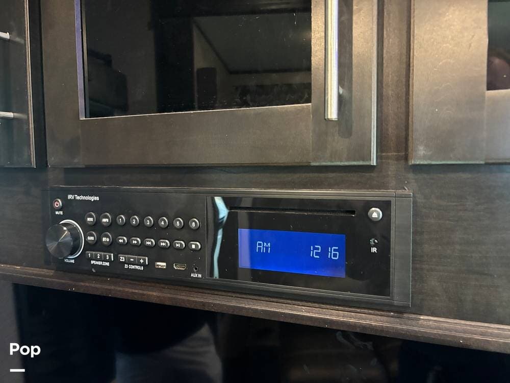 This Seismic 3815 is built for "adventure," equipped with a "5500W Onan generator" and three air conditioners to keep you comfortable in any climate. Outside, enjoy two power awnings with LED lights, a fuel station, and the "5 Star Handling Package" which includes MorRyde CRE-3000 suspension. The rear ramp door converts into a "party deck" with screen doors, offering an excellent outdoor relaxation area.