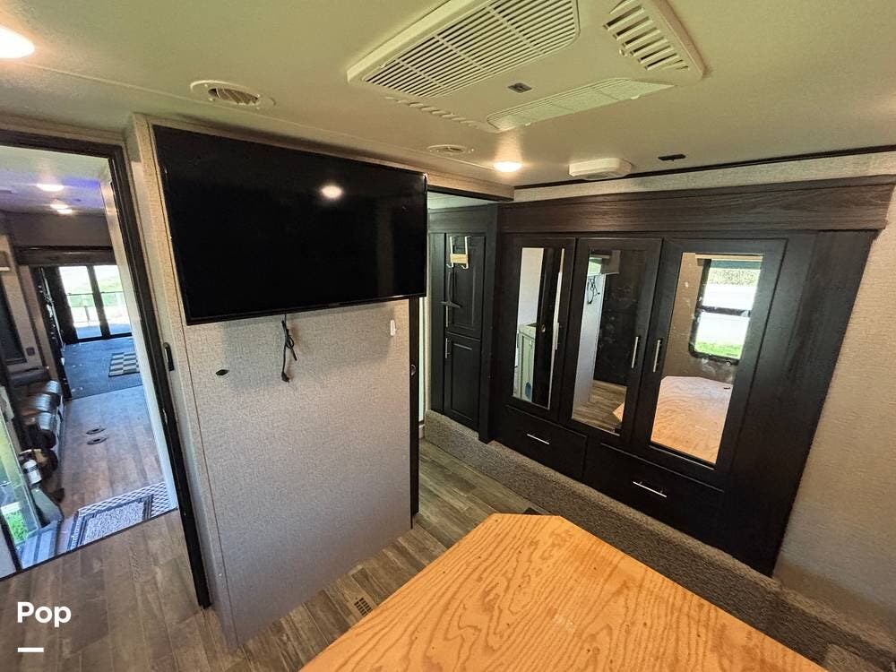 The front bedroom provides a restful retreat featuring ample storage. A key feature is the CPAP-prepped design, alongside a 32-inch television for private viewing.