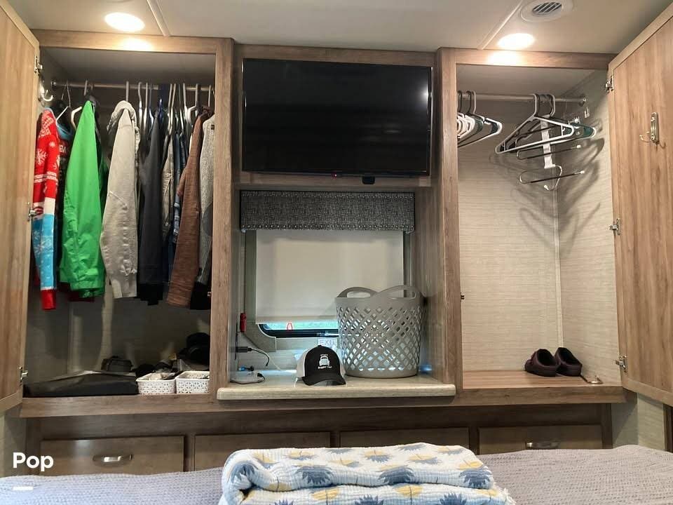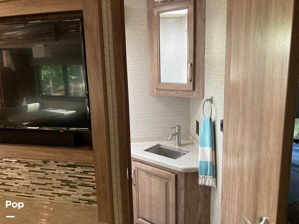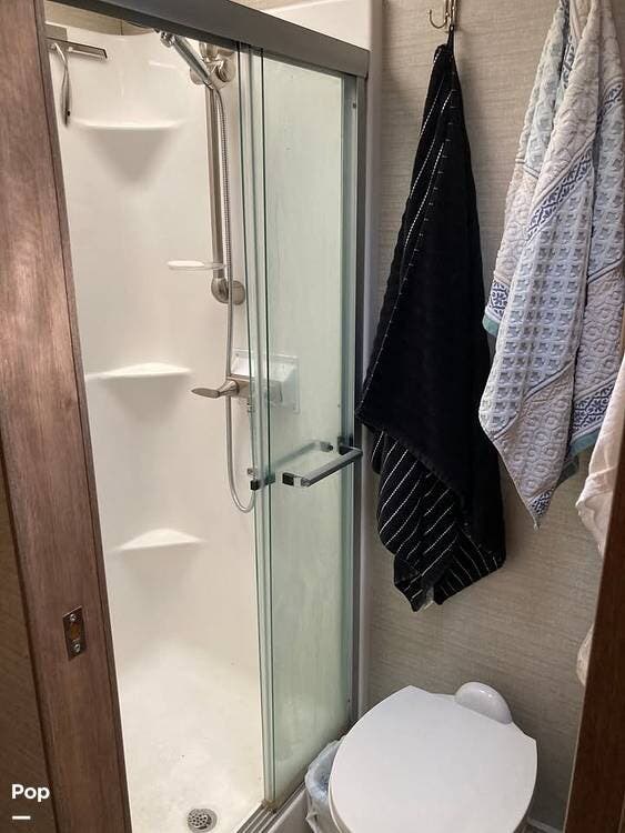 Step inside, and you'll be greeted by a spacious interior with two slide-outs that create an open, inviting living space. The 37K floorplan features a dream layout with a bath-and-a-half design, ideal for families or guests on the road. The master suite offers a king-size bed, a large wardrobe, a dresser, and its own entertainment center. At the rear, the private en suite bathroom features a roomy shower, vanity, and ample storage, while the mid-coach half bath adds convenience for guests.