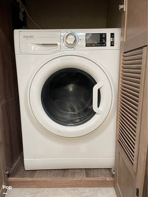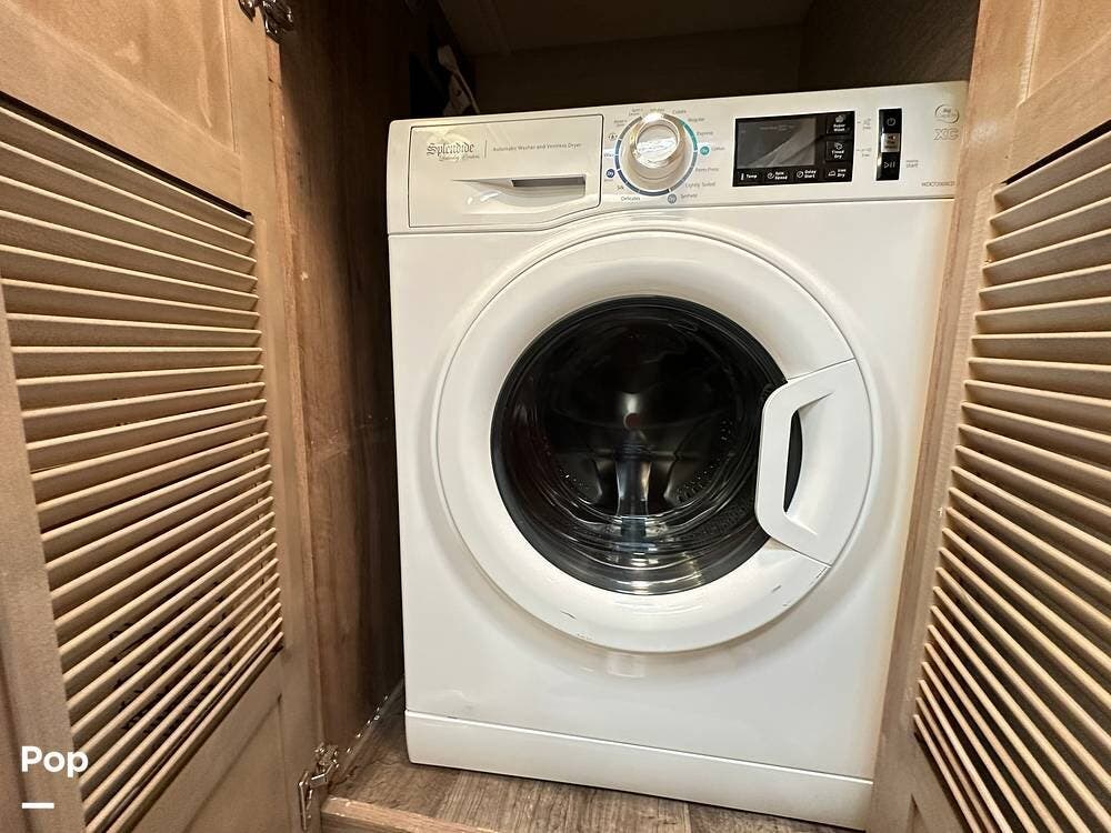 The private master suite offers a king-size bed, a large wardrobe, a dresser, and its own entertainment center with a wall-mounted TV. Also, you have a nice half bathroom mid coach, a private full bath, and a large shower, toilet, and vanity sink with cabinets off the master bedroom at the rear, including a washer/dryer combo.