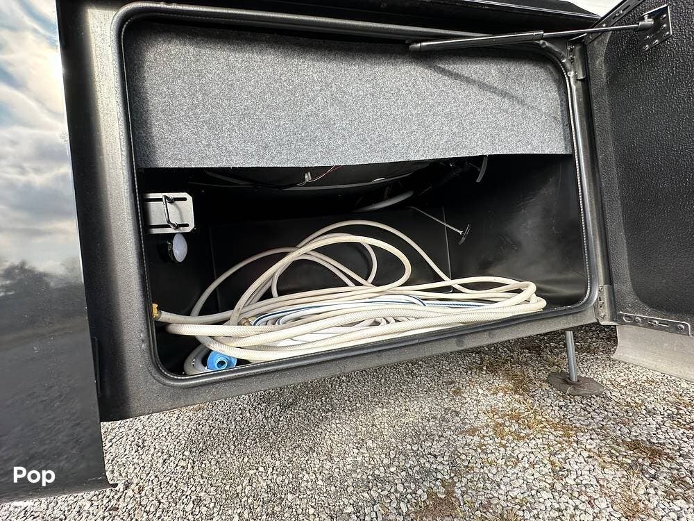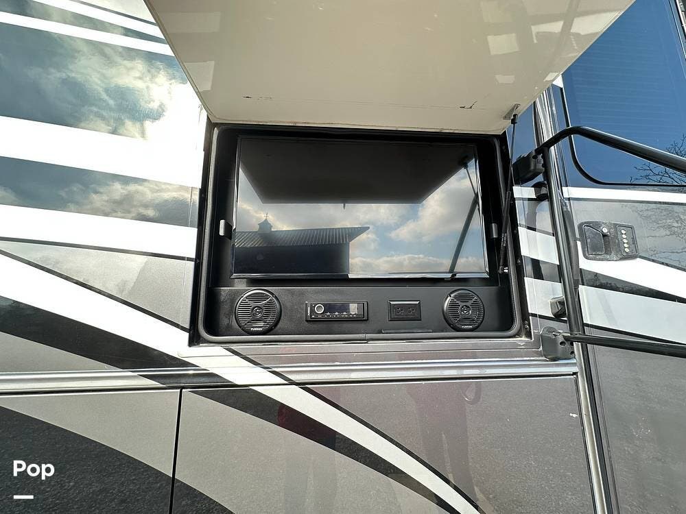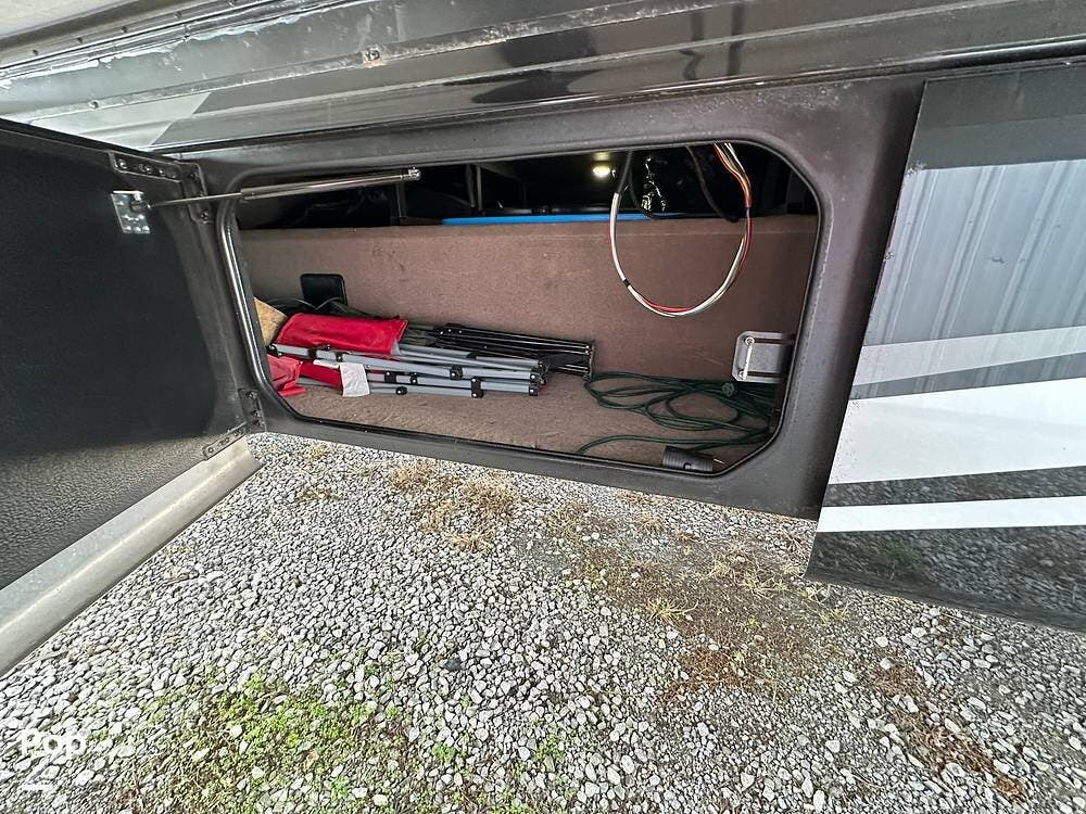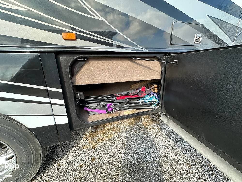 On the exterior, you have a large amount of storage space plus all of the normal utility hookups, automatic leveling jacks, backup and side-view cameras, plus this coach has a high-gloss, fiberglass exterior with full-body paint and a 17' awing for your cookouts while watching your favorite TV show.