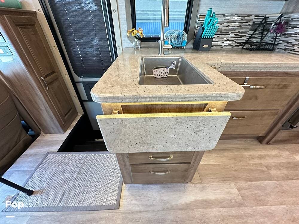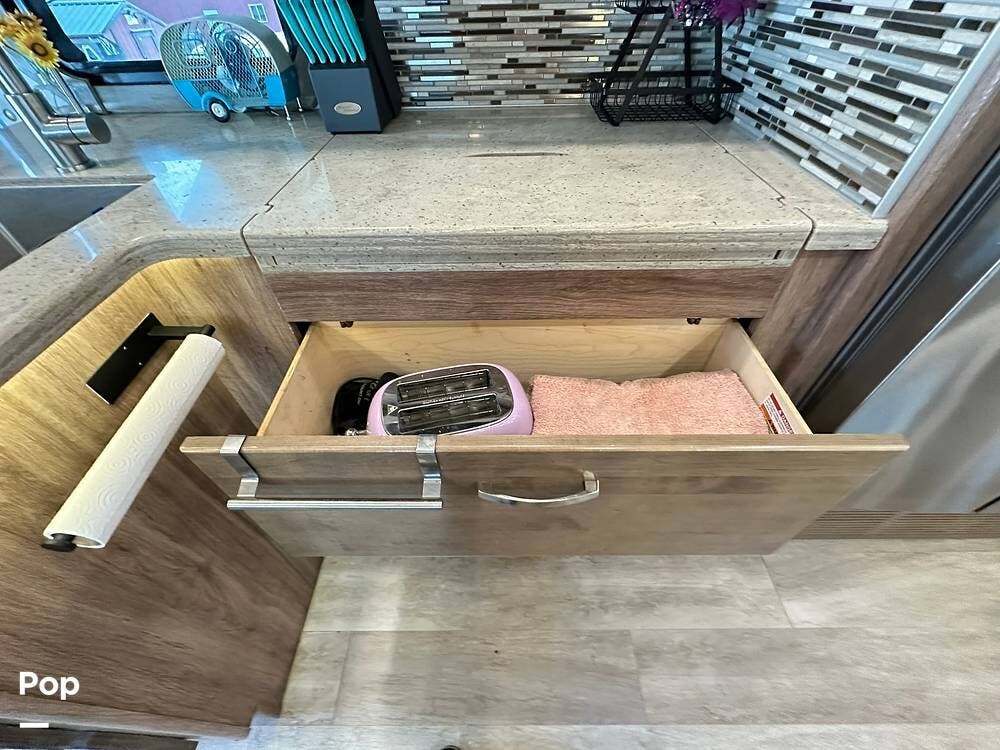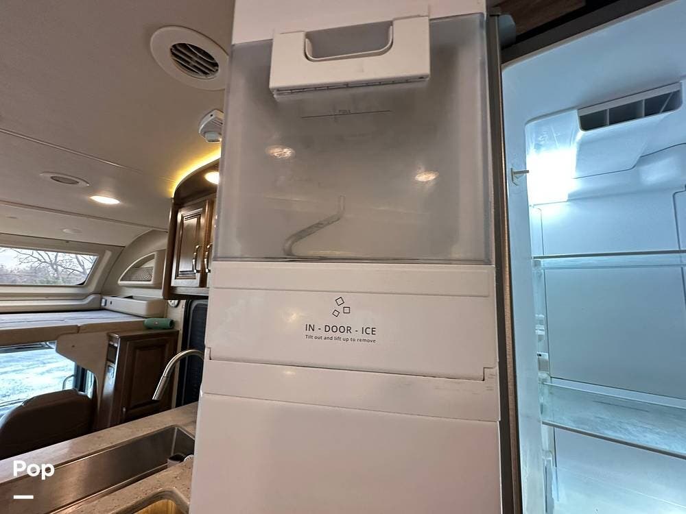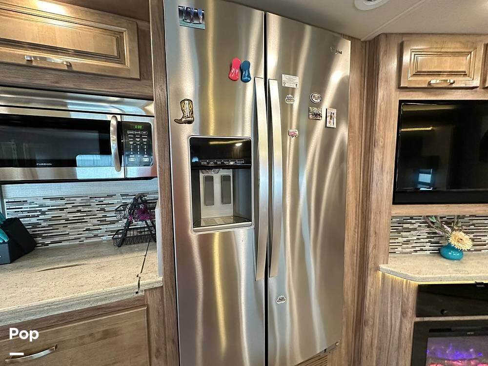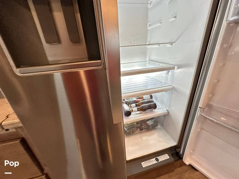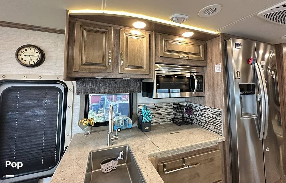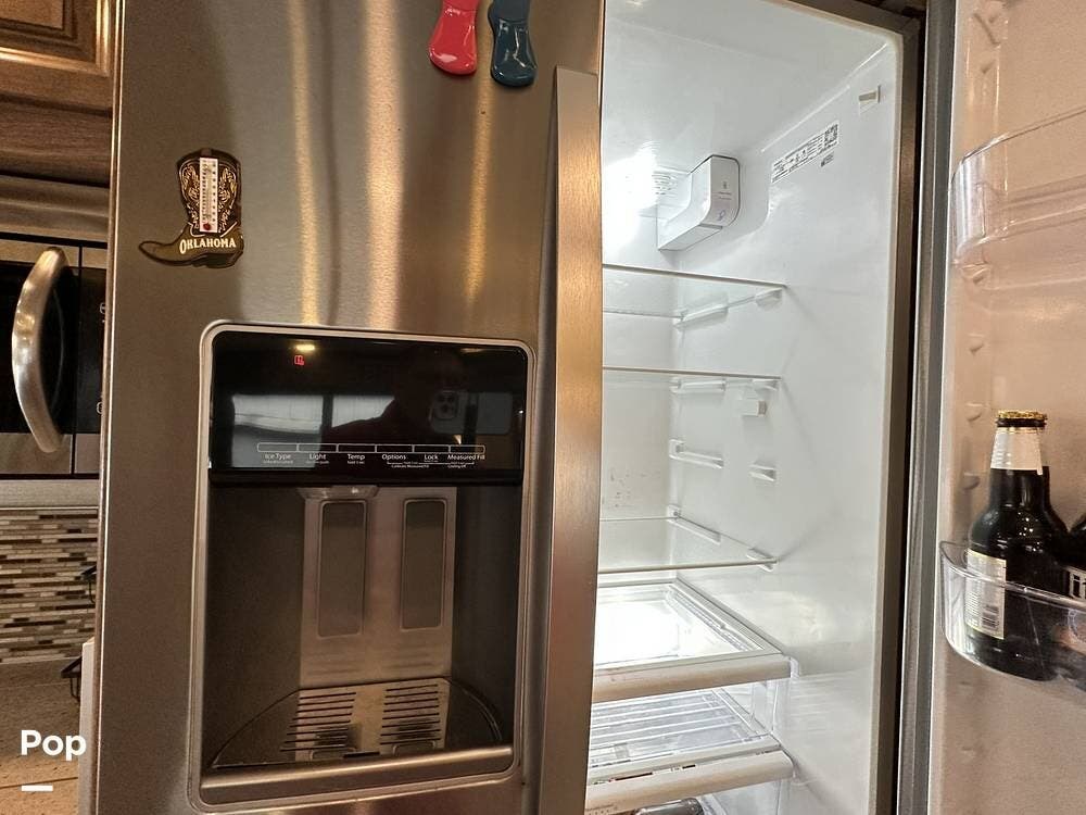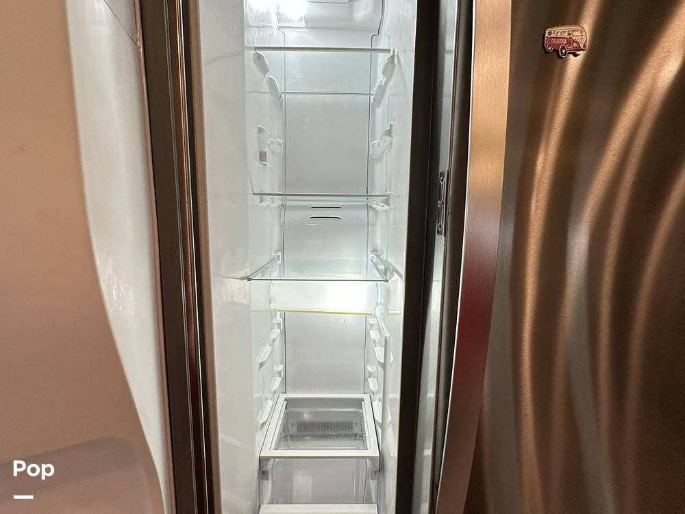 The spacious interior features two slide-outs, a full kitchen with a double sink, a large residential-style refrigerator/freezer with an ice maker, a convection microwave, and a 3-burner stove with a solid-surface countertop.