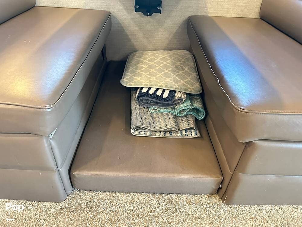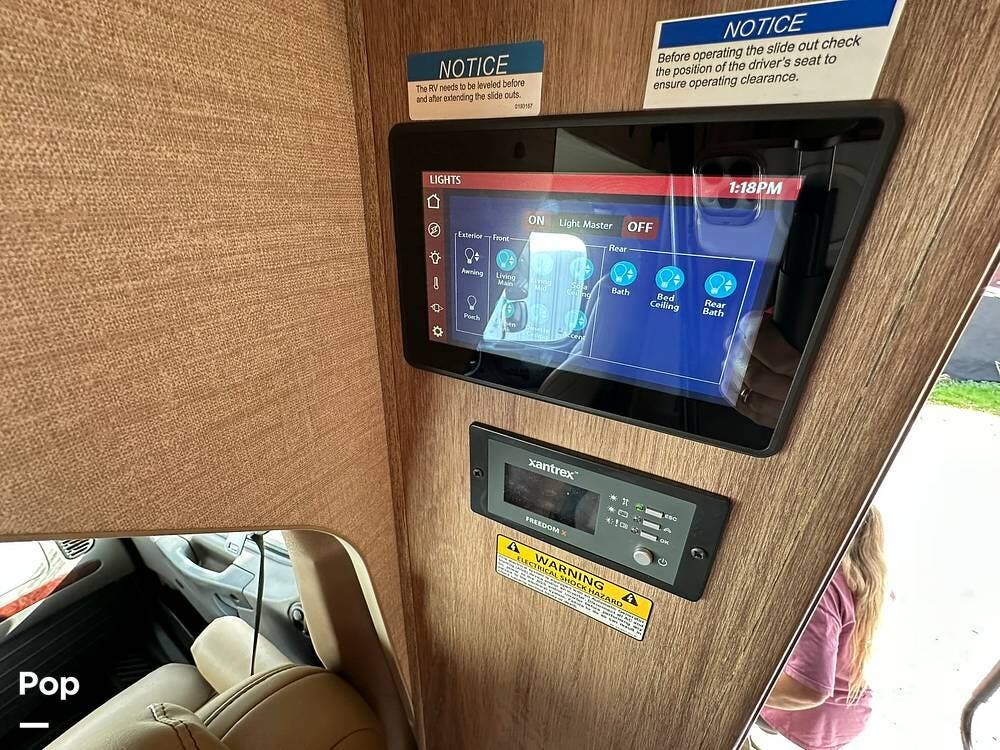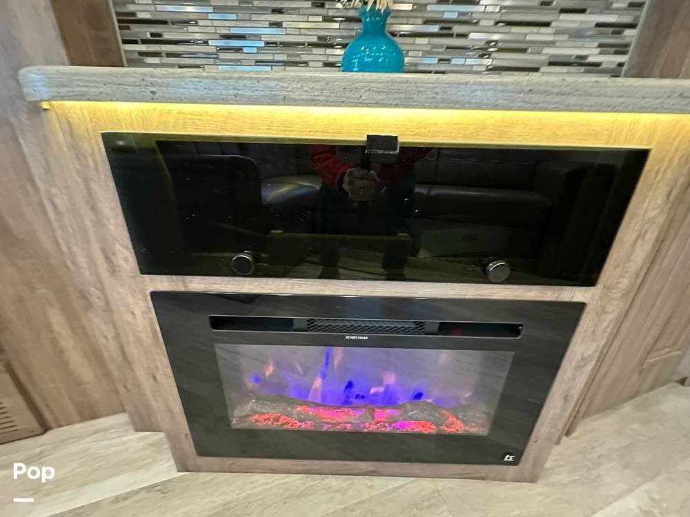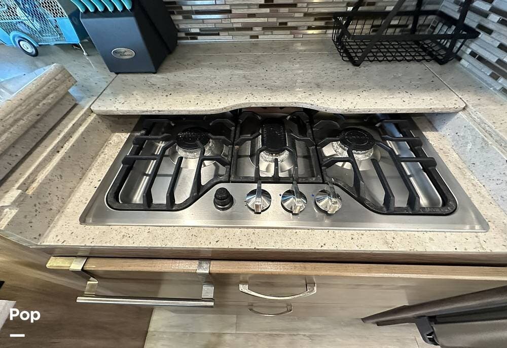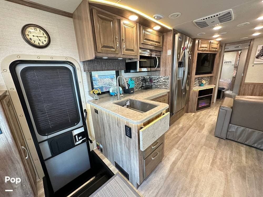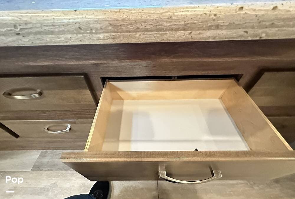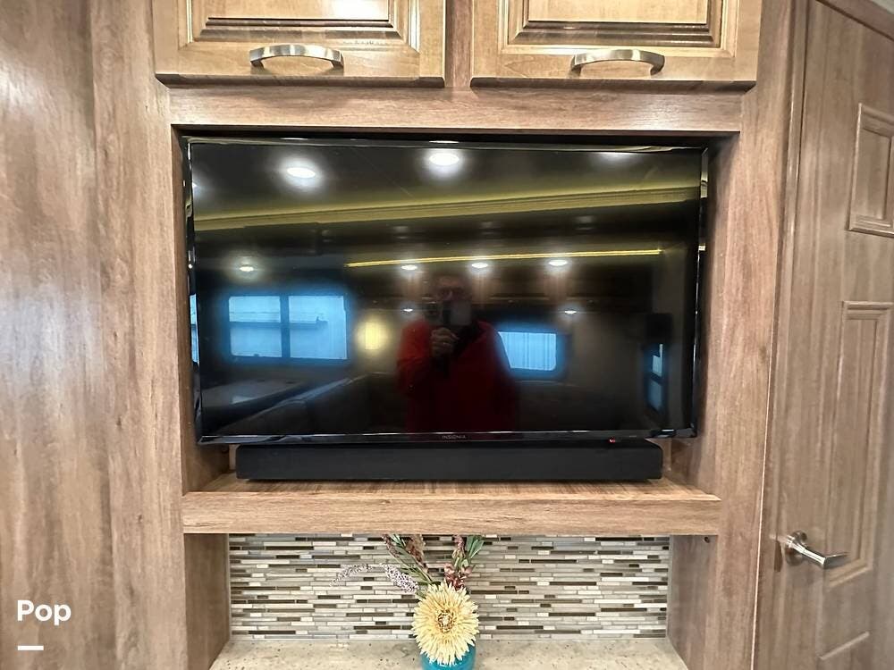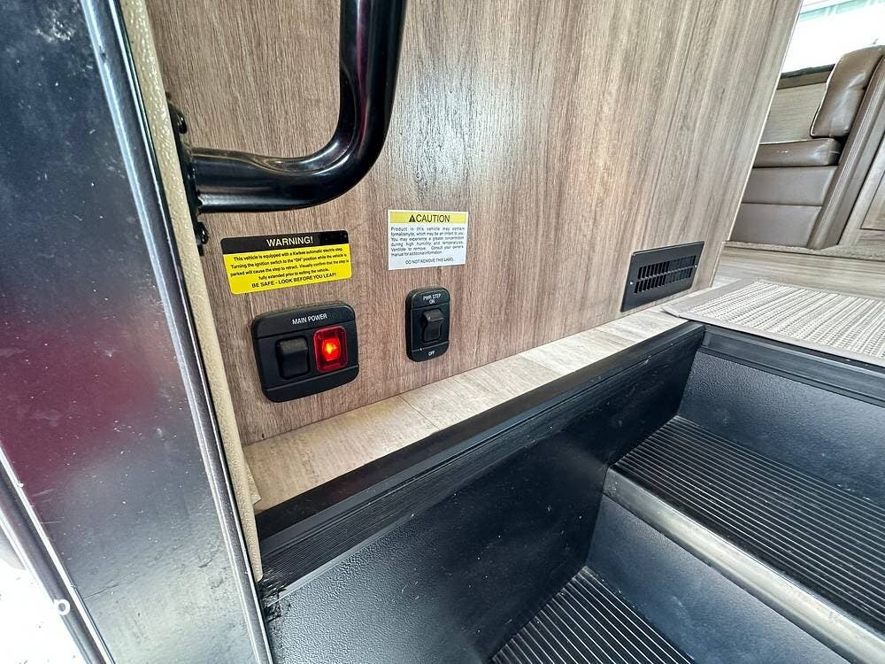 Plus a booth-style dinette that converts to a bed when needed. Also, there is enough sleeping space for up to seven people, with a jackknife couch that pulls out into an L, a king-size bed, and an over-the-cab bunk bed that kids love. You will find a large screen TV over the fireplace with a large reclining sofa across, plus all interior systems and touch-screen digital controls, along with plentiful cabinet storage throughout.