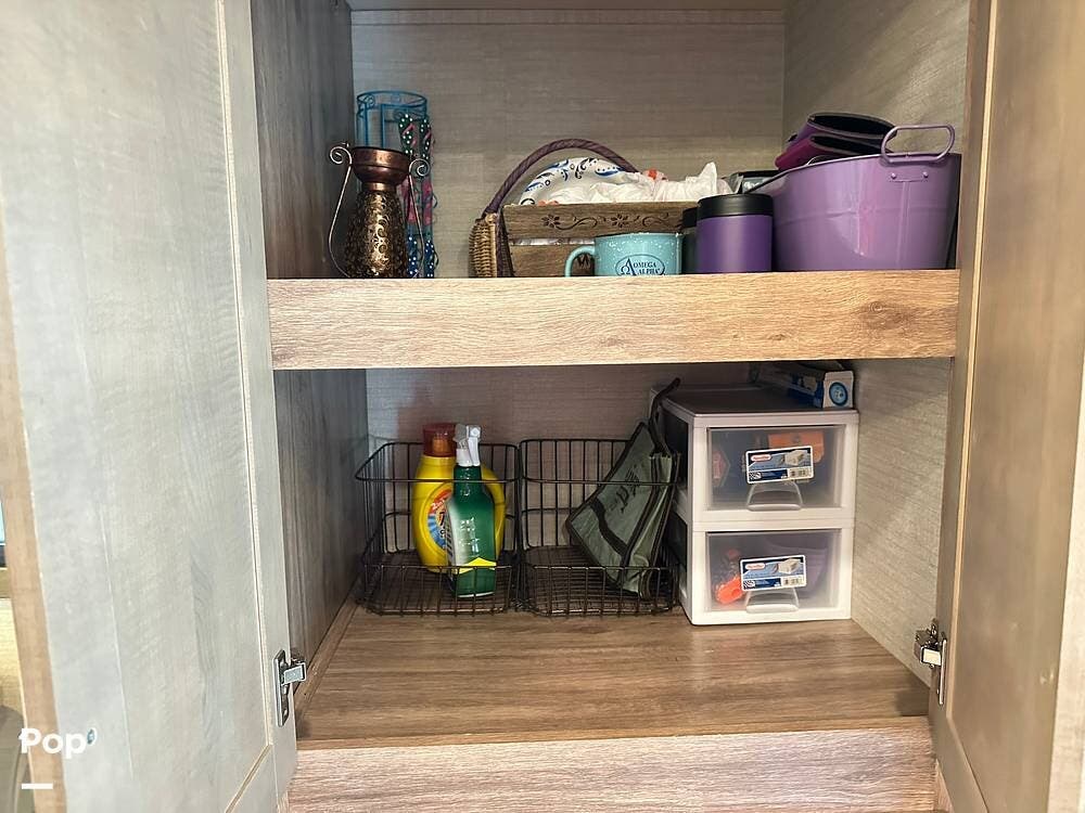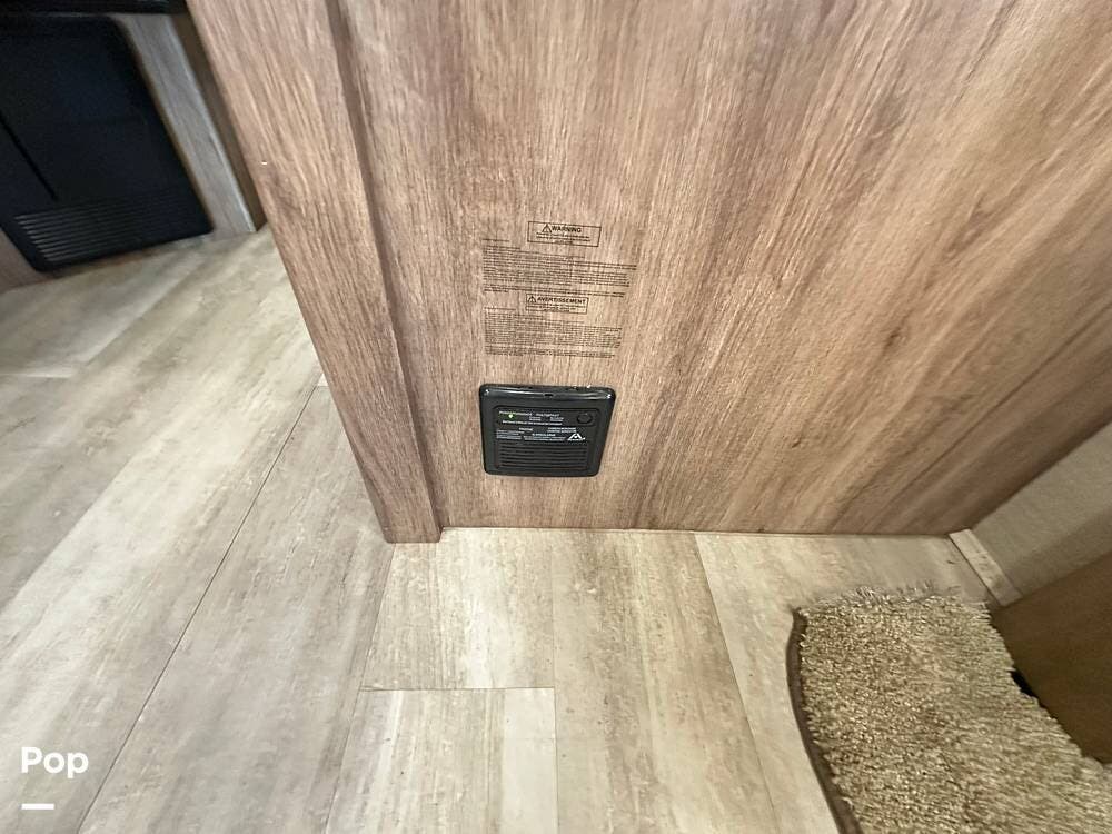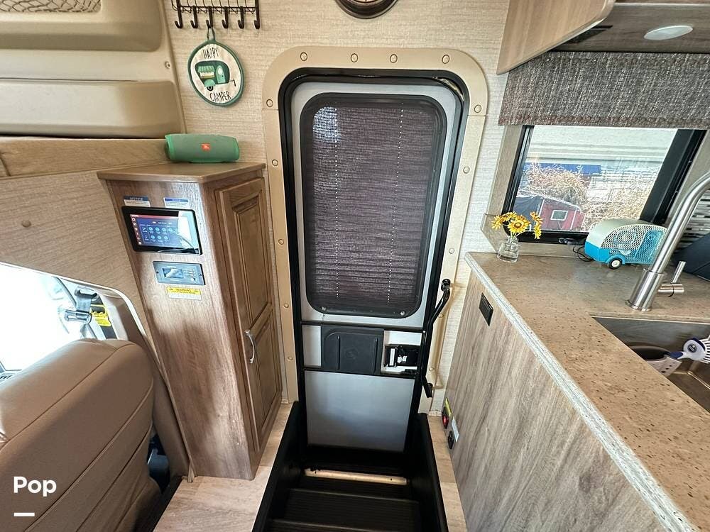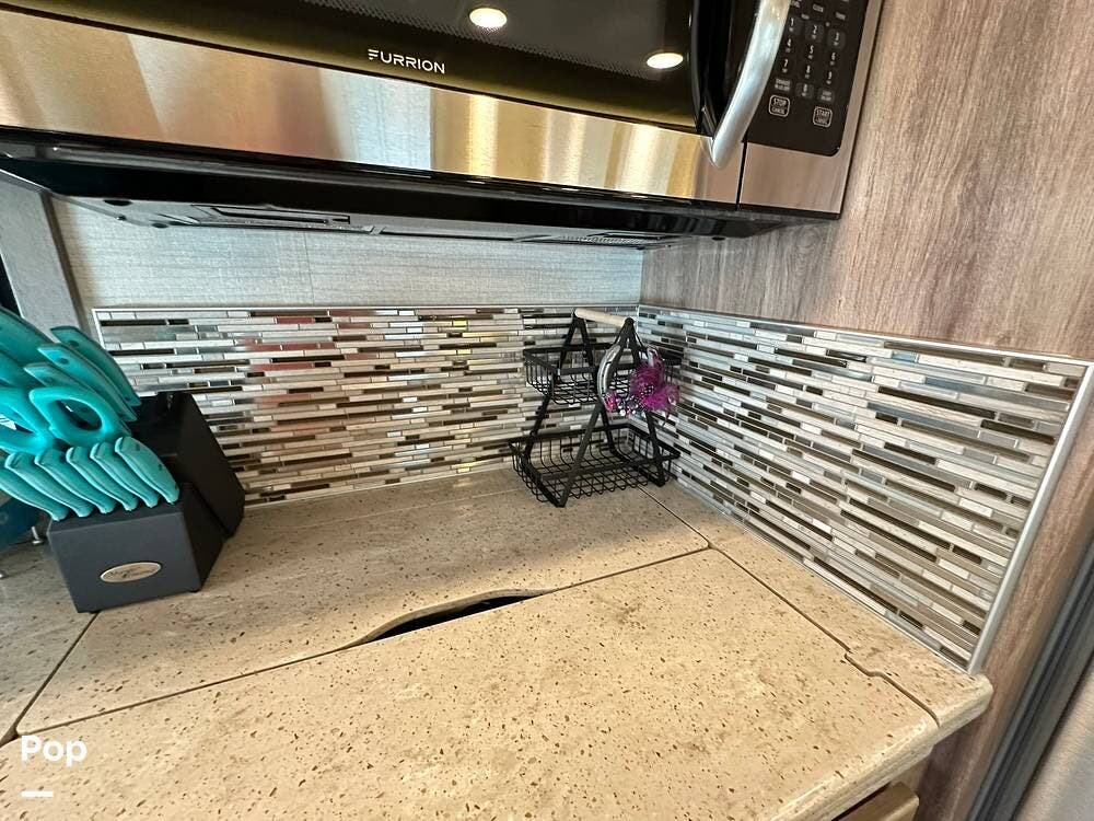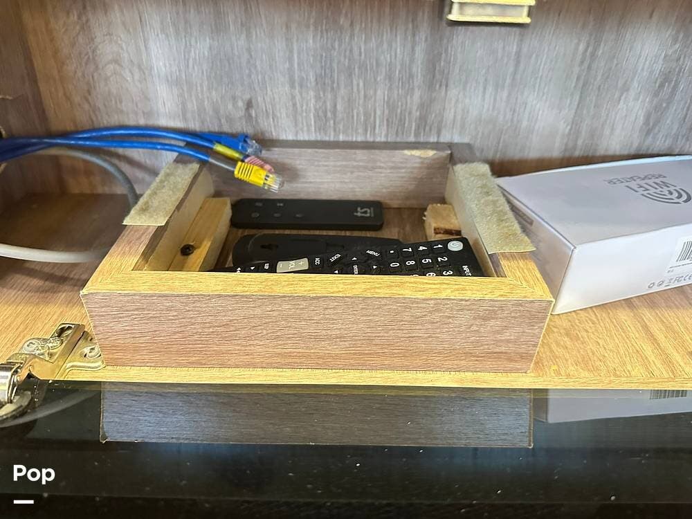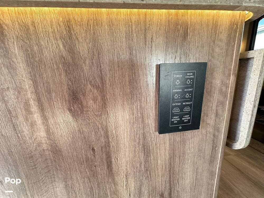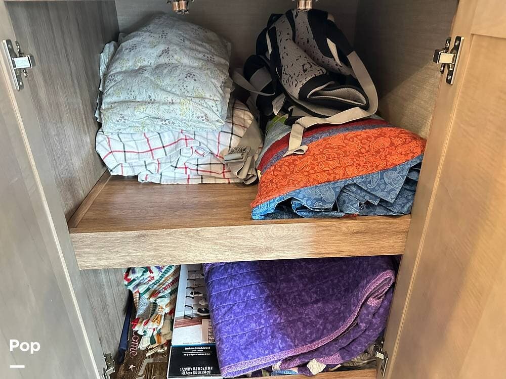 Plus a booth-style dinette that converts to a bed when needed. Also, there is enough sleeping space for up to seven people, with a jackknife couch that pulls out into an L, a king-size bed, and an over-the-cab bunk bed that kids love. You will find a large screen TV over the fireplace with a large reclining sofa across, plus all interior systems and touch-screen digital controls, along with plentiful cabinet storage throughout.
