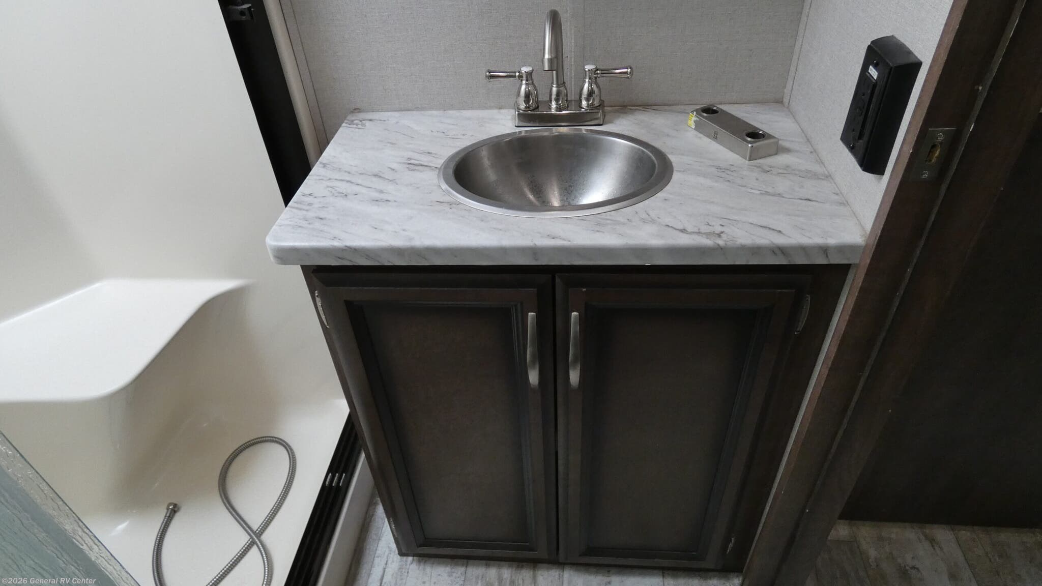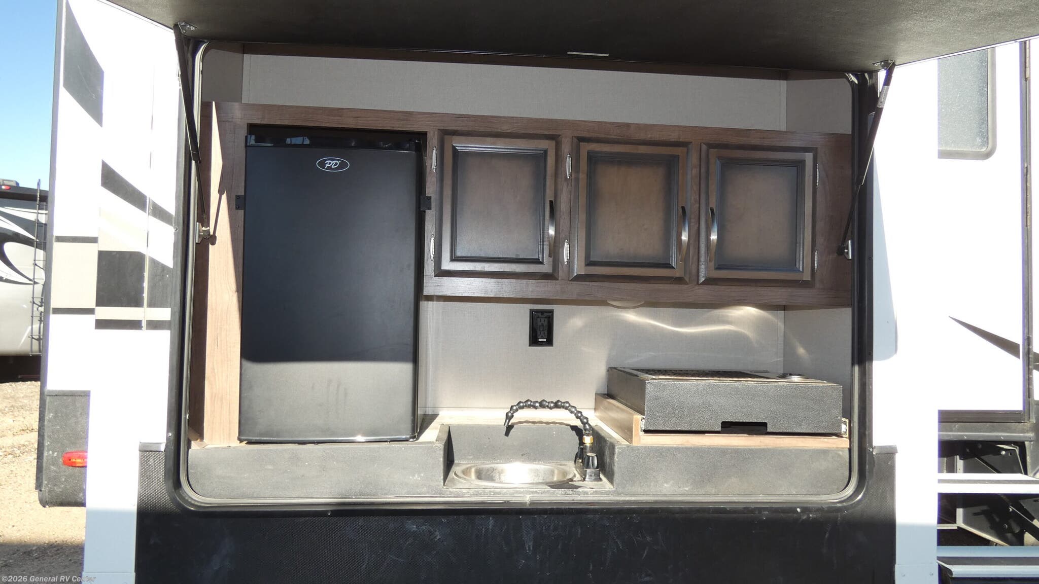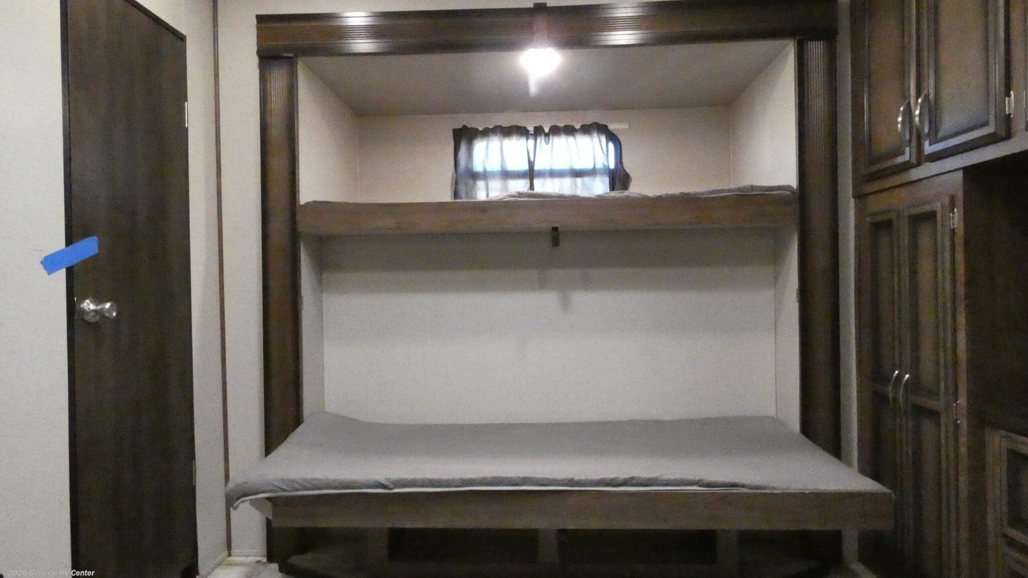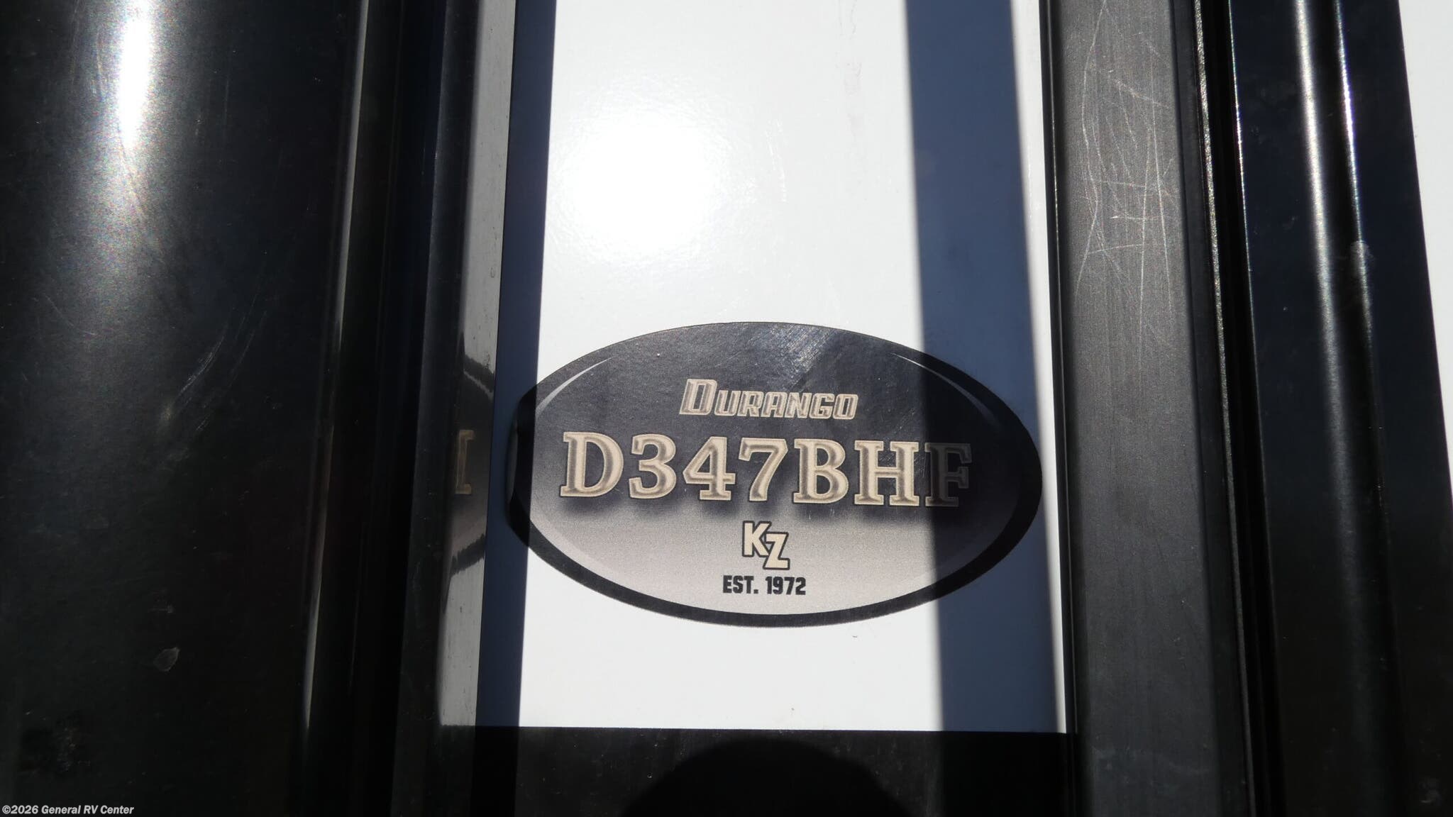 KZ Durango fifth wheel D347BHF highlights: Bunkhouse Dual Entry Bath and a Half Outside Kitchen Your search is over! This Durango fifth wheel by KZ has everything on your checklist. This model features a bunkhouse with a half bath including a full wall entertainment center. The half bath has two entries, one from the bunkhouse and one from outside. There is comfortable residential-style furniture throughout including a U-shaped dinette in the living/kitchen area. You will also find a LED TV to watch, and a multiple media stereo. Don't forget about the outside kitchen including a rear bumper grill, sink, and even a refrigerator. So if you need sleeping space for 10 campers, enjoy floor space from five slide outs, and love to cook outdoors, check this model out today! Each Durango full profile fifth wheel by KZ includes inside luxurious features such as the Chef's Appliance package with a two-piece stainless steel gas cooktop with built-in oven and 30" convection microwave, plus solid surface countertops with a deep undermount stainless steel kitchen sink with a matte black residential faucet with spring sprayer, and maple glazed cabinetry. The exterior is built with a 5-sided 100% aluminum frame, and includes 4-point auto-leveling, and an All Weather Insulation package to travel any season. The TOGO KZ app as well as the KZ Engage powered by OneControl will allow you to monitor tank and battery levels, slide rooms, leveling system, awnings, and lighting. Choose your favorite model today and start traveling in luxury!