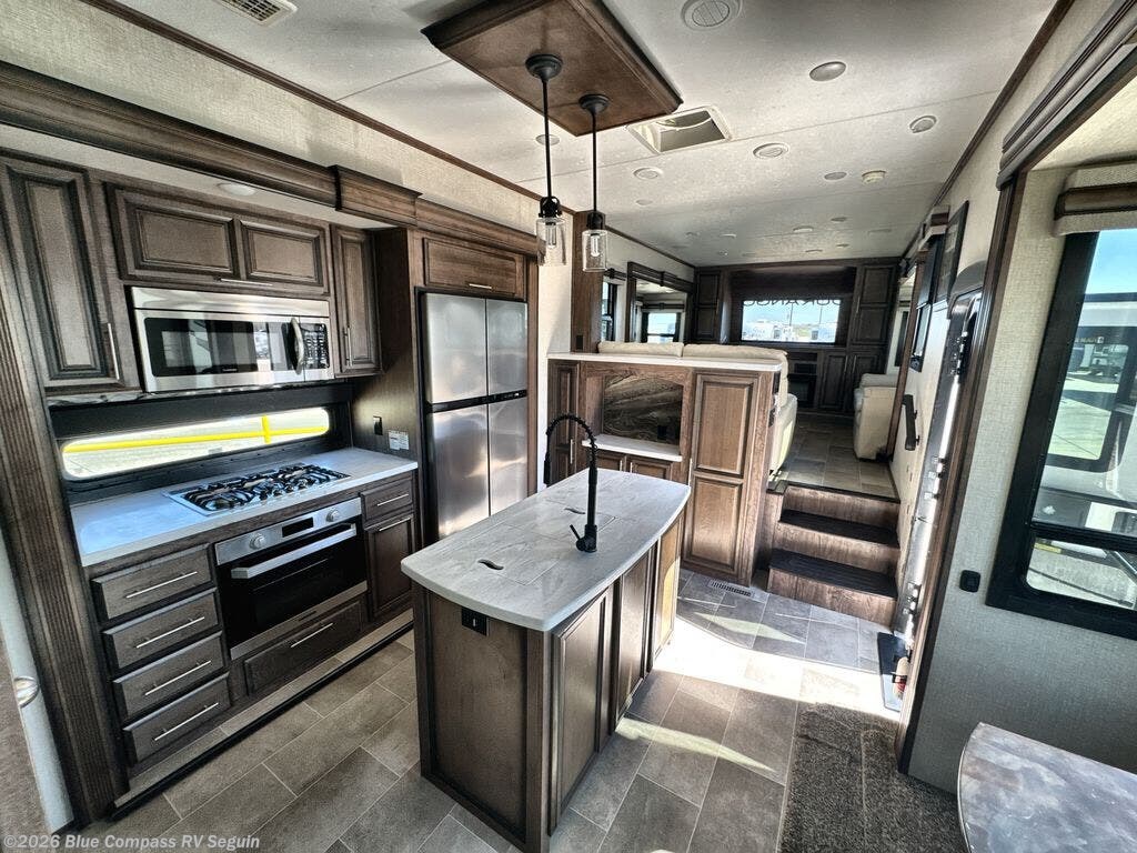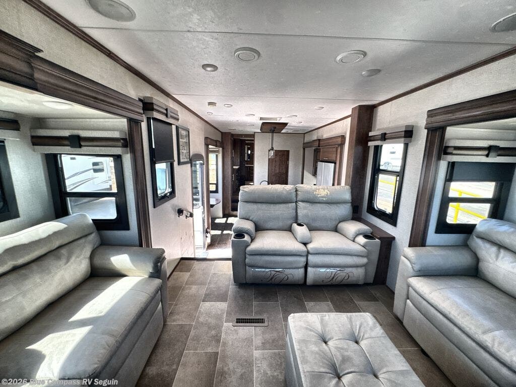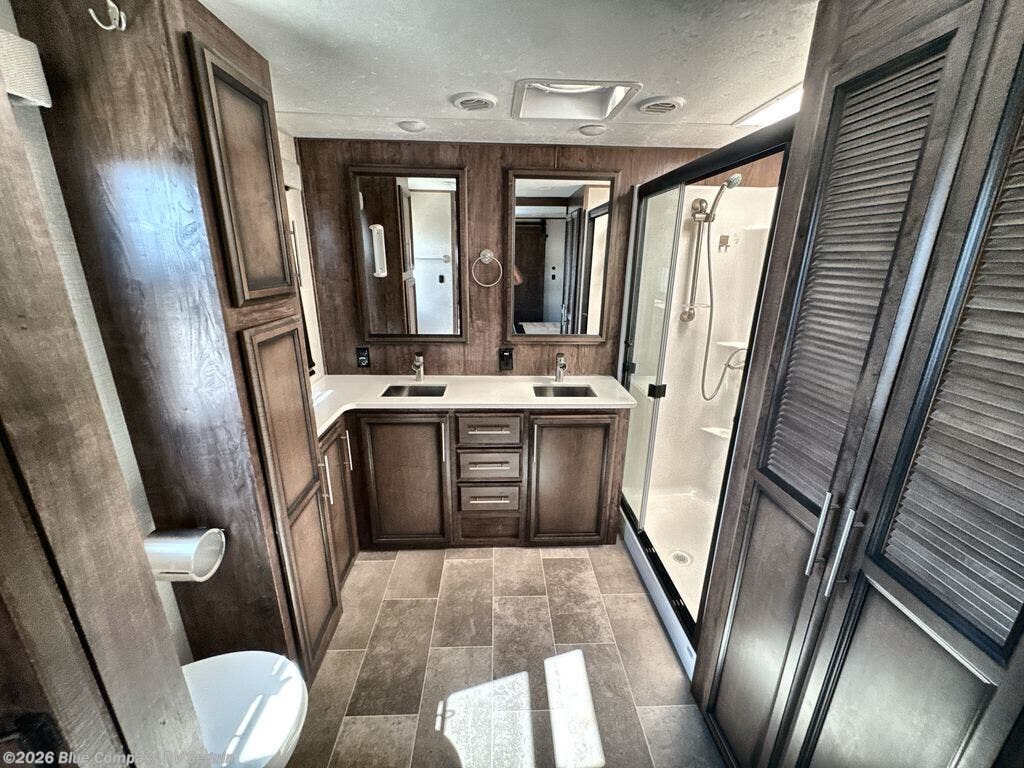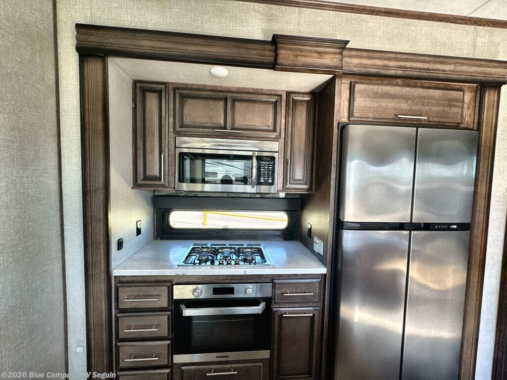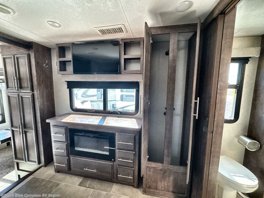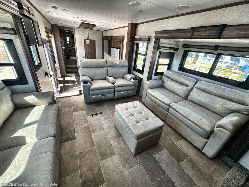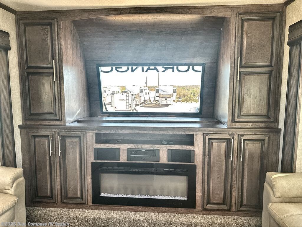 Step inside this fifth wheel to experience true luxury and at-home comforts. The front entertainment/living area will be perfect for the grandkids since there are two hide-a-bed sofas and the theater seats sit directly across from the 65" LED TV. There is even a 40" fireplace below the TV that creates an inviting living space. The chef of the family can prepare all the meals on the three burner cooktop or in the convection microwave and the 18 cu.ft. refrigerator and the hutch/pantry can hold all the perishables and dry goods. Head to the back of the unit and you'll find the master suite with a walk-around electric tilt king bed, a dresser with hidden storage, a fireplace, plus dual bath sinks in the rear bathroom. There is even a residential shower with a seat and a place that has been prepped to add a washer and dryer. Now that's what I call luxury!