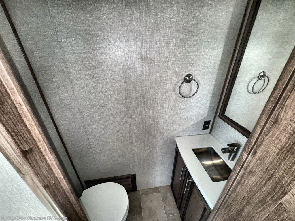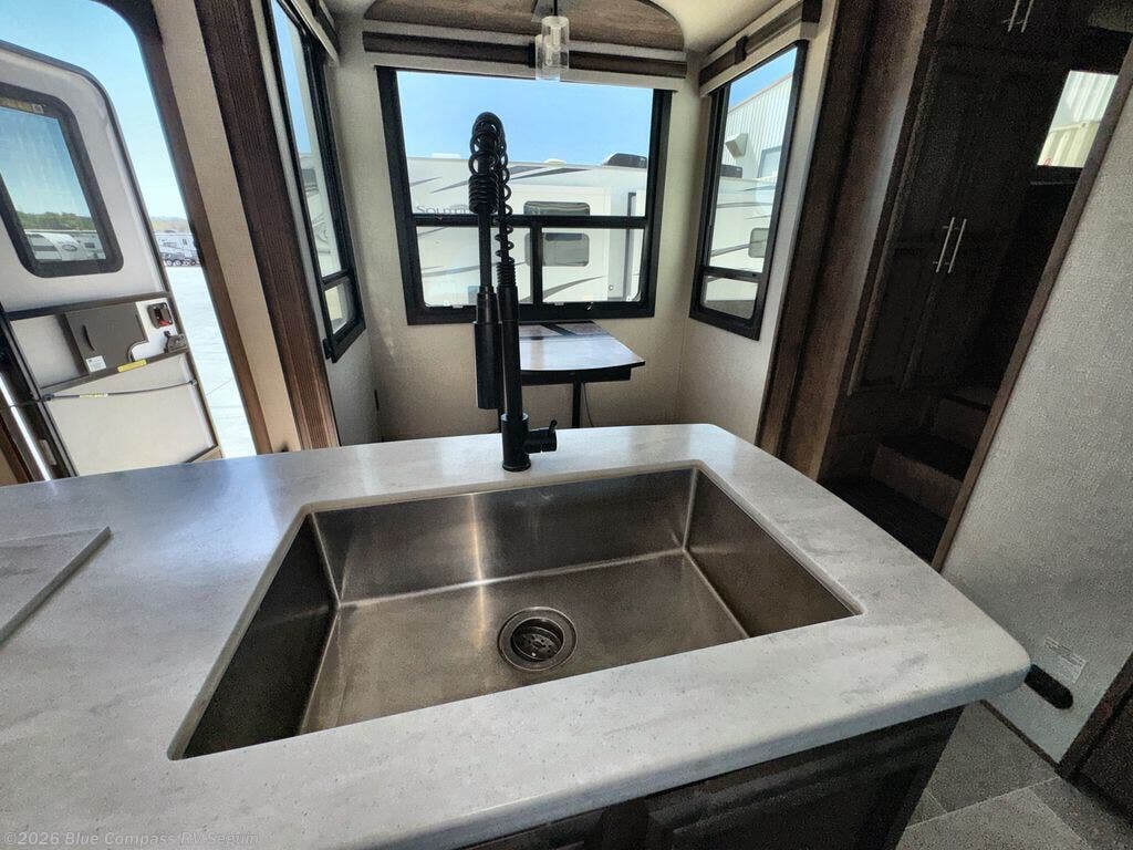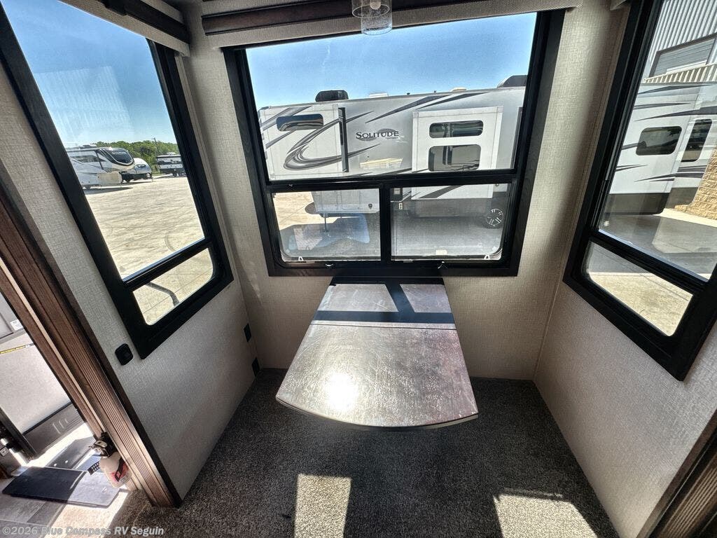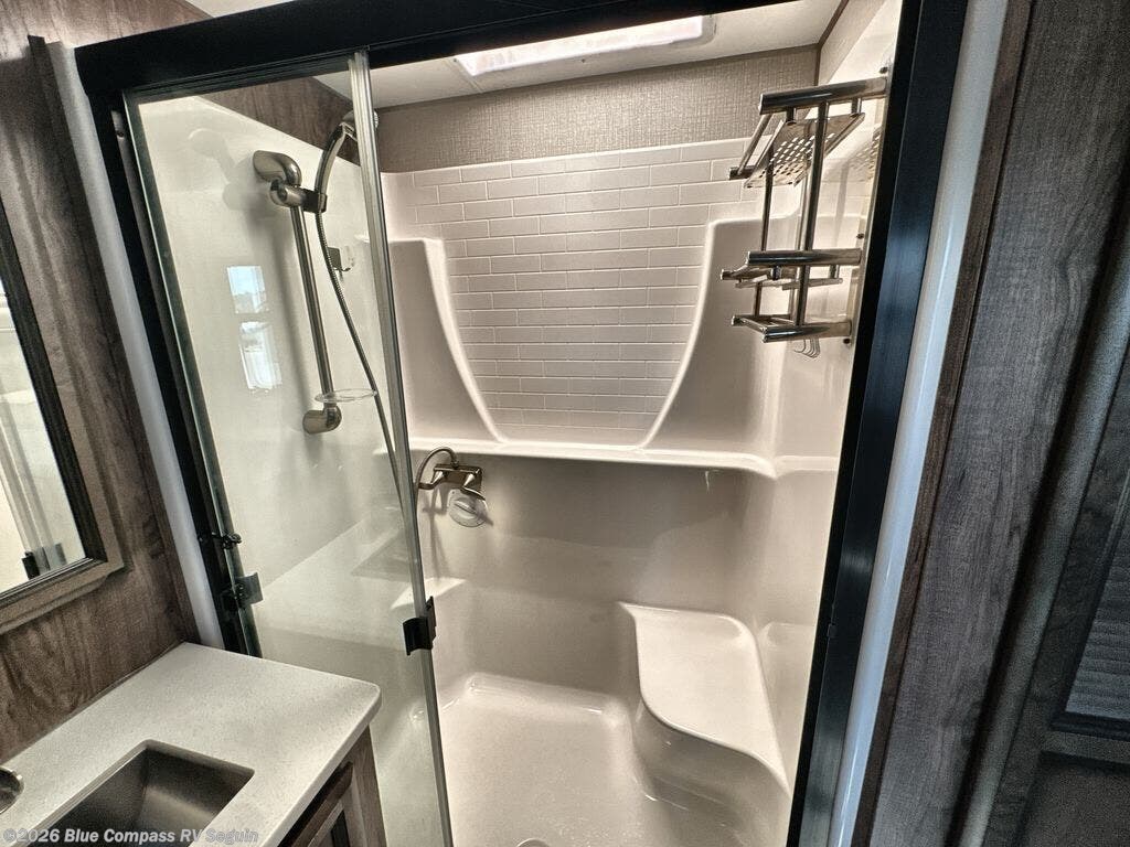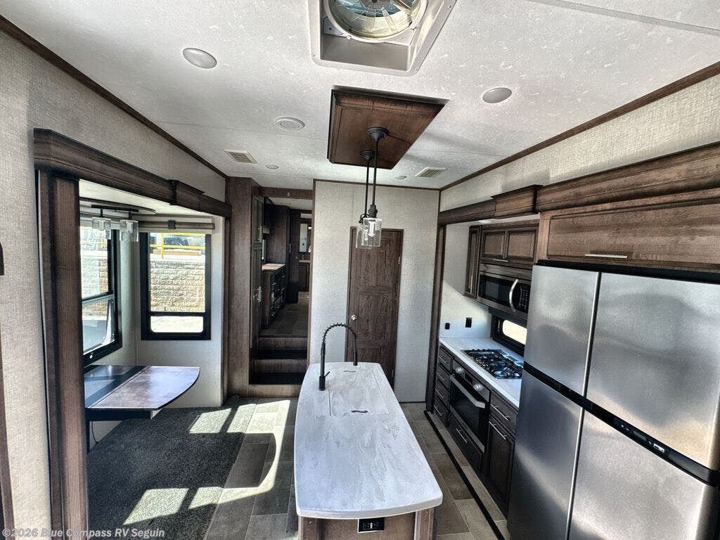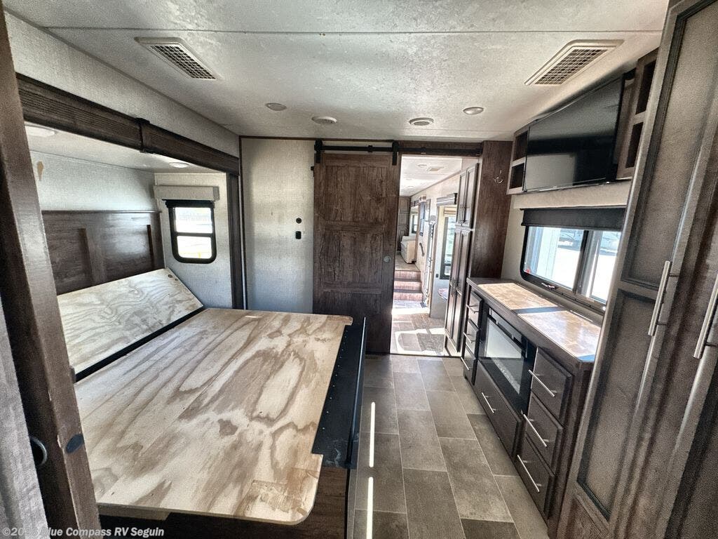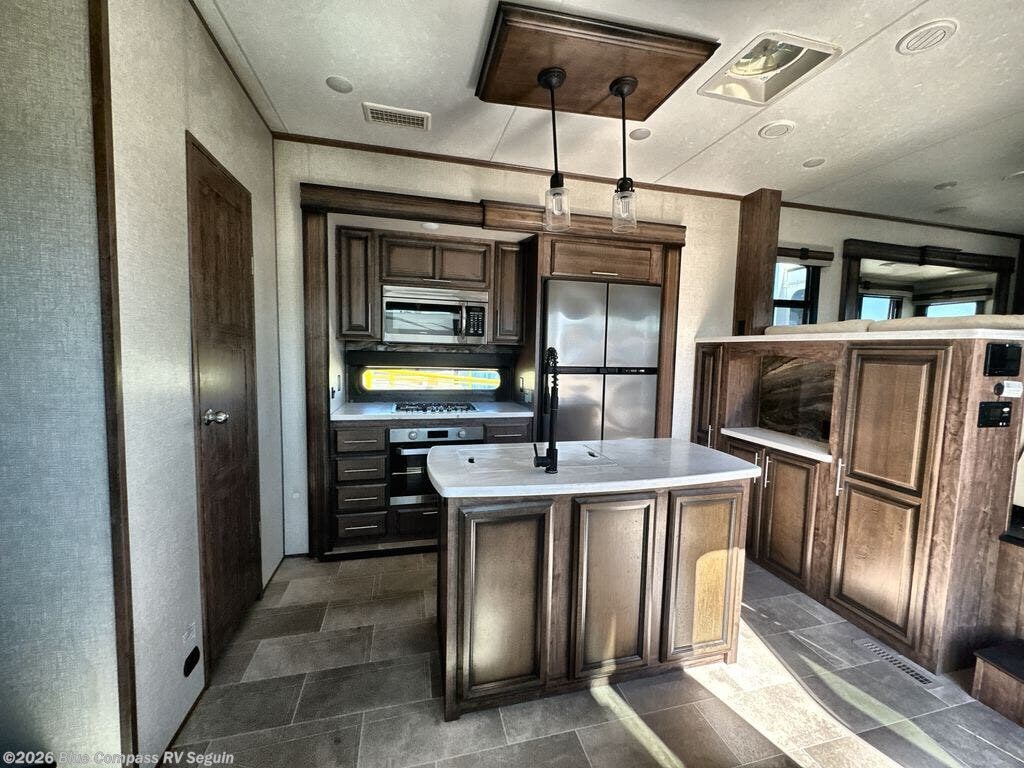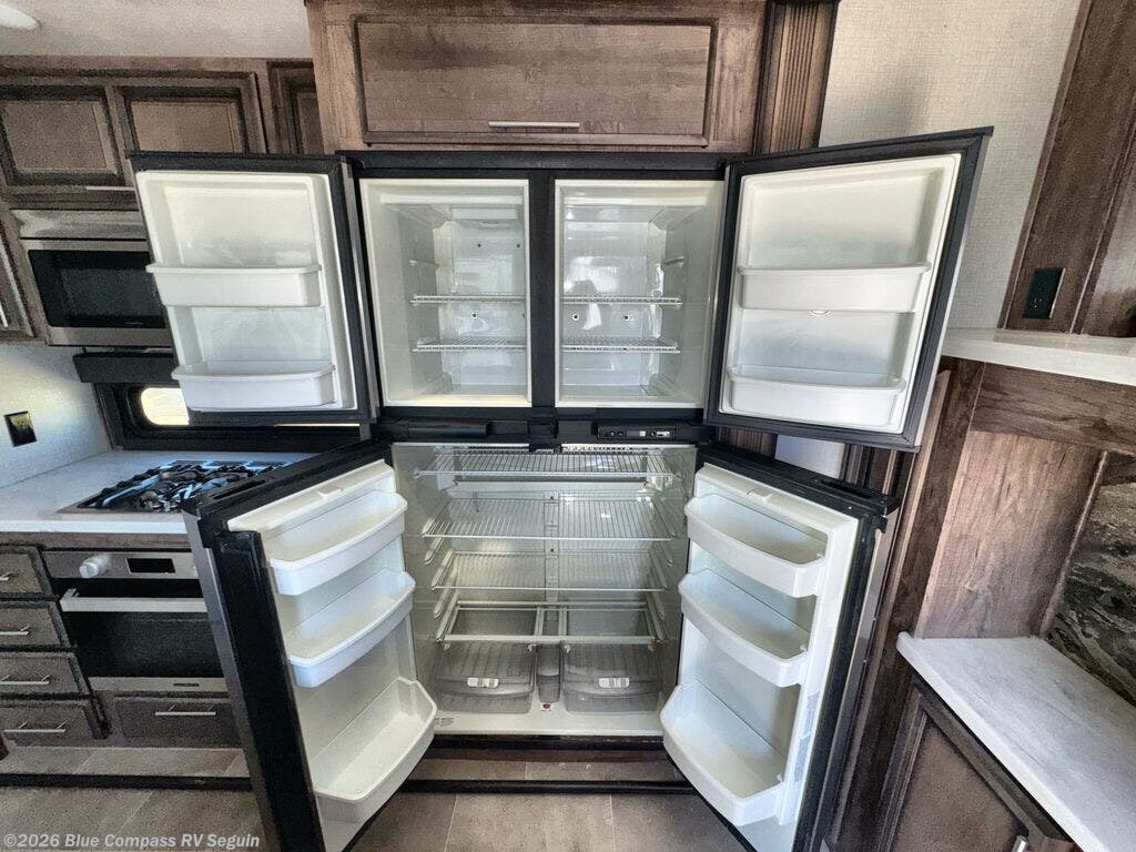 Step inside this fifth wheel to experience true luxury and at-home comforts. The front entertainment/living area will be perfect for the grandkids since there are two hide-a-bed sofas and the theater seats sit directly across from the 65" LED TV. There is even a 40" fireplace below the TV that creates an inviting living space. The chef of the family can prepare all the meals on the three burner cooktop or in the convection microwave and the 18 cu.ft. refrigerator and the hutch/pantry can hold all the perishables and dry goods. Head to the back of the unit and you'll find the master suite with a walk-around electric tilt king bed, a dresser with hidden storage, a fireplace, plus dual bath sinks in the rear bathroom. There is even a residential shower with a seat and a place that has been prepped to add a washer and dryer. Now that's what I call luxury!