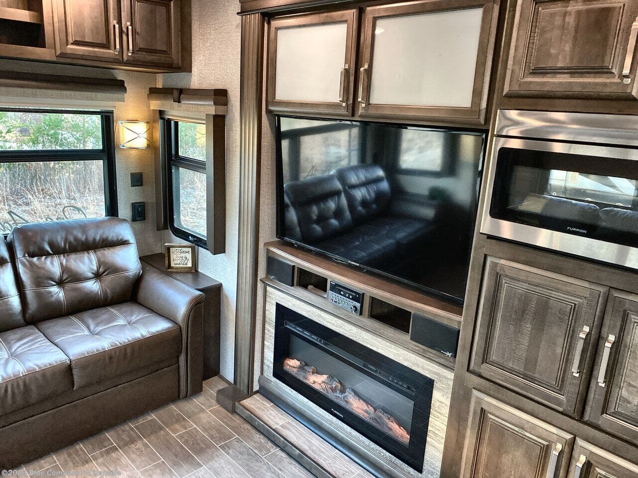 Are you ready for a cozy weekend away with this Alpine fifth wheel at your favorite destination? Throughout this model, you will enjoy all of the livable space that comes from three slides. When the night gets chilly, grab a blanket and a book and relax on the theater seating or sofa sleeper in front of the warm fireplace or watch your favorite movie on the 50" LED TV. As you wait for dinner to be prepared on the three burner range, you can grab a snack from the 18 cubic foot residential refrigerator and sit at the free-standing table with chairs as you chat with the chef. With its own bathroom entrance, a vanity, and a king bed, the master suite proves to be the most relaxing and comfortable place to spend each night.