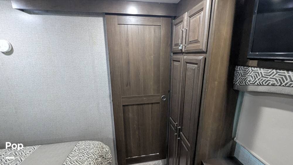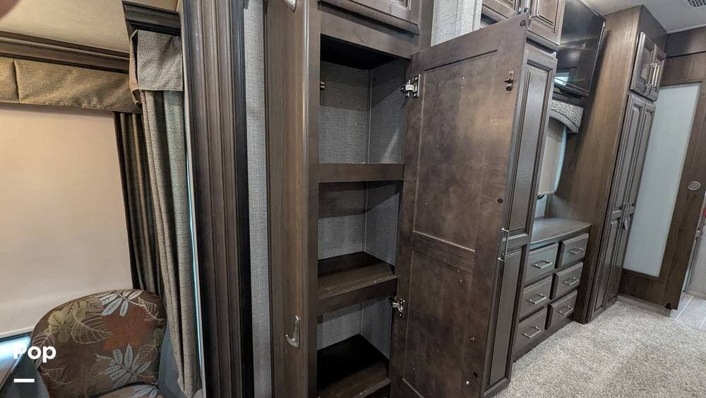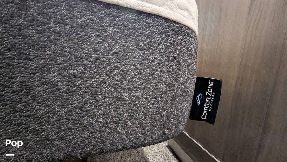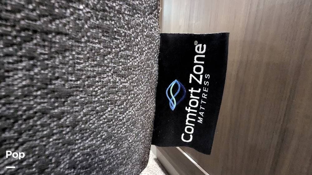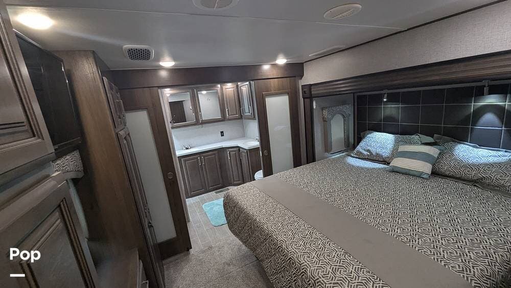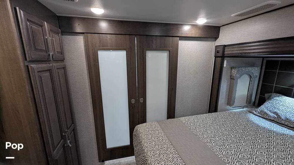 The bedroom features a king-sized bed with a mattress upgrade to "Comfort Zone" memory foam and also includes a his-and-hers closet with six drawers situated below a TV that can be easily viewed from the bed.