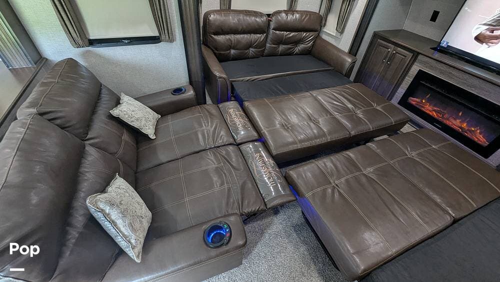 Watch your favorite movies in front of the coach, lounging on the tri-fold sleeper sofas and Theatre Recliners, watching the entertainment center 50" TV with speakers and an electric fireplace.
