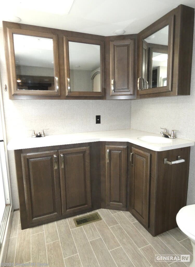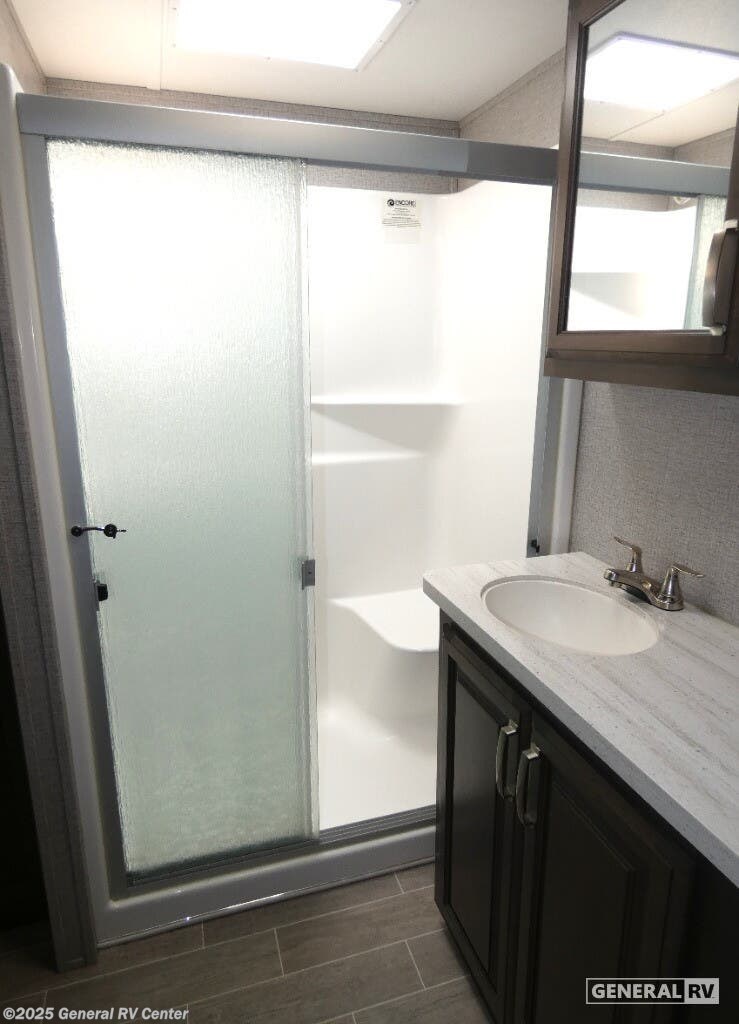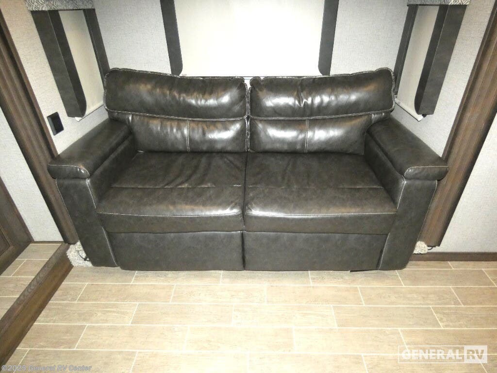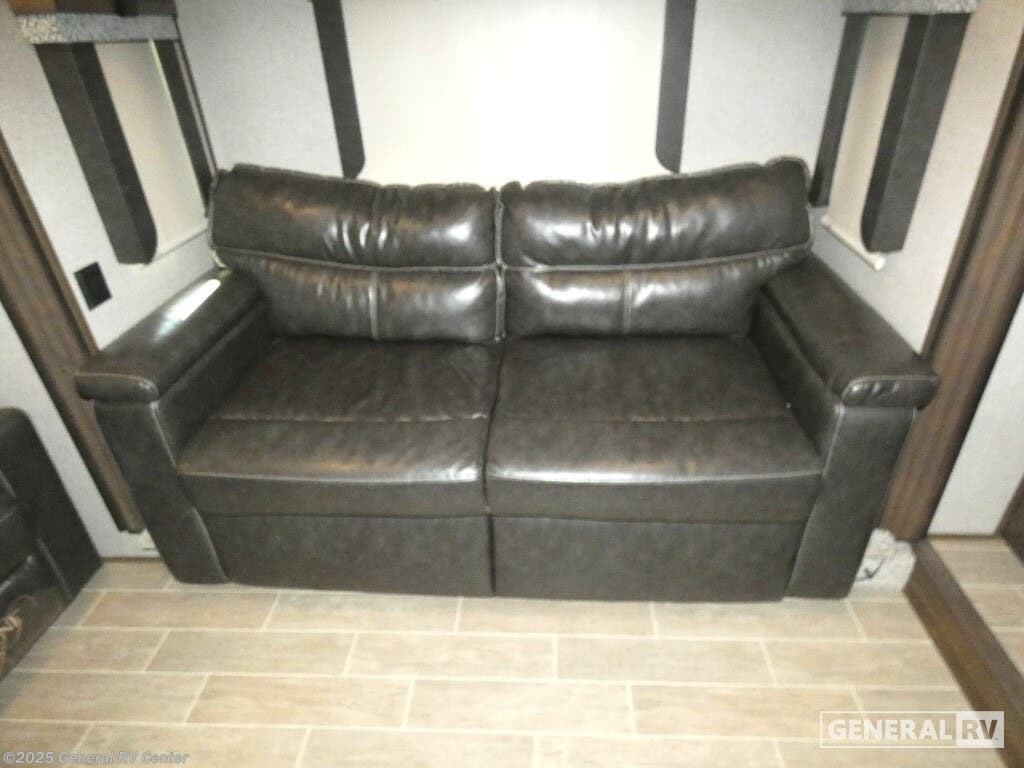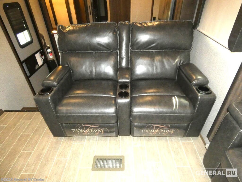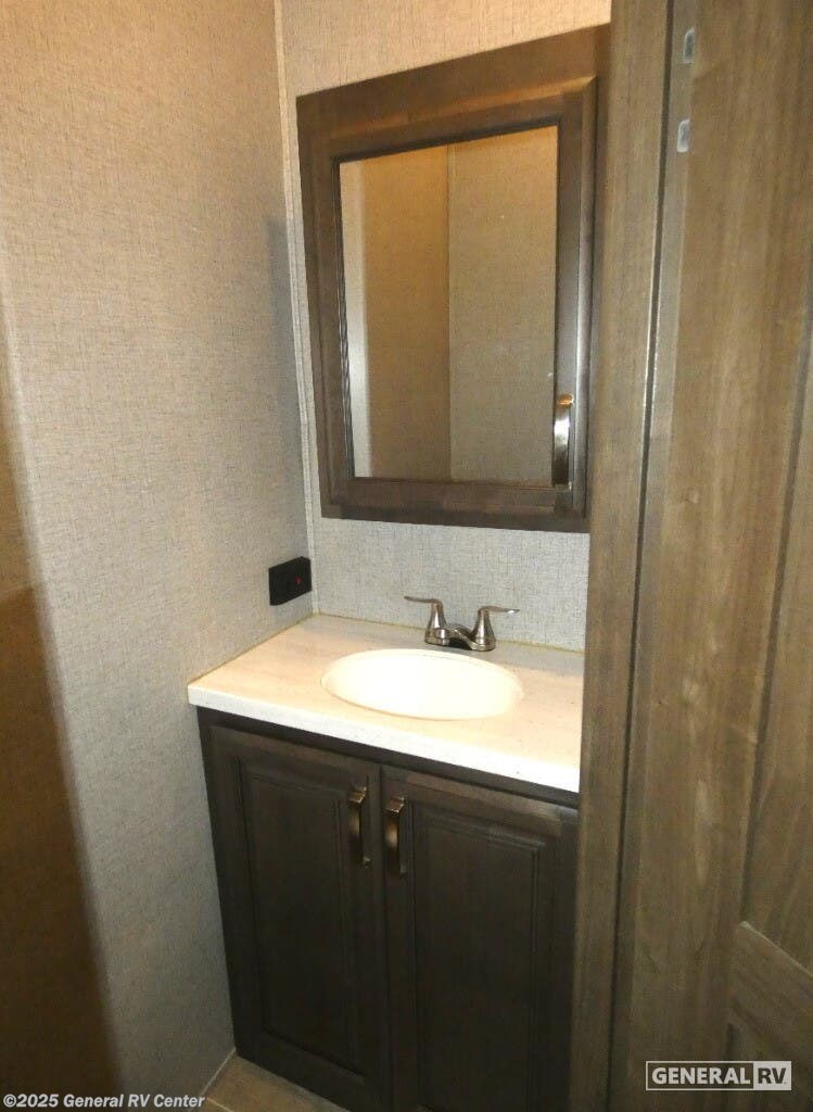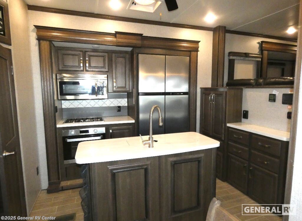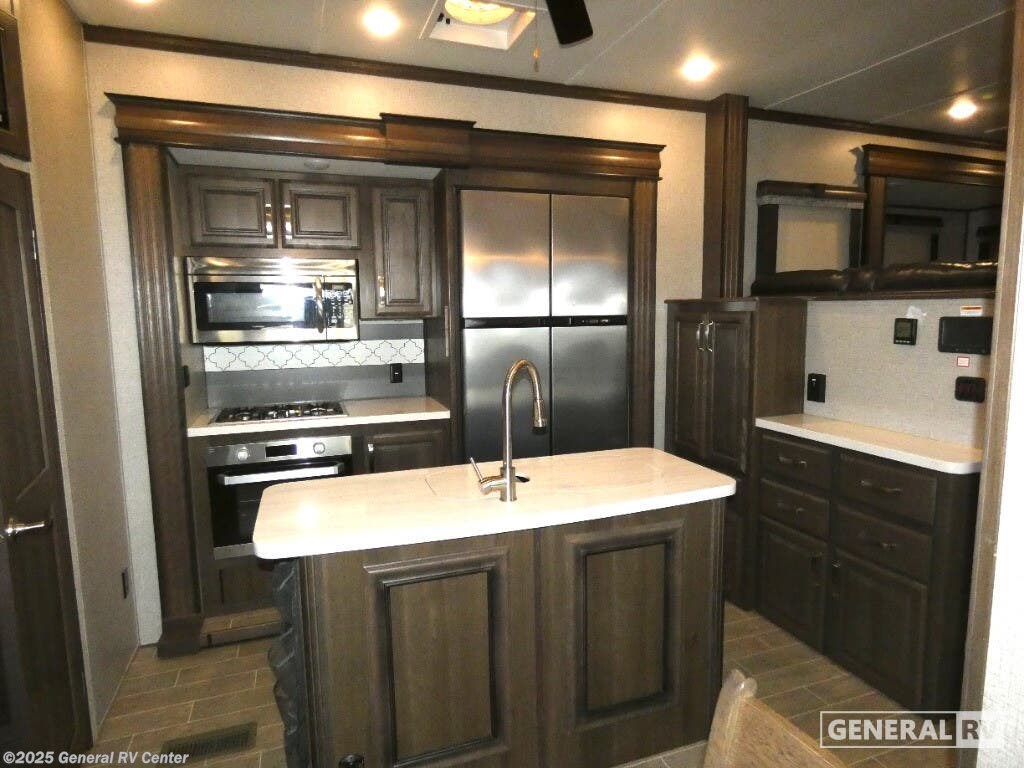 Come see just how fun and easy camping can be with this luxurious five-slide Alpine fifth wheel by Keystone RV. Getting ready for the day is easy with a large master bathroom that has two sinks, plenty of counter space, and a shower. You'll find the second half bathroom is conveniently located just off of the kitchen for your guests. In the kitchen area, you will find dual opposing slides and all of the amenities you need to fix your favorite meals, such as a convection microwave, and an 18 cubic foot refrigerator. Step up to the front living room where you will find two tri-fold sofa sleepers, theater seats, a fireplace, and an entertainment center with a 50" LED TV. When you choose an Alpine fifth wheel by Keystone RV, you are choosing luxury. The Whisper Air System is the quietest cooling system ever developed, and it keeps your RV at the perfect interior temperature no matter what the outside weather may bring. Every aspect of the Alpine has been designed to enhance your full-time camping experience, like the Super Cinema package, and the all-in-one water works exterior utility center will help you keep your Alpine flowing at its best throughout each adventure. You will also love the Furrion RV Chef Collection that gives you the ability to cook with precision and consistency as you travel the country and helps you provide your guests with a higher level of cuisine during each camping trip.