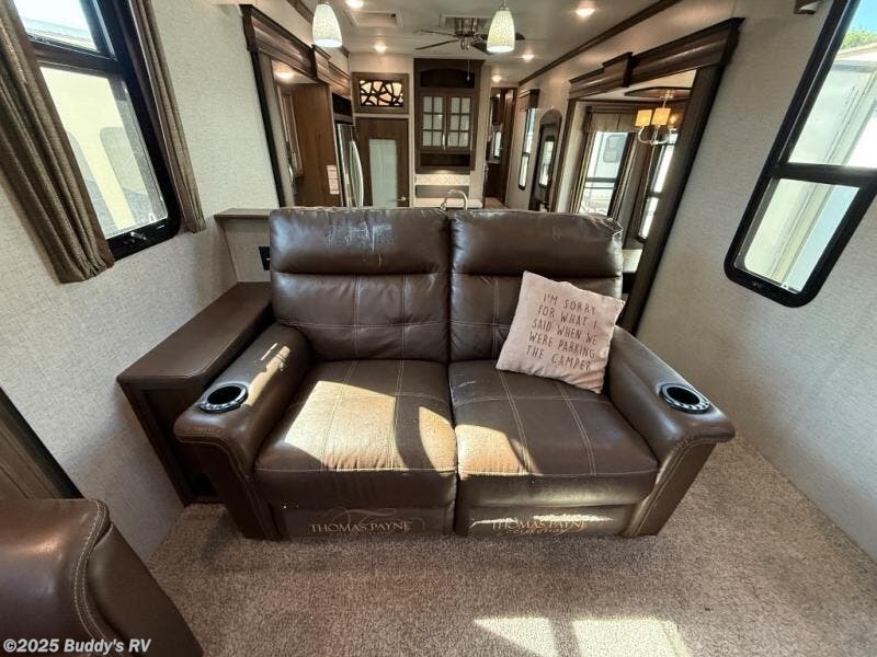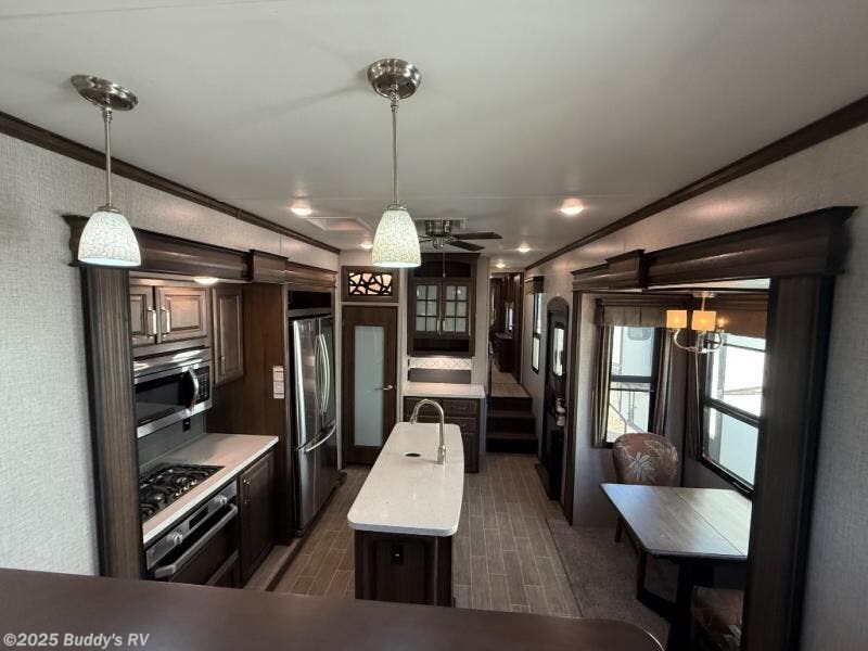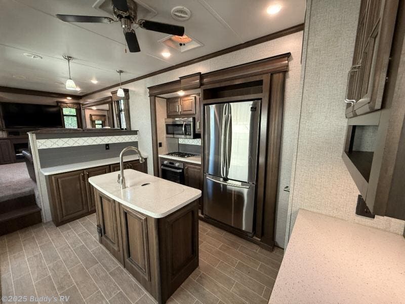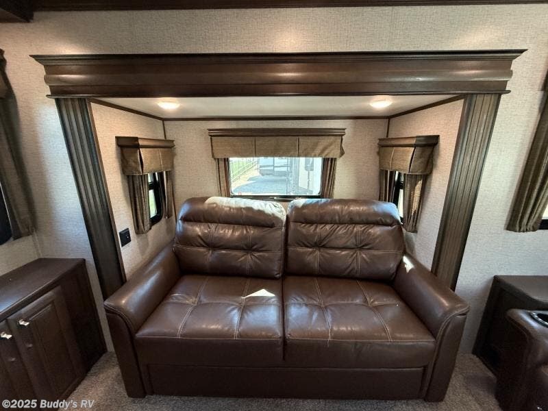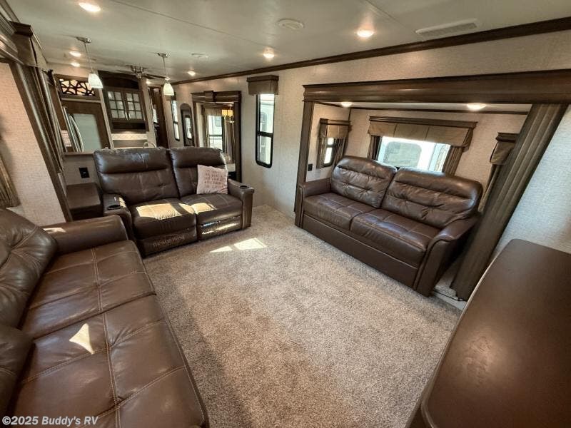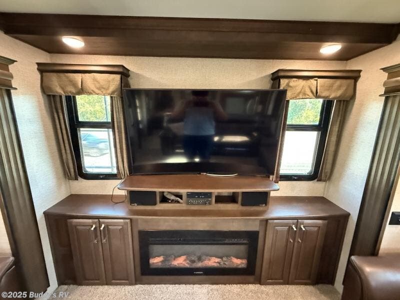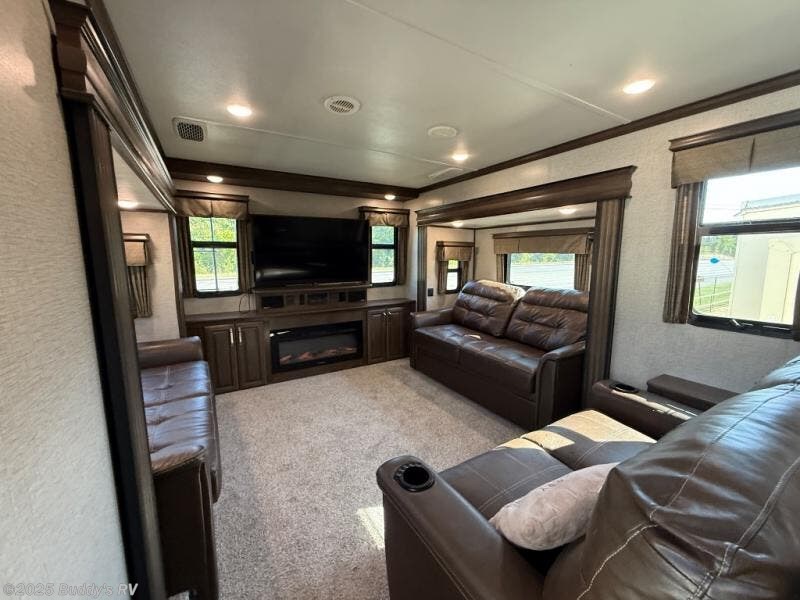 This fifth wheel is perfect for the family of six to eight seeking fun and relaxation. You'll be pleased with all the features this unit has to offer, including two tri-fold sofas the kids will love, a front bedroom with a king bed and a master closet, and theater seating to make you feel right at home. Enjoy an evening by the fireplace or play a game at the free standing dinette. This model has five slides, giving ample space to move about. You will appreciate the kitchen with a 18 cu.ft. residential refrigerator with an icemaker, a convection microwave, and a kitchen island. This fifth wheel has a unique under the deck storage that is beneath the rear entertainment/living area, and a 17' awning for those evenings you grill out and have s'mores by the campfire. Why wait? Adventure is calling your name!