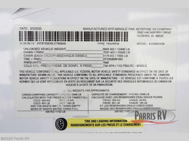 Request More Info on this 2020 Keystone Avalanche 338GK Offered for sale by Parris RV