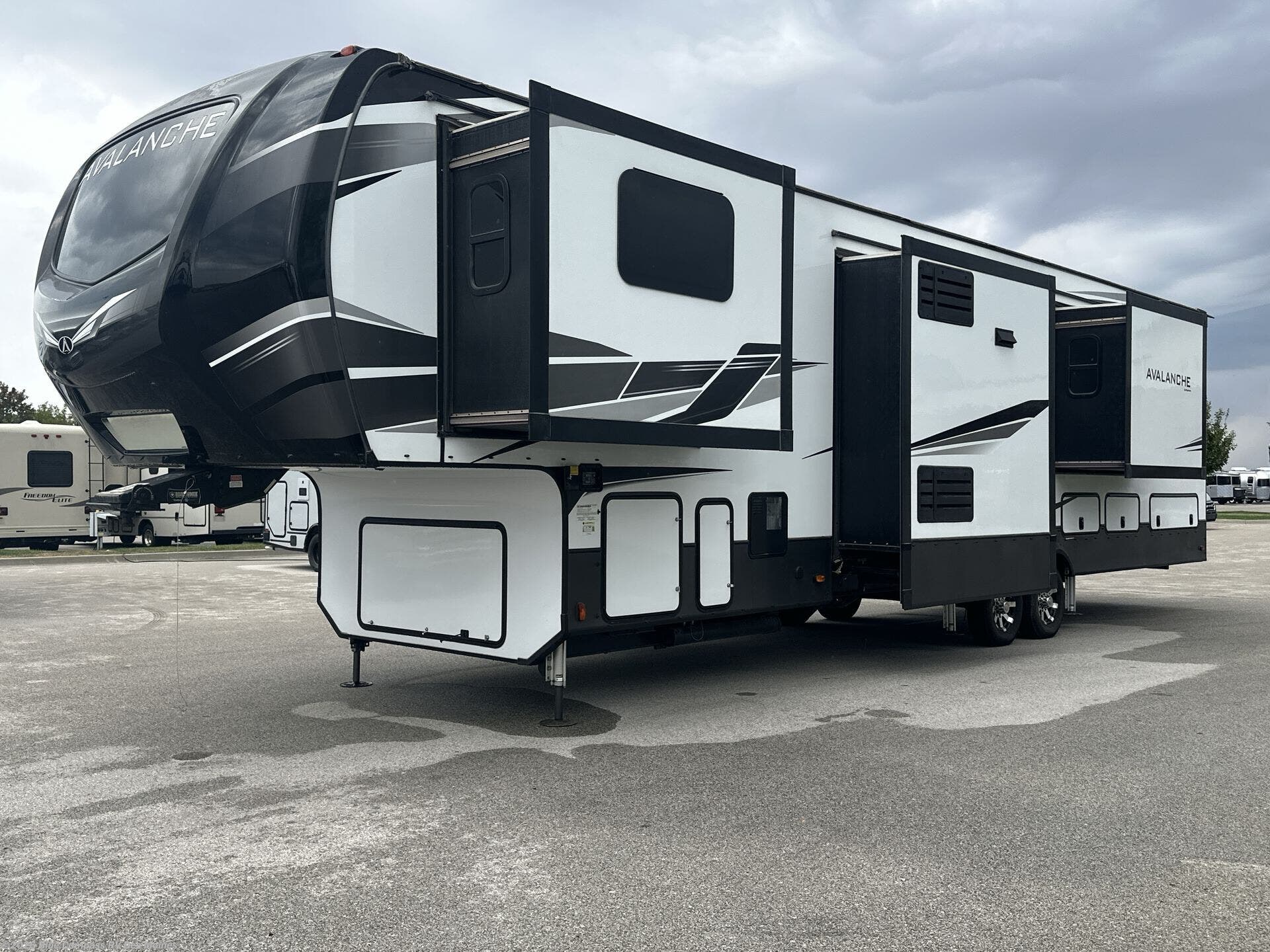 Don't waste another moment on dull adventures when you can have exciting and memorable trips each and every time you take this Avalanche fifth wheel with you to the lake! This marvelous unit has all of the space you need to relax comfortably inside on rainy days with five slides that give you enough room for separate living quarters all throughout. From the rear master suite that contains a king-size bed and large bathroom to the central kitchen/dining area that has a massive pantry which will store any canned good imaginable, you will adore how accommodating and functional every room will be for your family.