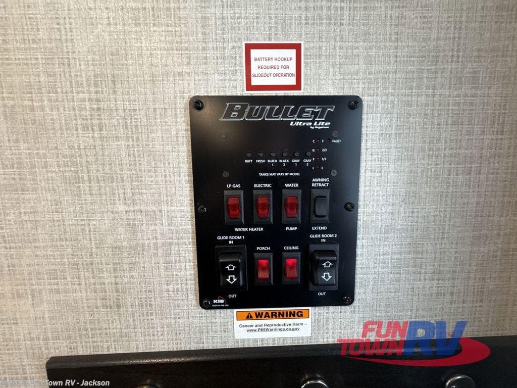 Come see just how fun and easy camping can be with this double-slide Bullet travel trailer by Keystone. When you are playing outside, you will enjoy the convenience of the outdoor kitchen as you grab your favorite cold beverage from the mini refrigerator, and the 19' electric awning with LED lights will give you extra shade when you need to cool off from the sun's hot rays. The inside of this trailer is a hostess' dream with a private bunkhouse that contains one of the two entry doors, as well as its very own half bathroom. Not only will your guests be living in the lap of luxury, but so will you with your very own private master suite.