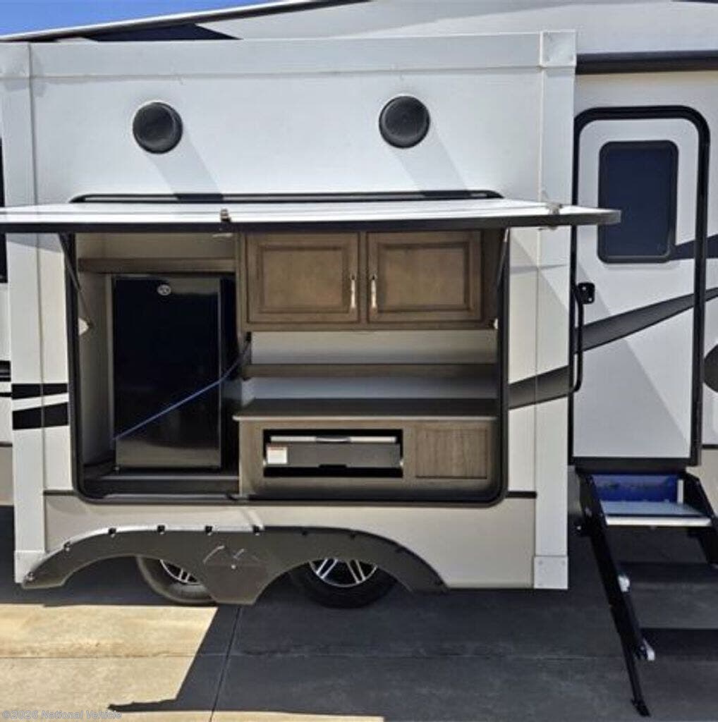 Outside, you?ll find everything you need for easy setup and outdoor living, including front and rear power leveling jacks, a powered awning, exterior kitchen, and slide toppers for added protection. Pass-through storage ensures you can bring all your gear along for the ride.