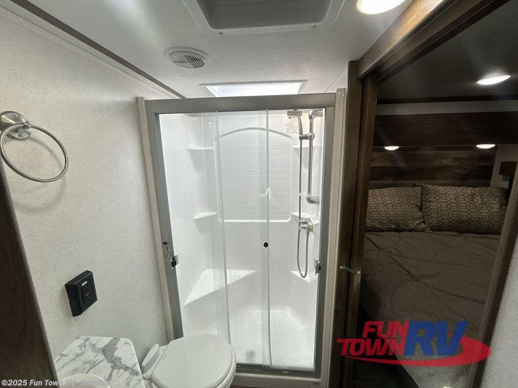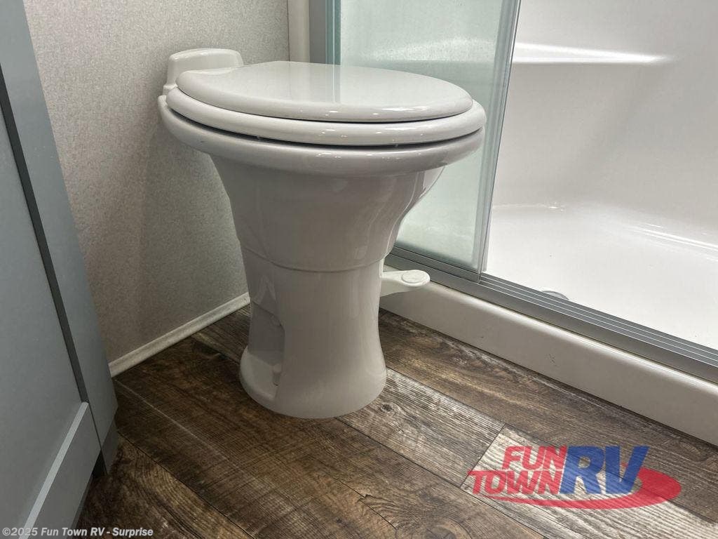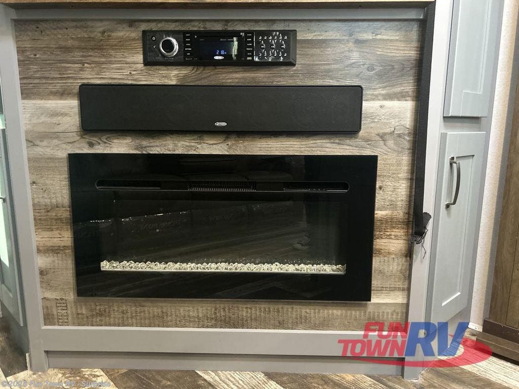 You can't go wrong camping in this toy hauler! There won't be any excuse not to stay clean with the bath and a half. Eating your meals will be comfortable and fun at the center table with four swing out stools to sit on and the slide out sofa is big enough to seat four people or for one to spread out and take a quick afternoon nap. You will also enjoy all of the entertainment inside with the two LED TV's and the fireplace. This model features a front master suite with a slide out queen bed, a master closet, and a space prepped to add a washer and dryer if you choose.