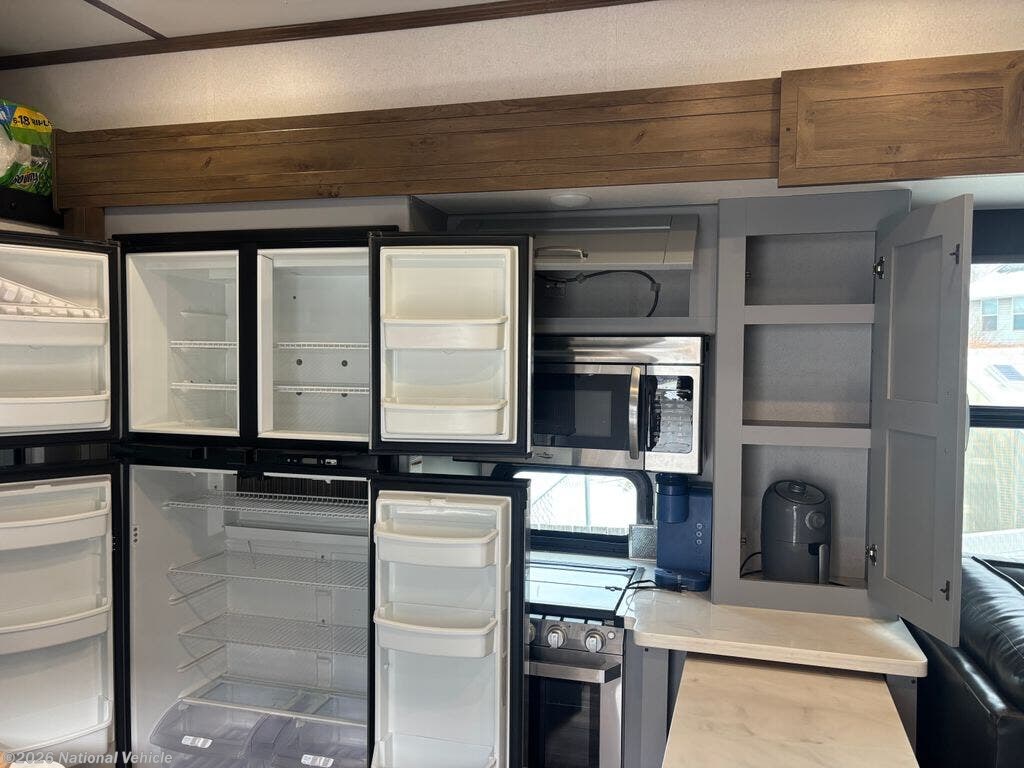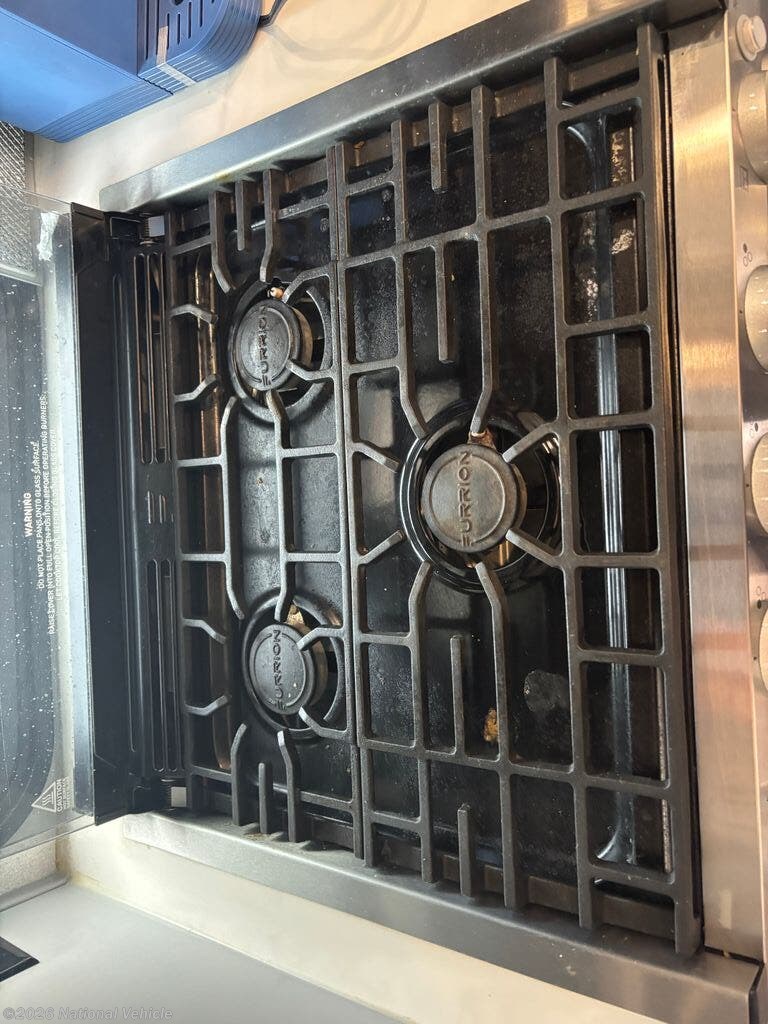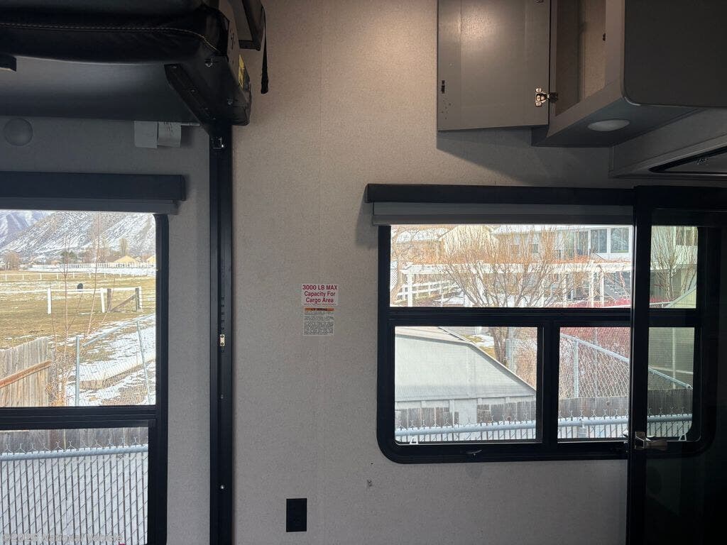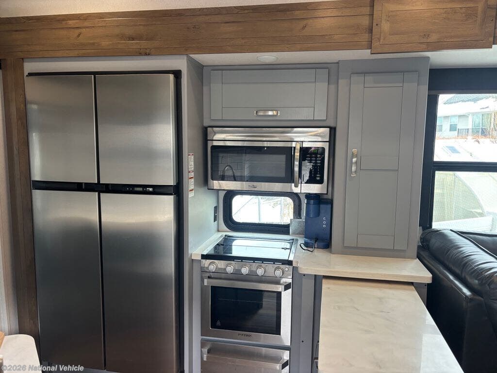 Step inside to experience a thoughtfully designed interior where luxury meets practicality. The spacious living area boasts plush seating, a large entertainment center, and panoramic windows that bring in natural light and scenic views. The gourmet kitchen features solid-surface countertops, a refrigerator, a microwave, a three-burner range, and generous storage - perfect for preparing meals after a day of outdoor excitement.