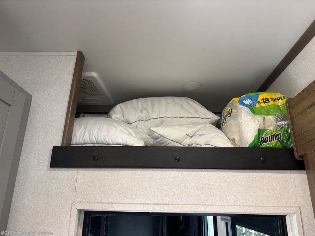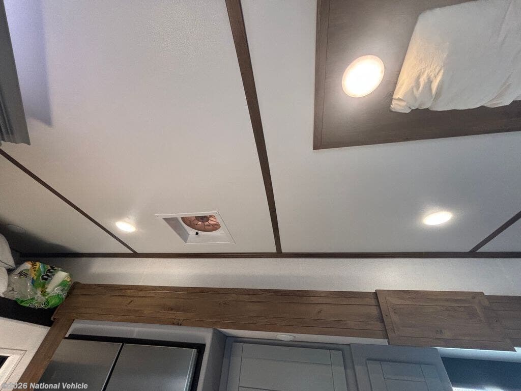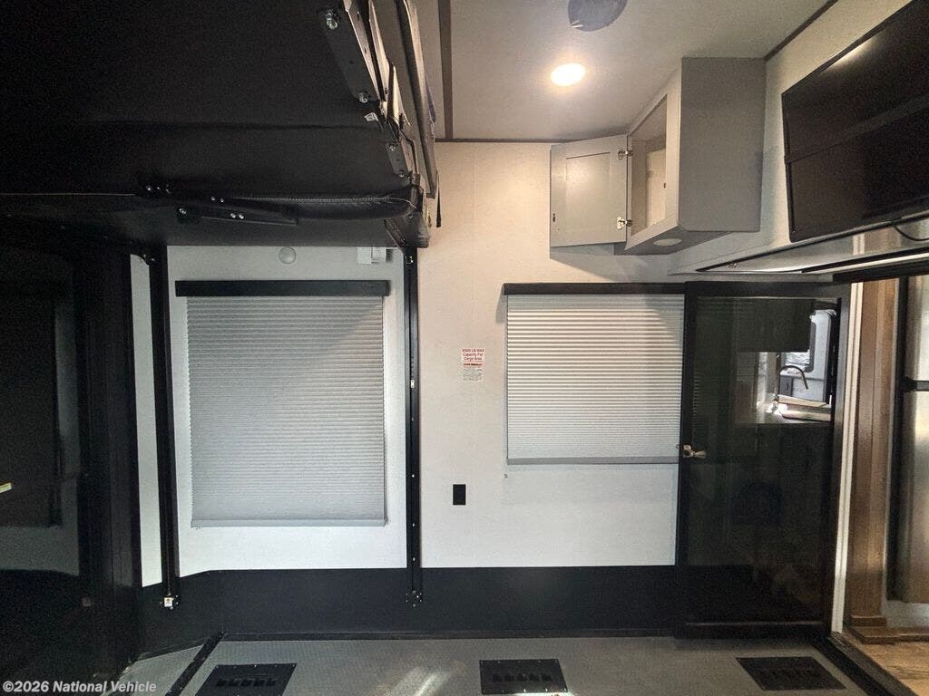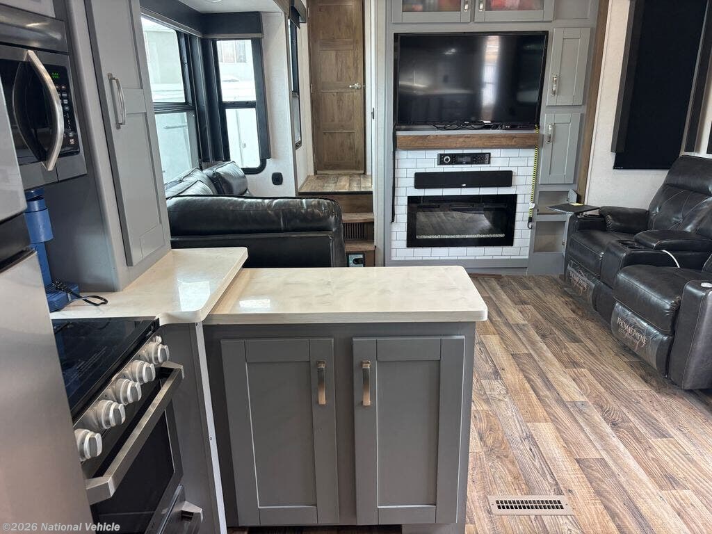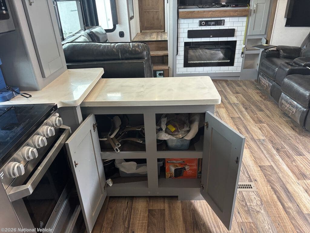 Step inside to experience a thoughtfully designed interior where luxury meets practicality. The spacious living area boasts plush seating, a large entertainment center, and panoramic windows that bring in natural light and scenic views. The gourmet kitchen features solid-surface countertops, a refrigerator, a microwave, a three-burner range, and generous storage - perfect for preparing meals after a day of outdoor excitement.