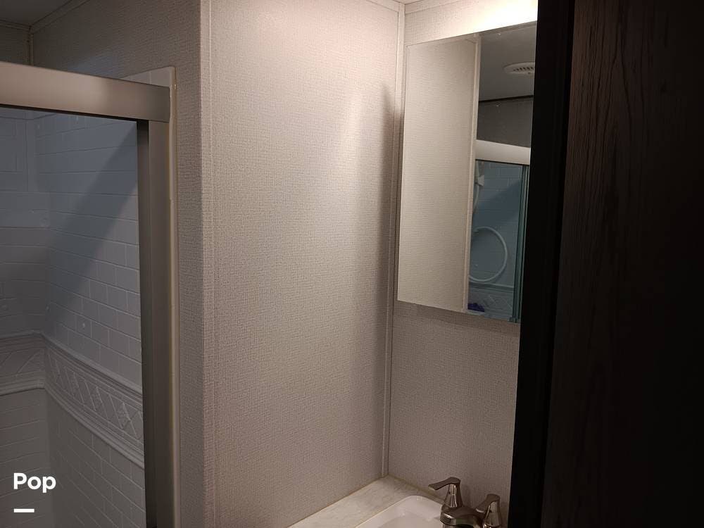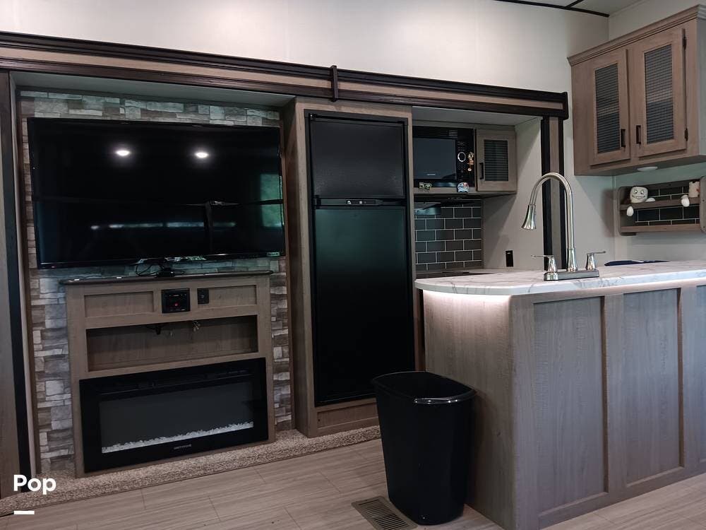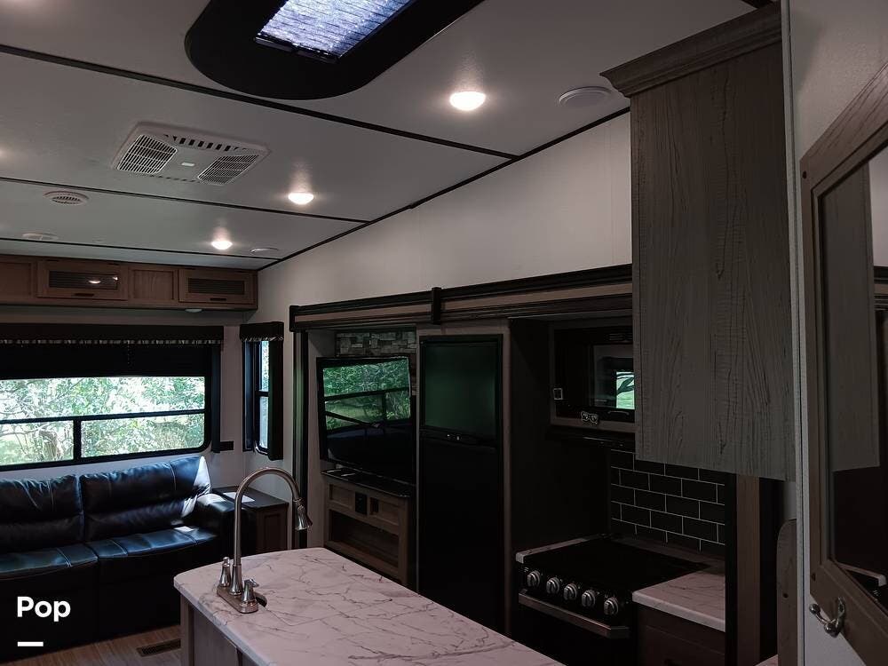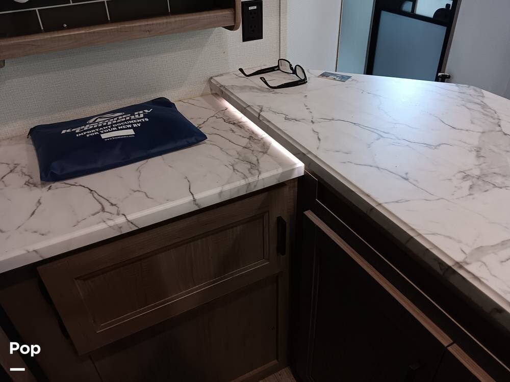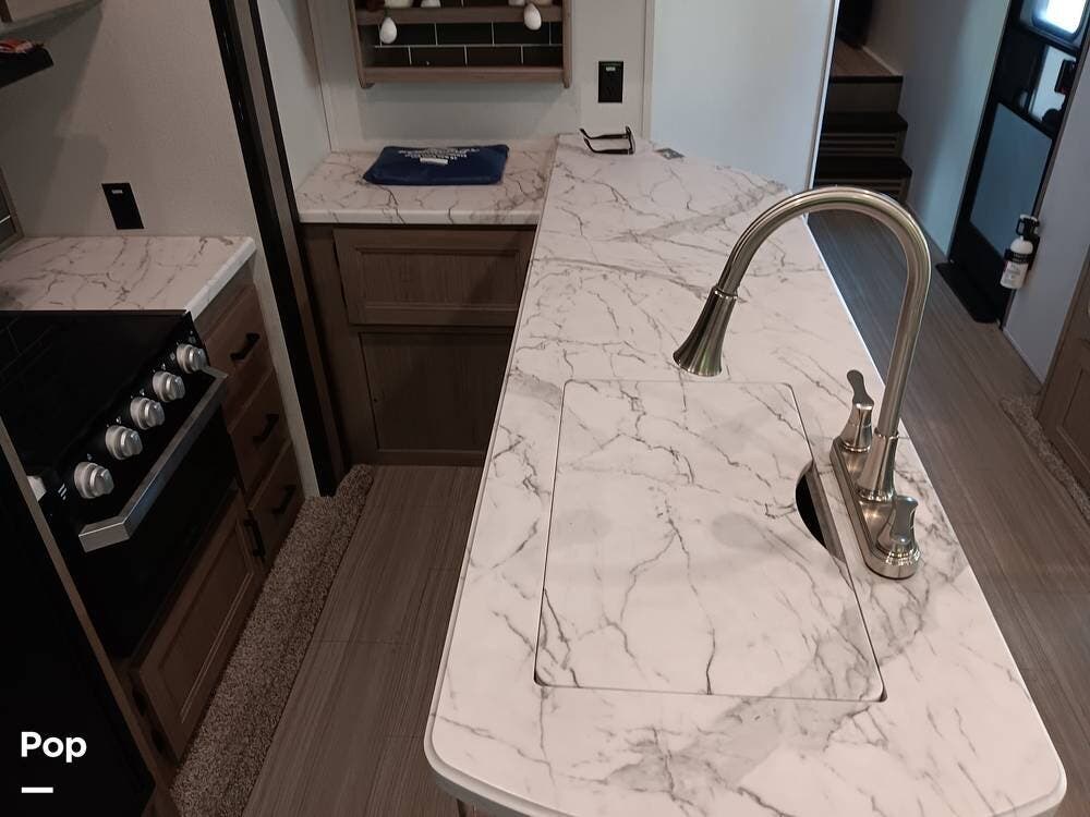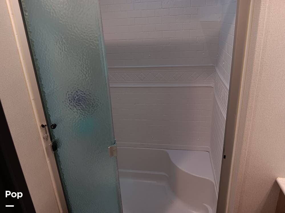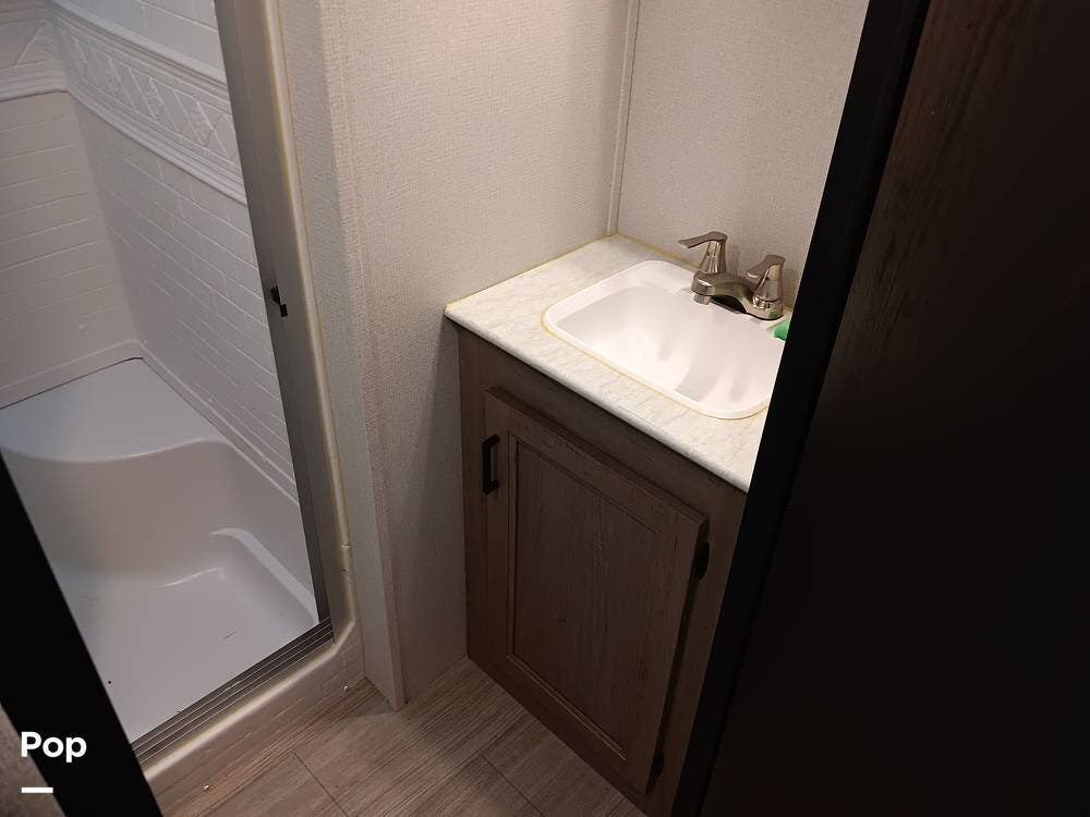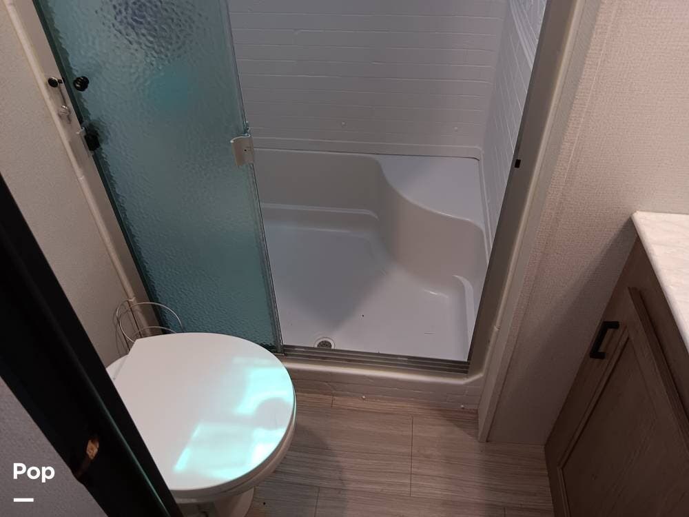 But that's not all--this fifth wheel also boasts a stylish bathroom with a shower and plenty of counter space, ensuring you can freshen up easily.