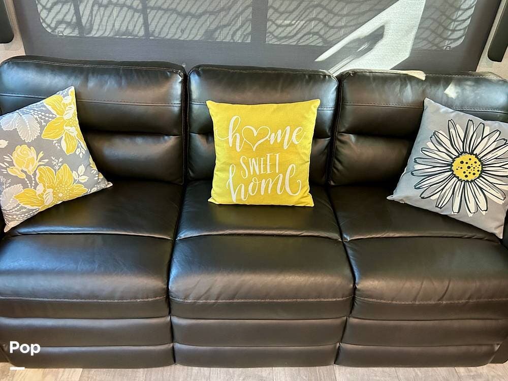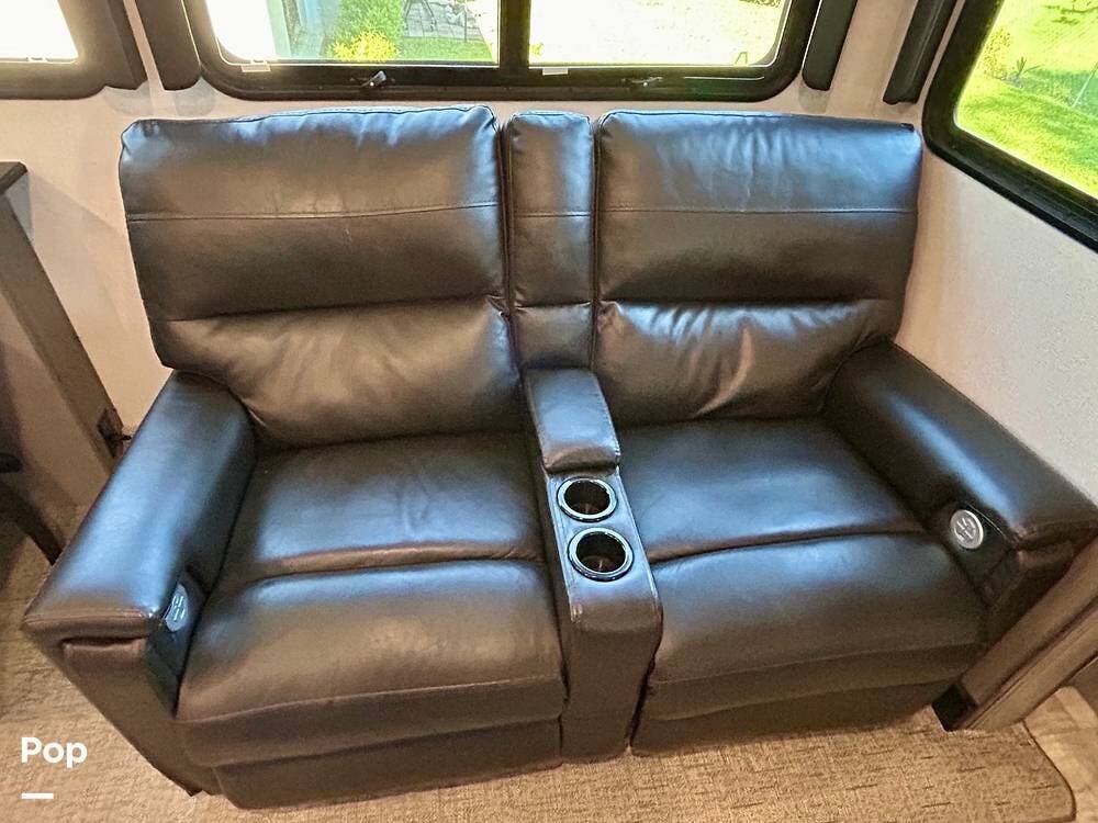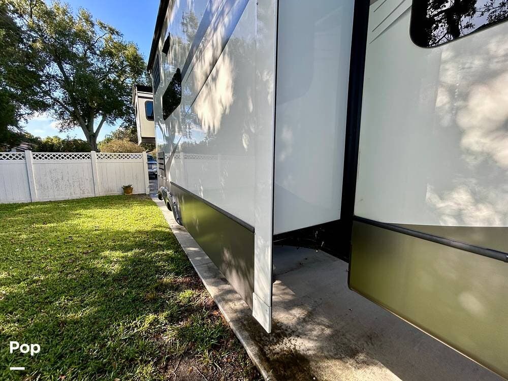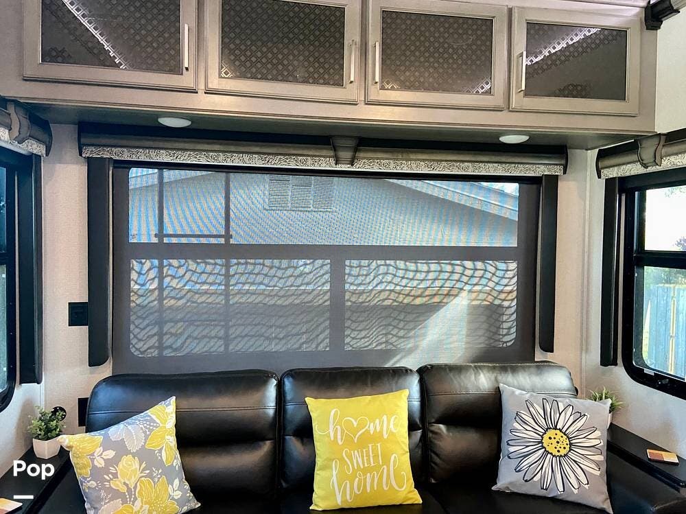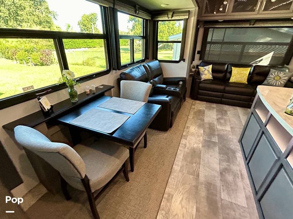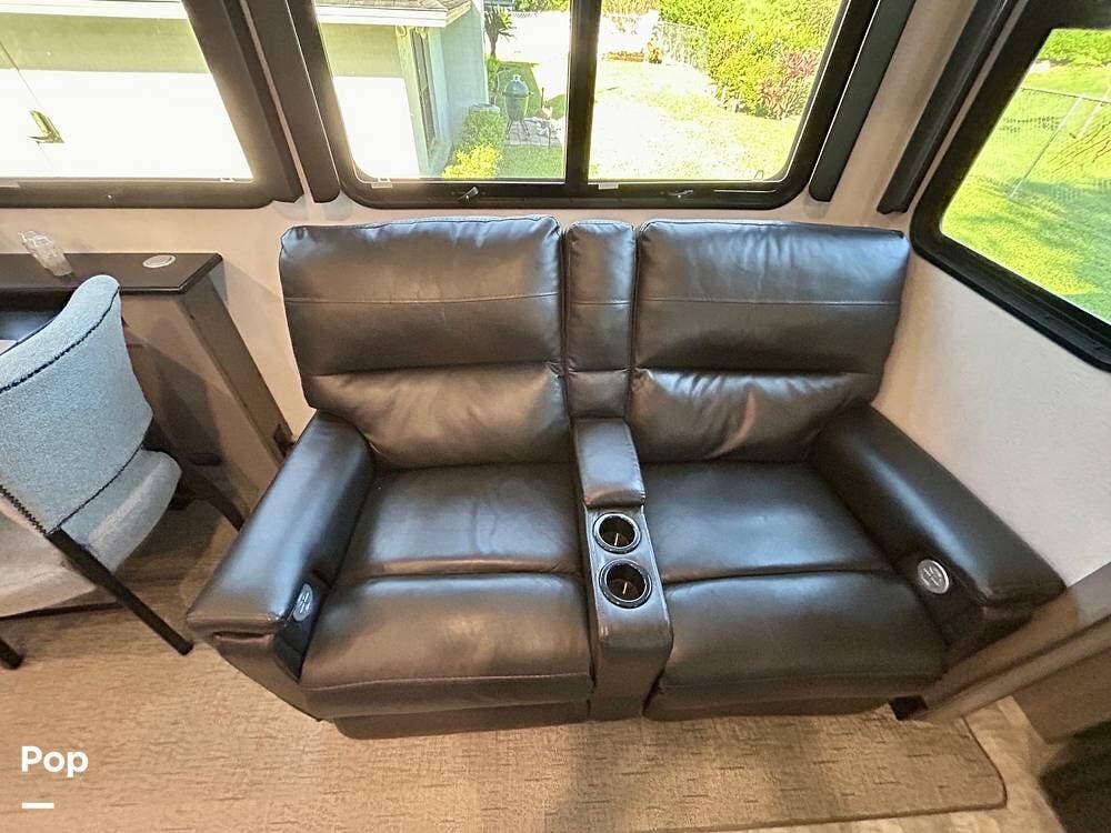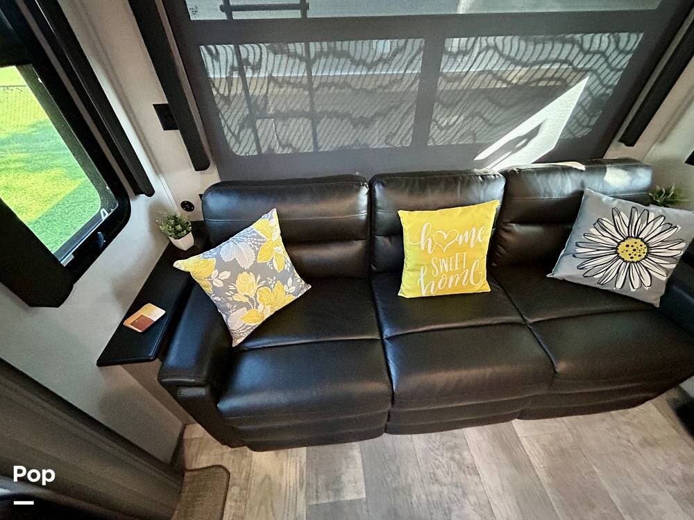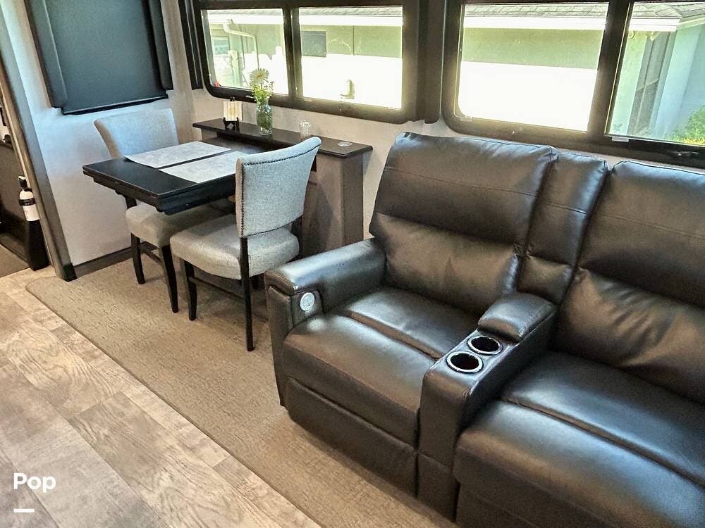The spacious rear living layout features dual opposing slides that open up the main area, creating an inviting atmosphere for entertaining or relaxing. Enjoy the panoramic windows, an electric fireplace, and theater seating that faces a large LED TV.