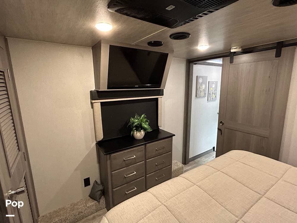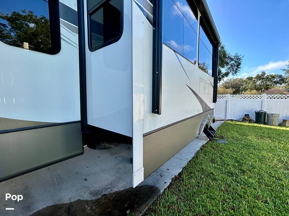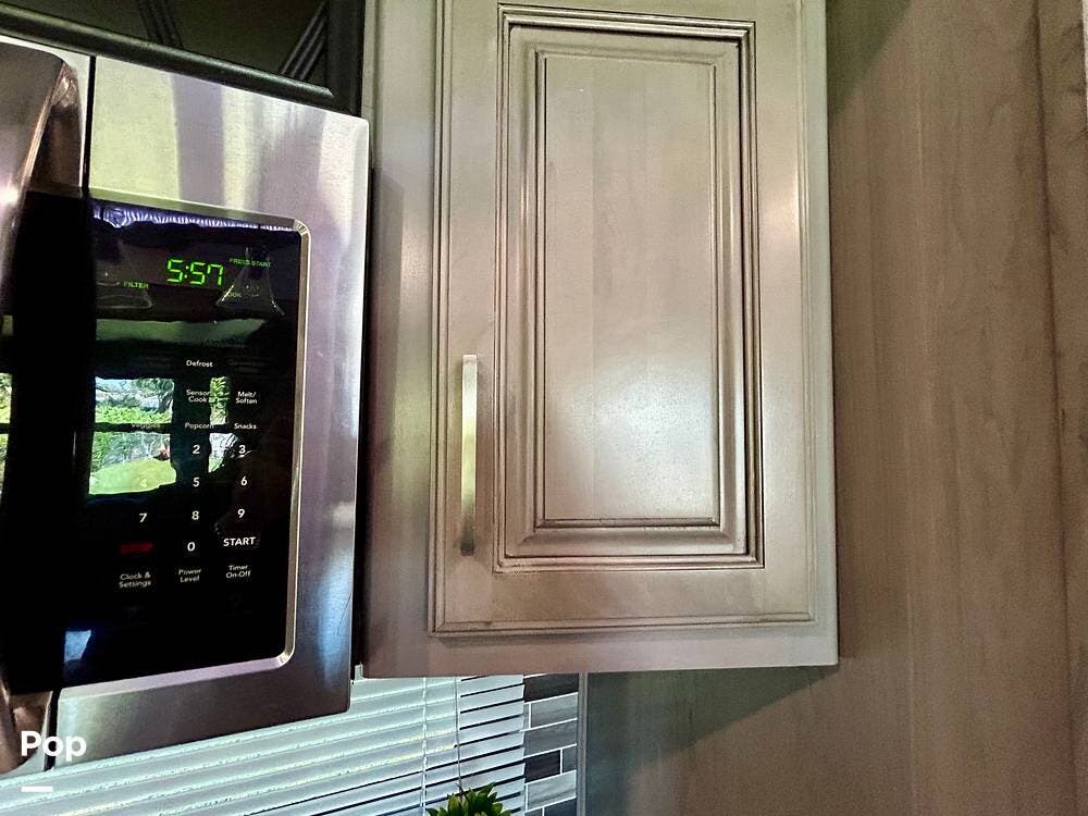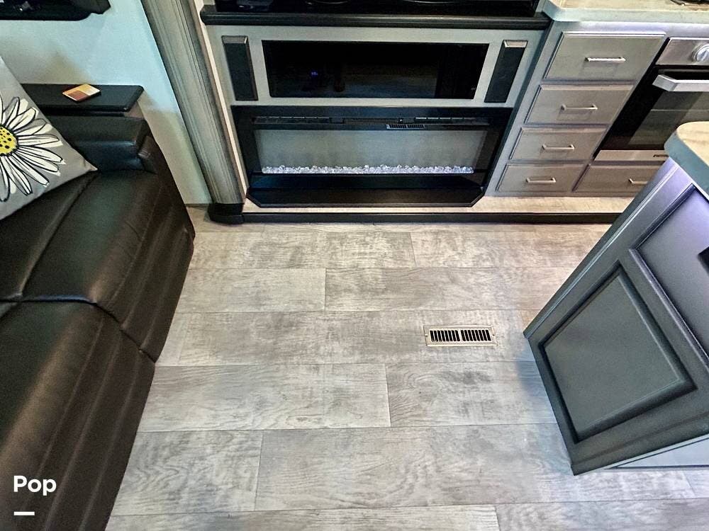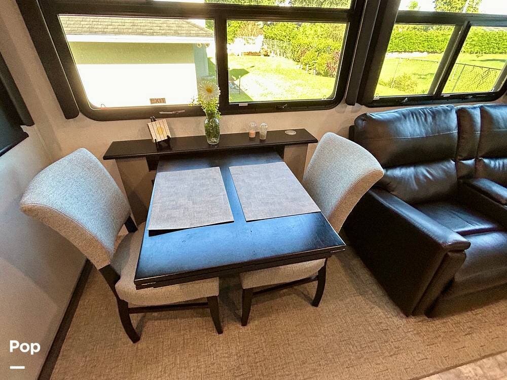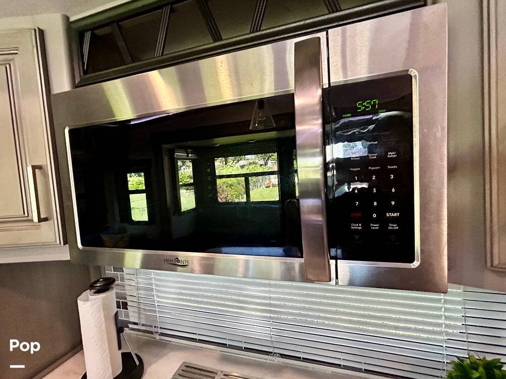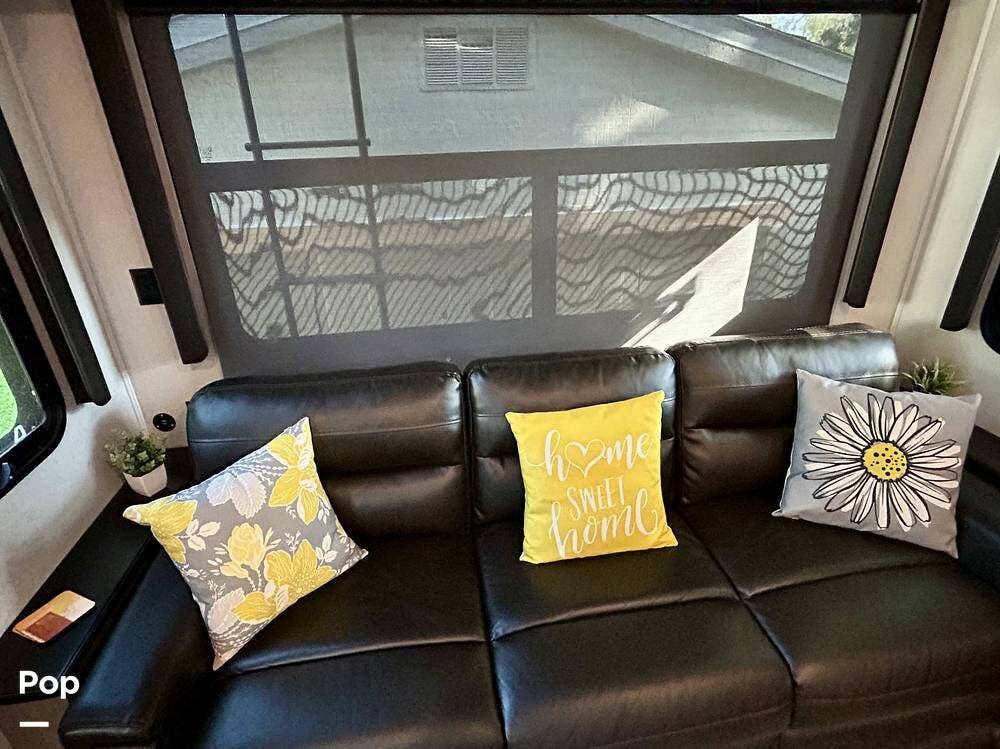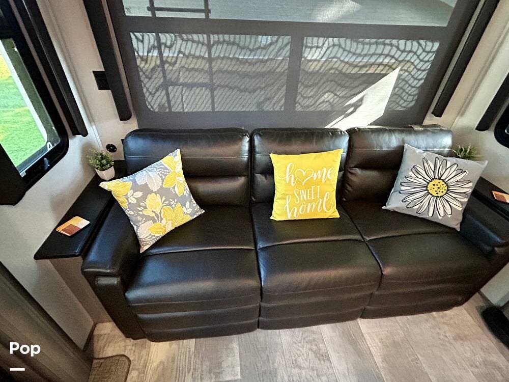The spacious rear living layout features dual opposing slides that open up the main area, creating an inviting atmosphere for entertaining or relaxing. Enjoy the panoramic windows, an electric fireplace, and theater seating that faces a large LED TV.