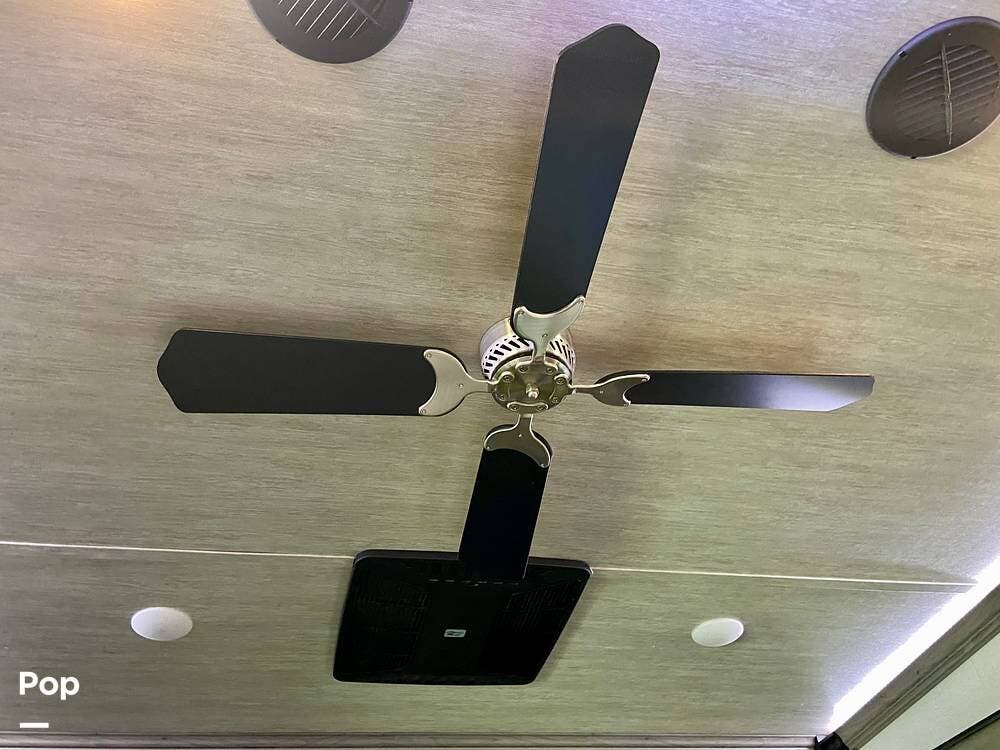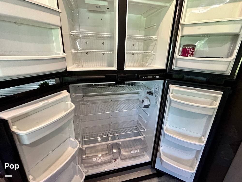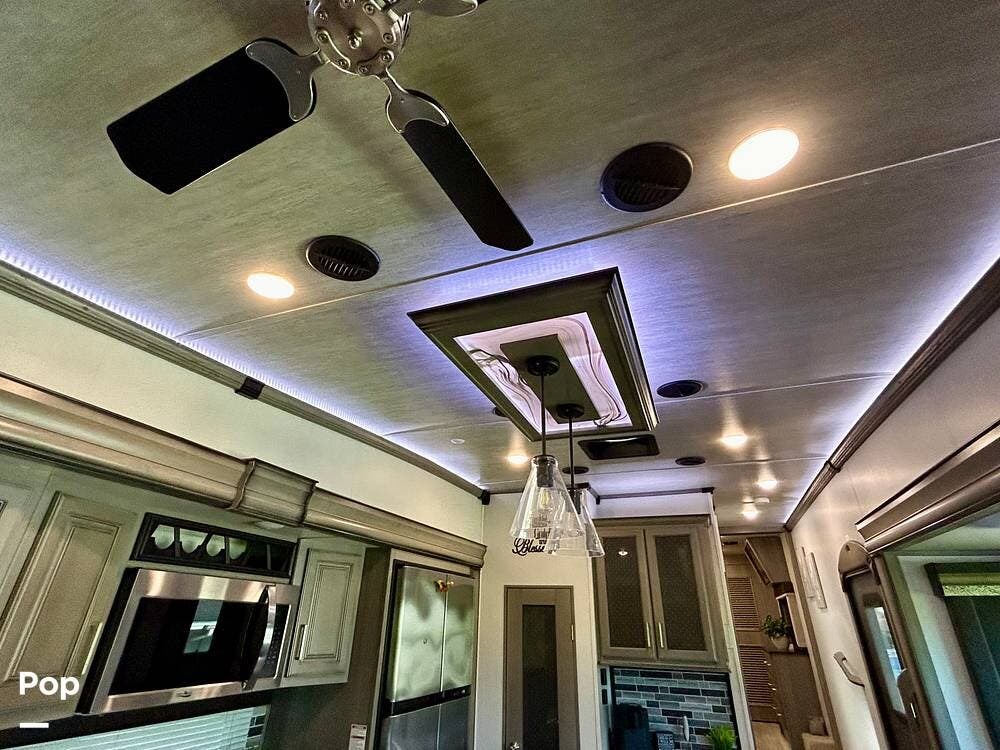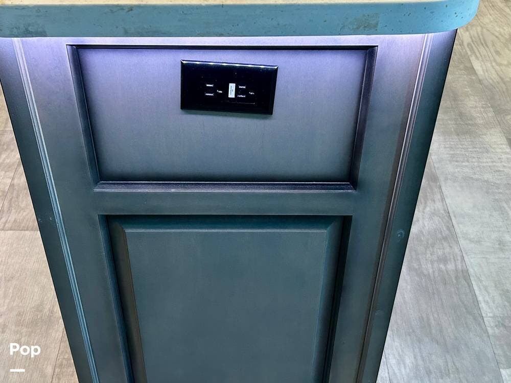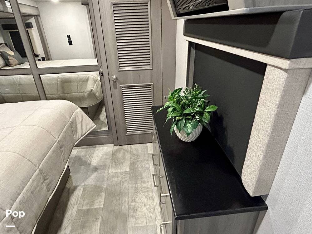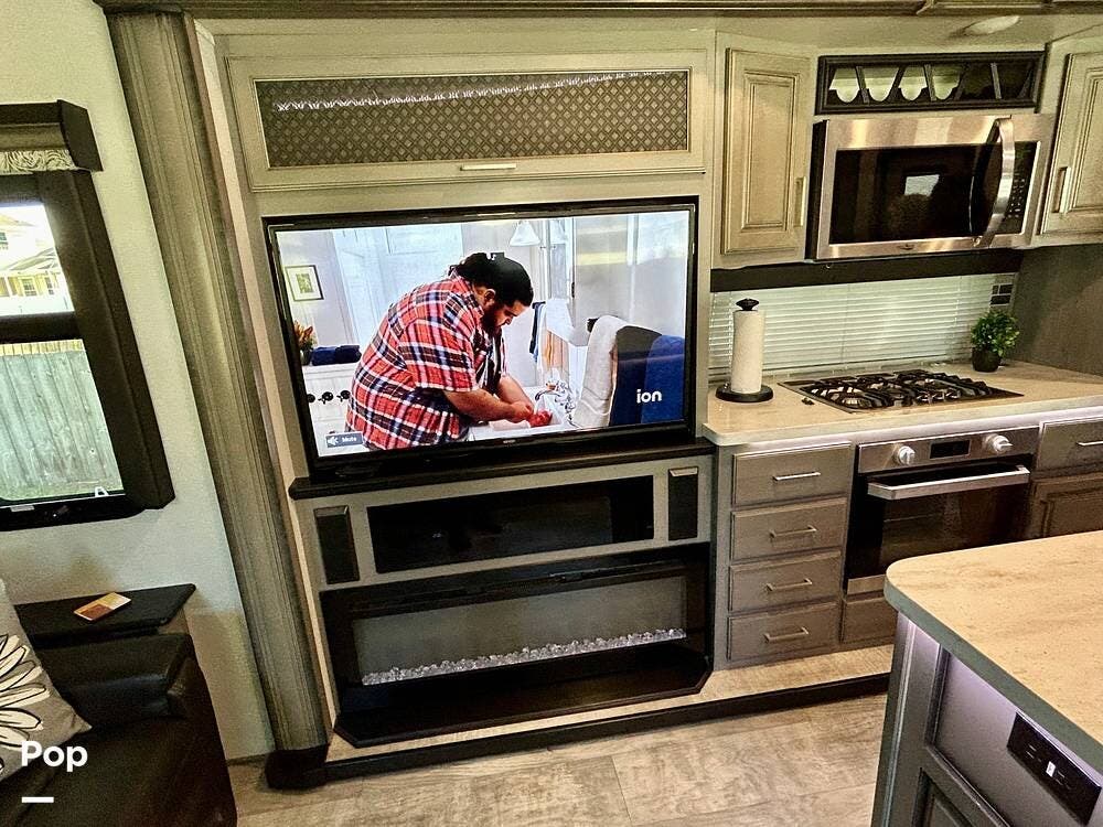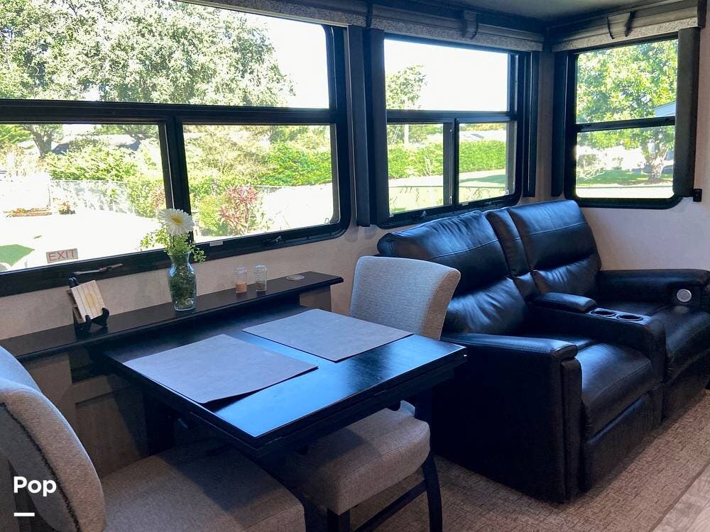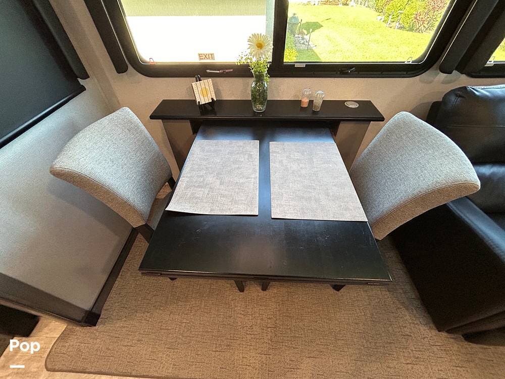 The spacious rear living layout features dual opposing slides that open up the main area, creating an inviting atmosphere for entertaining or relaxing. Enjoy the panoramic windows, an electric fireplace, and theater seating that faces a large LED TV.