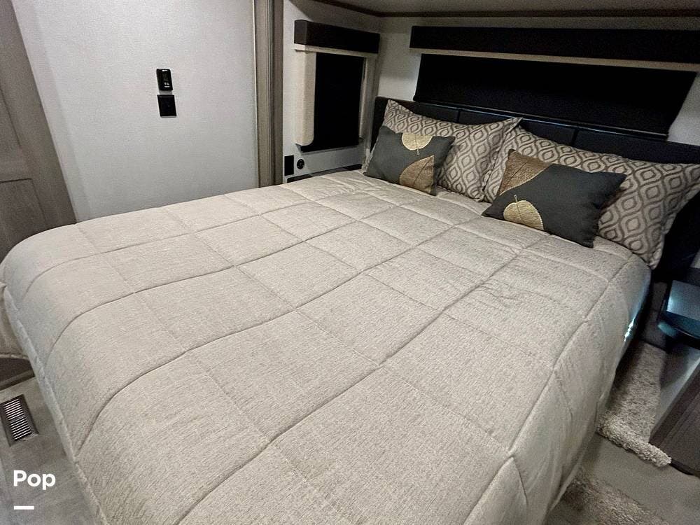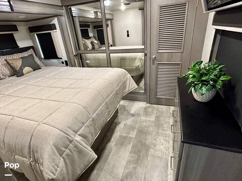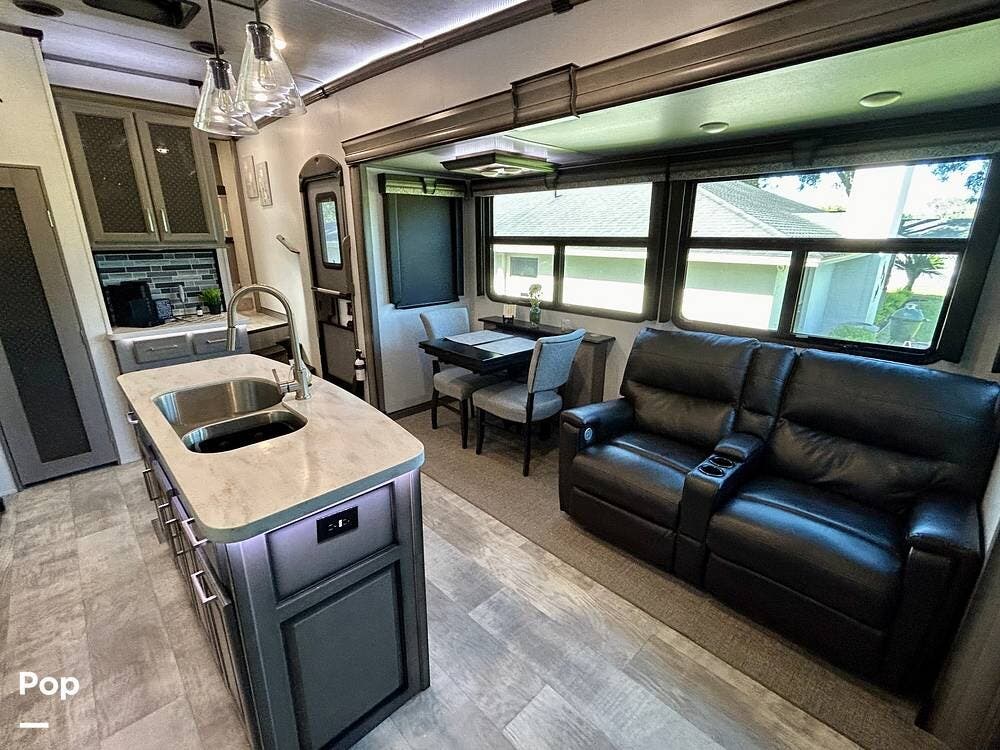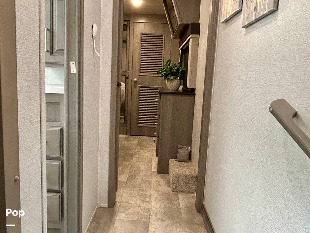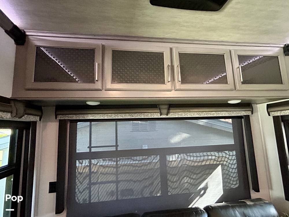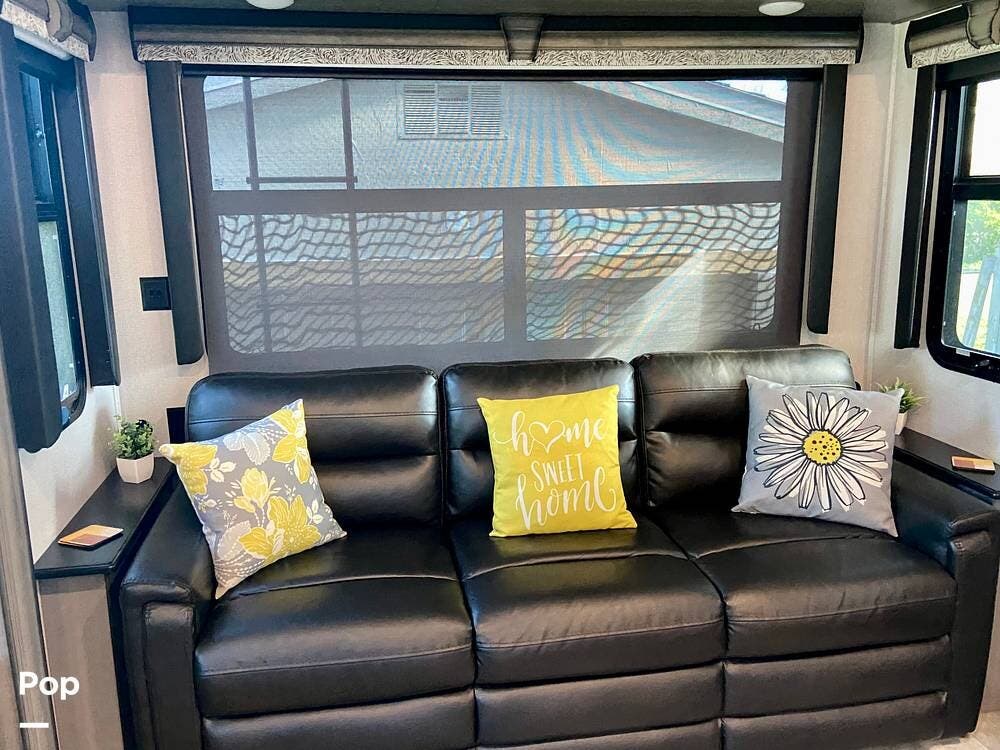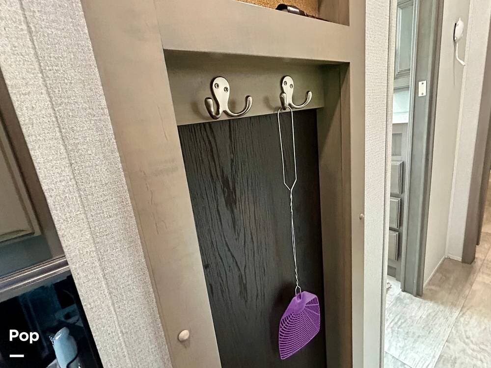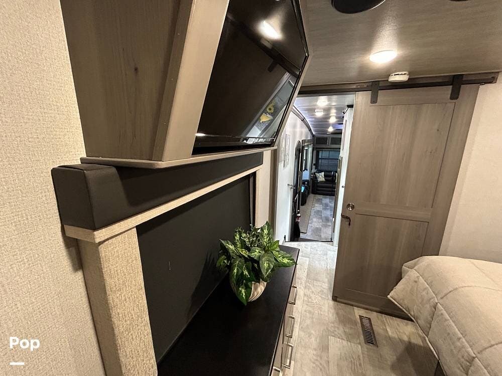 The spacious rear living layout features dual opposing slides that open up the main area, creating an inviting atmosphere for entertaining or relaxing. Enjoy the panoramic windows, an electric fireplace, and theater seating that faces a large LED TV.