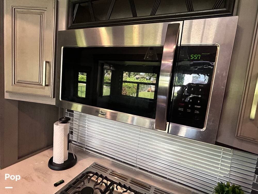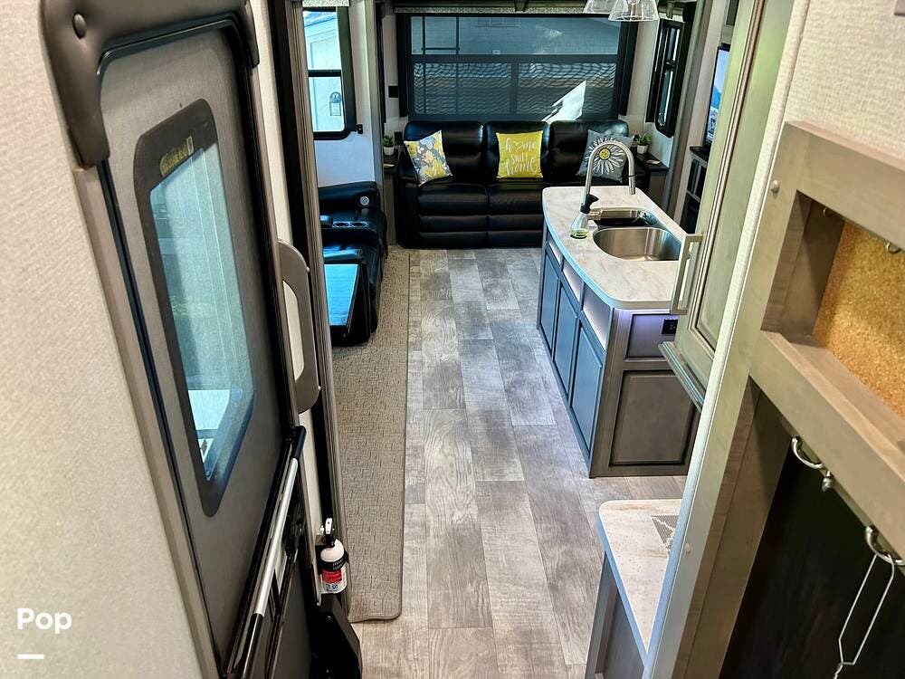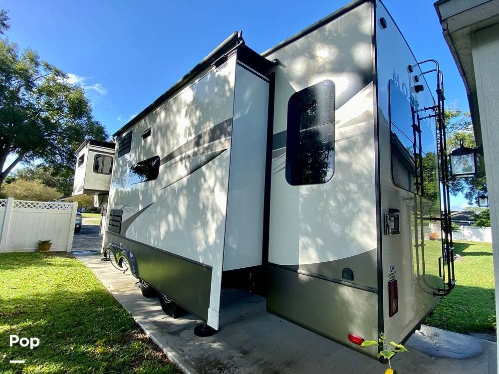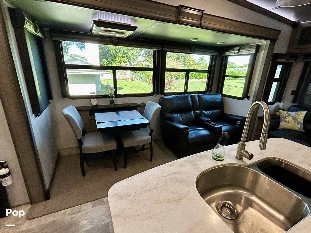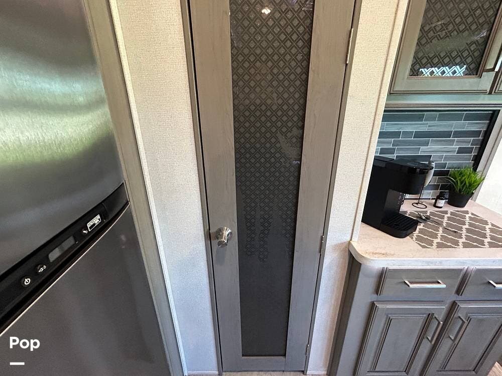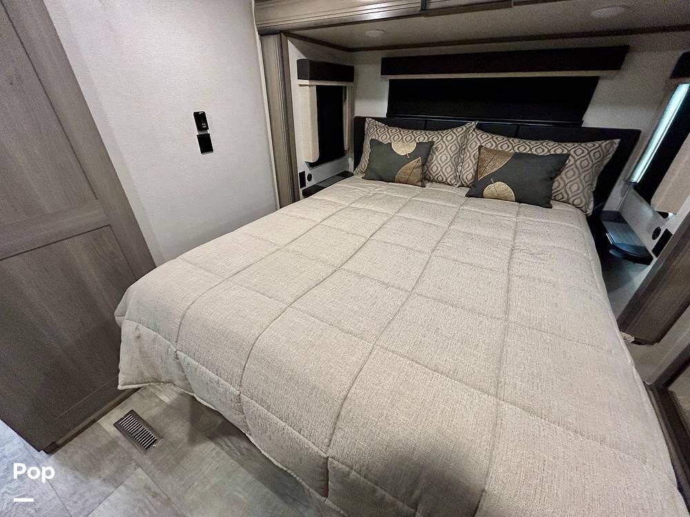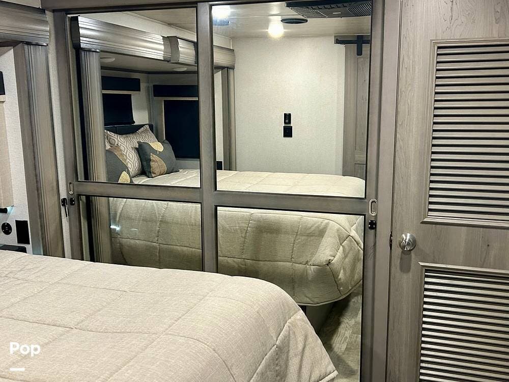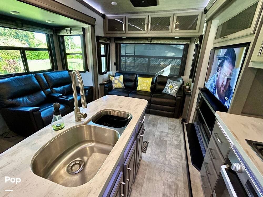The spacious rear living layout features dual opposing slides that open up the main area, creating an inviting atmosphere for entertaining or relaxing. Enjoy the panoramic windows, an electric fireplace, and theater seating that faces a large LED TV.