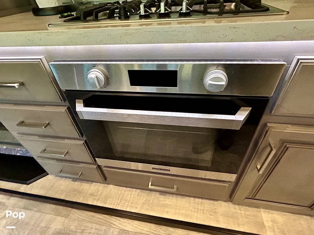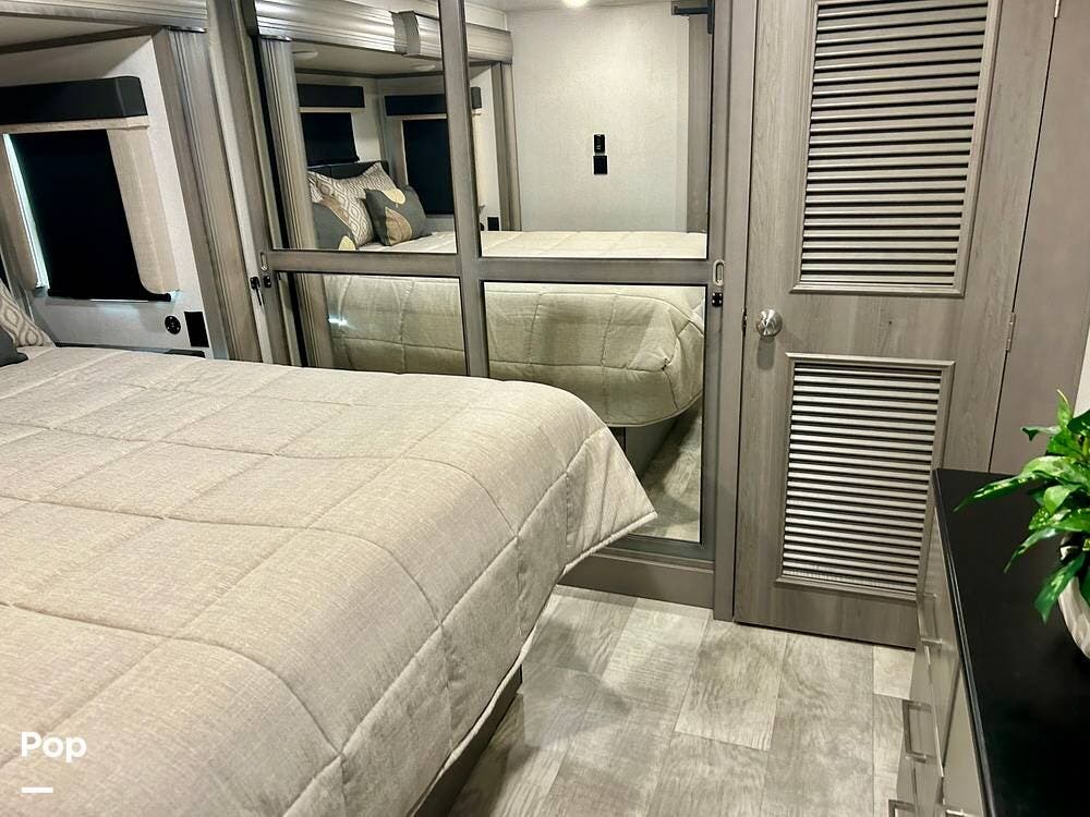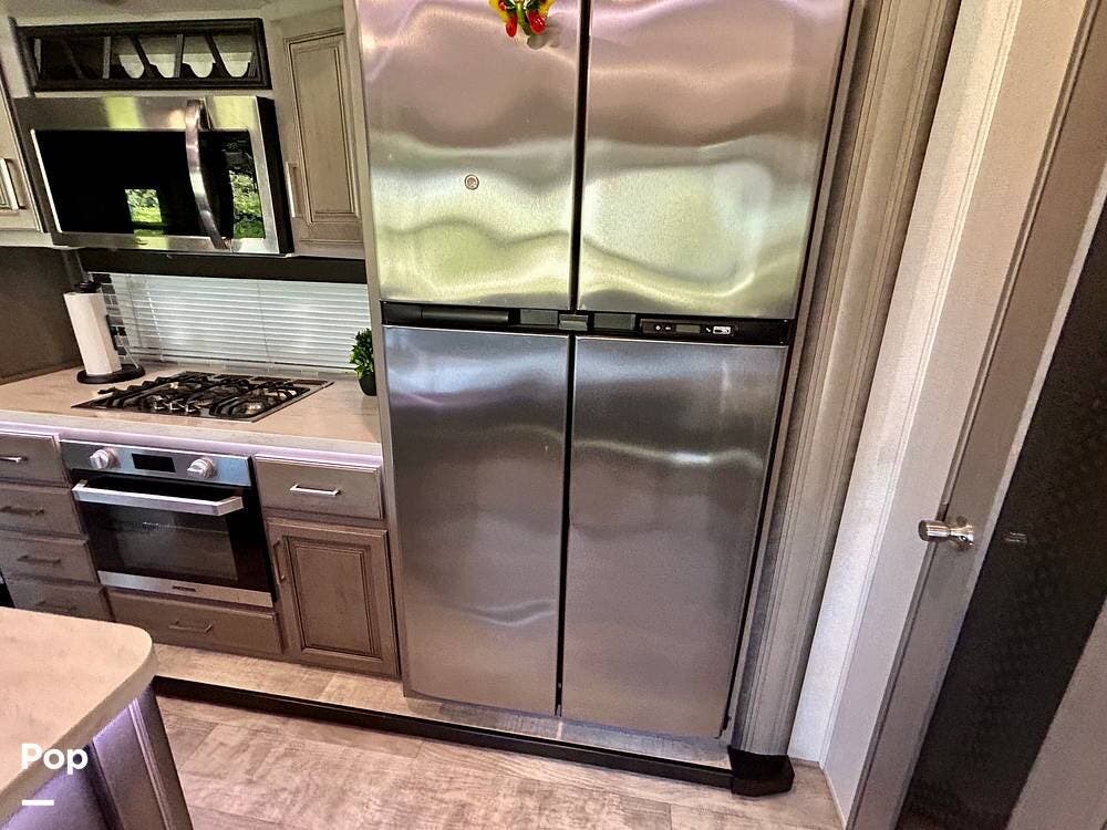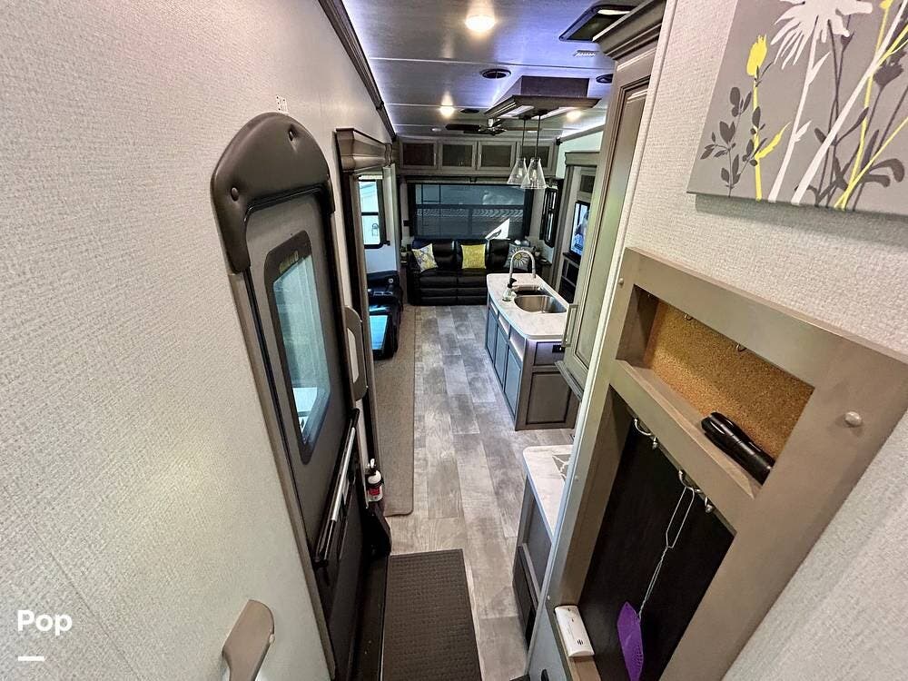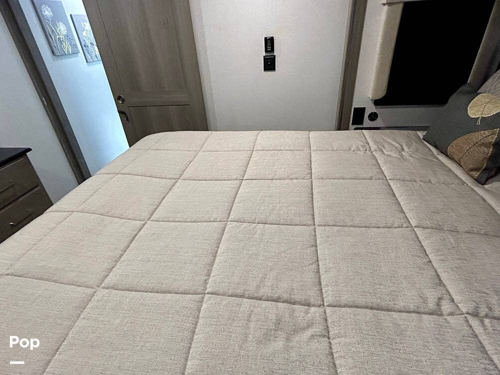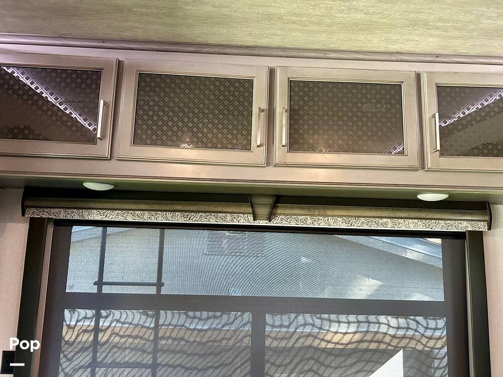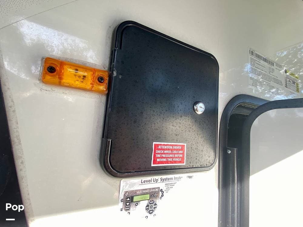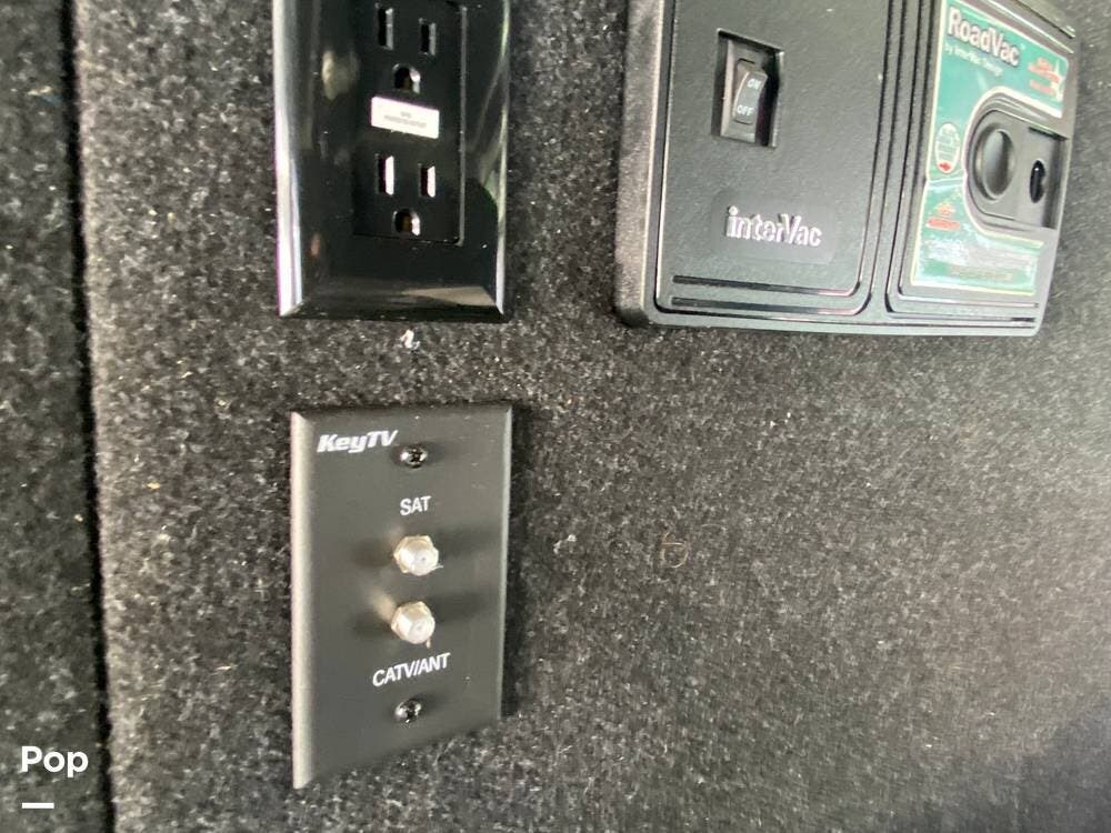 The spacious rear living layout features dual opposing slides that open up the main area, creating an inviting atmosphere for entertaining or relaxing. Enjoy the panoramic windows, an electric fireplace, and theater seating that faces a large LED TV.