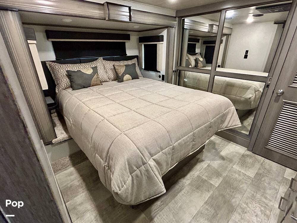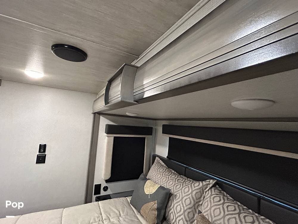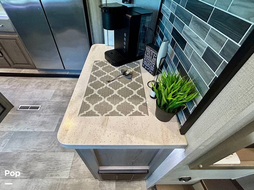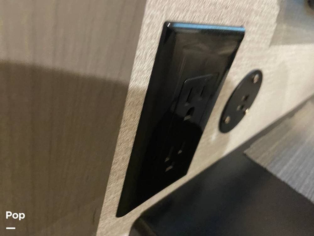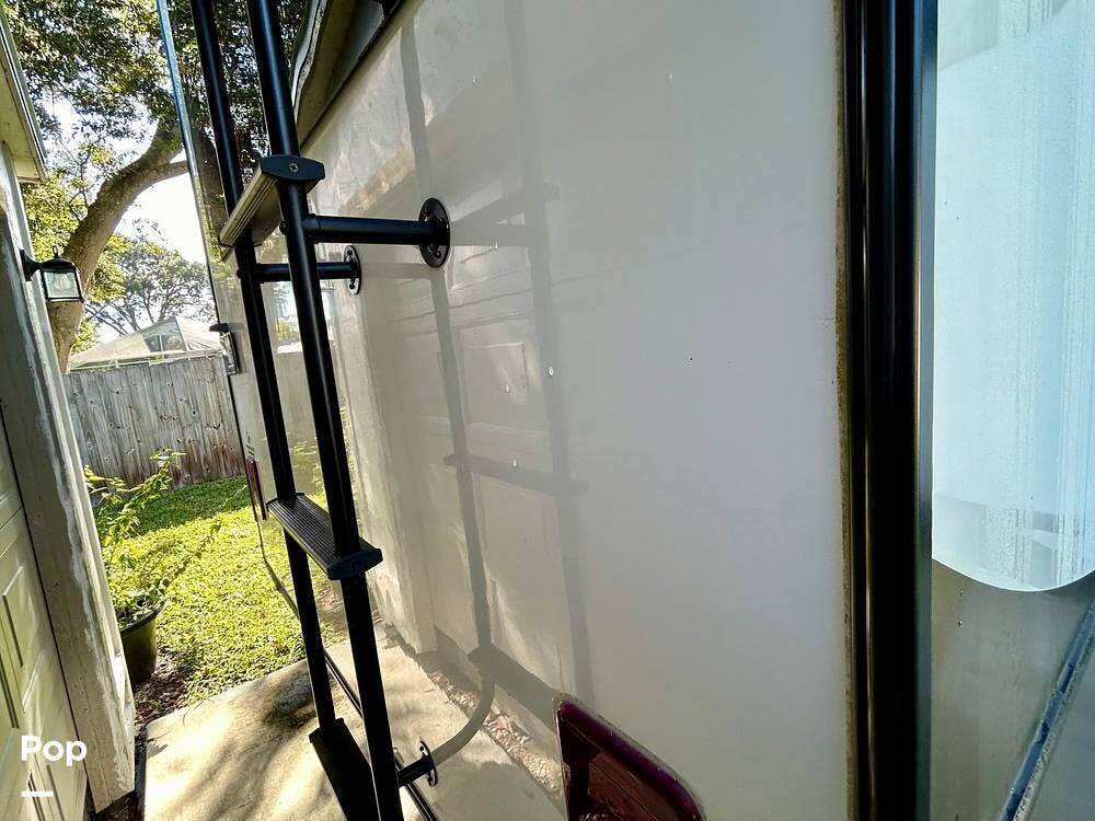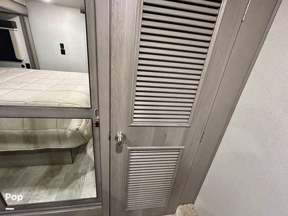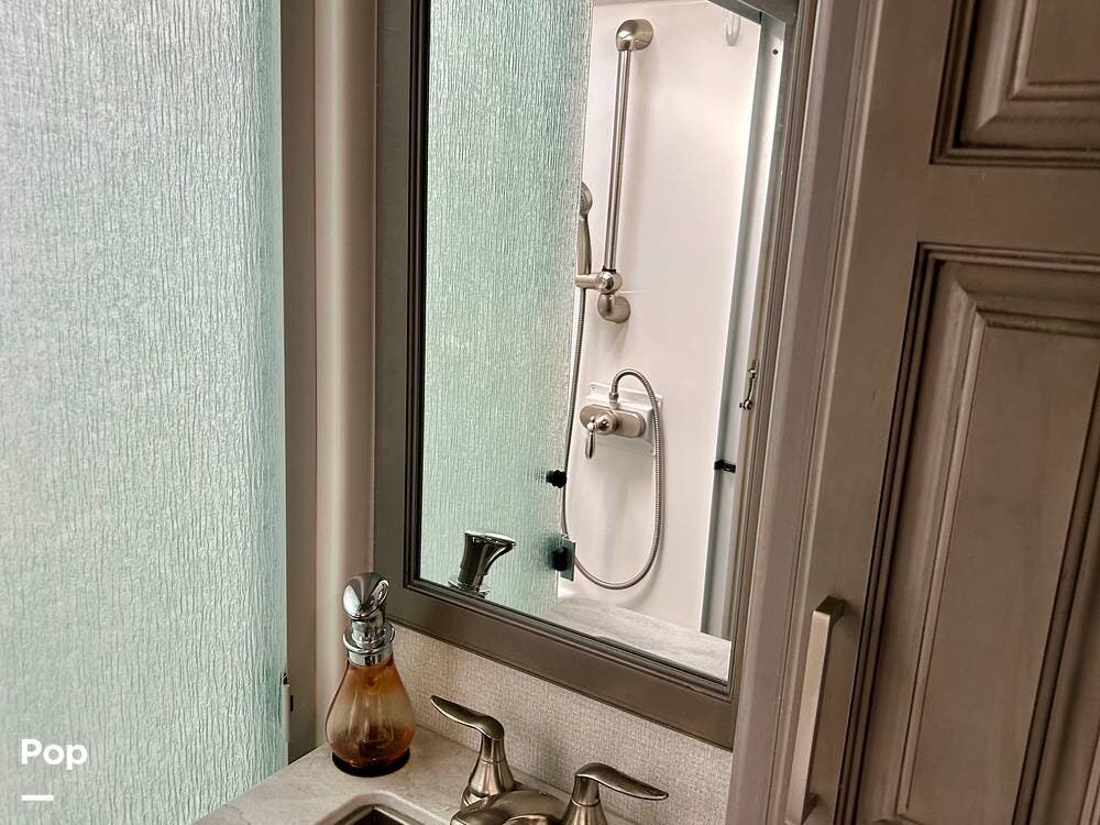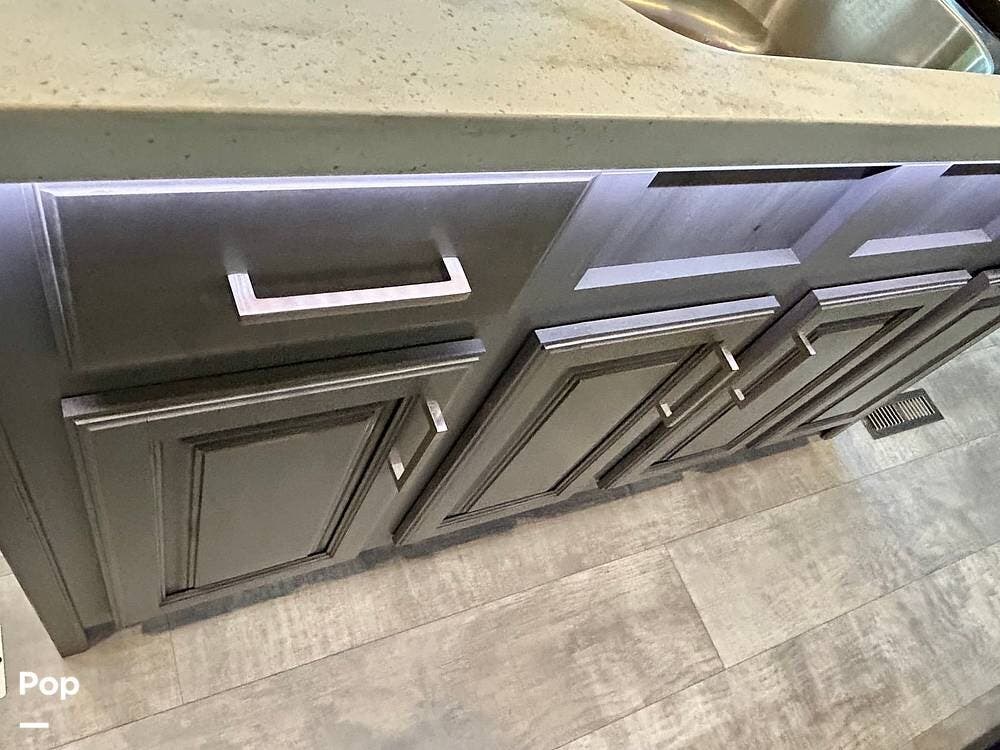 The spacious rear living layout features dual opposing slides that open up the main area, creating an inviting atmosphere for entertaining or relaxing. Enjoy the panoramic windows, an electric fireplace, and theater seating that faces a large LED TV.