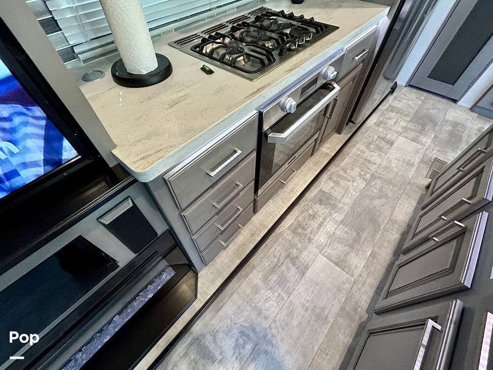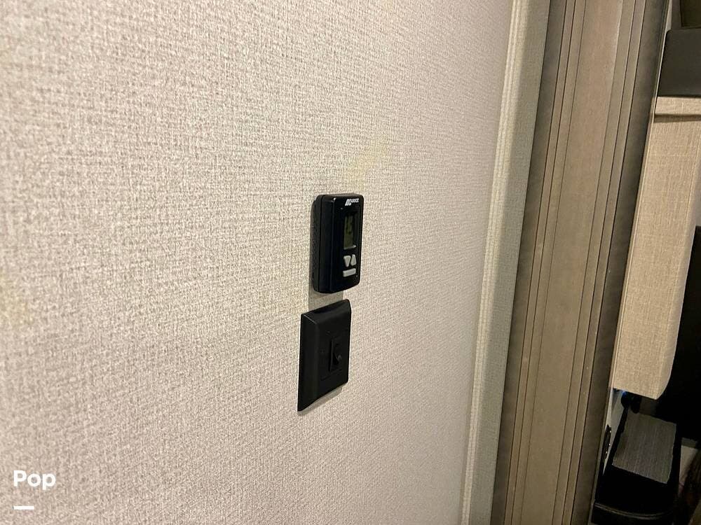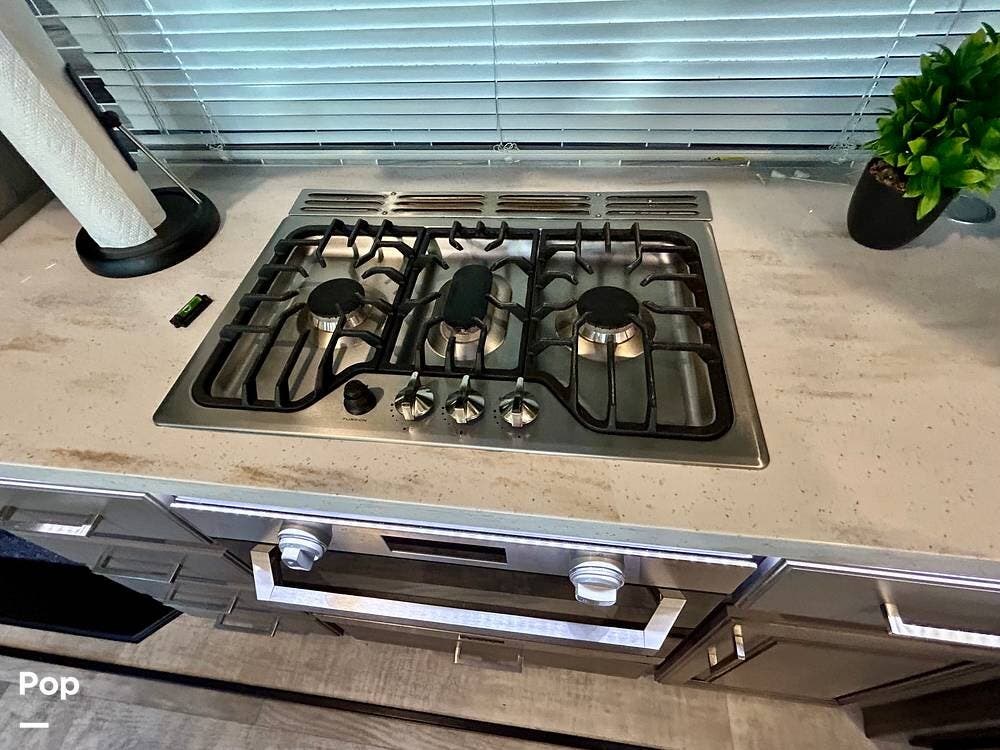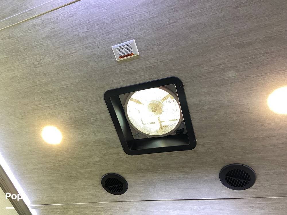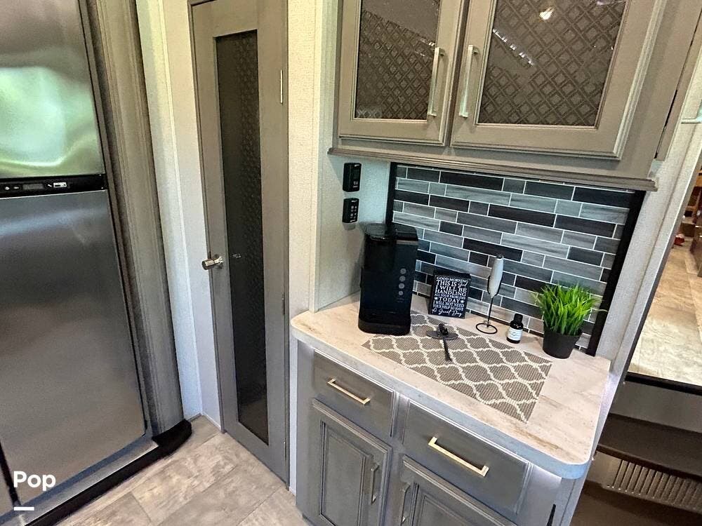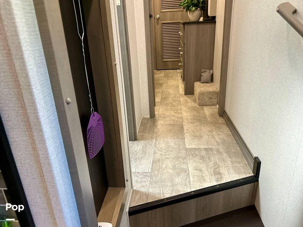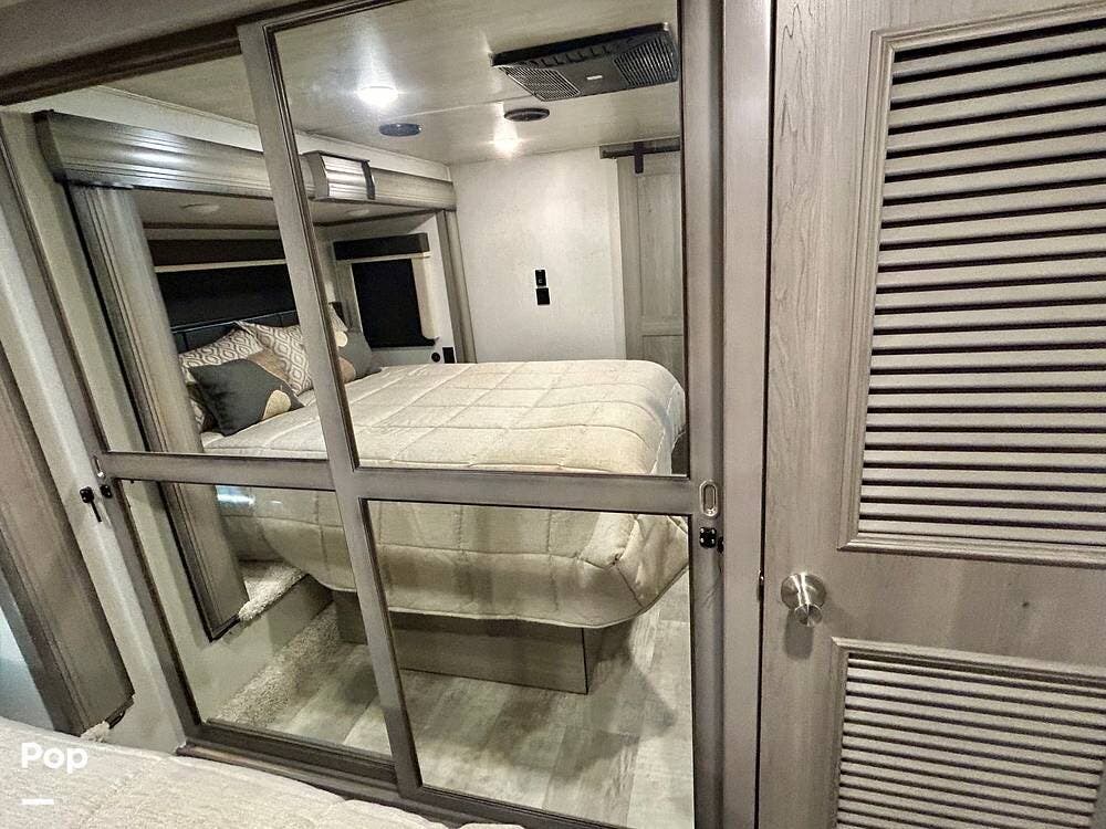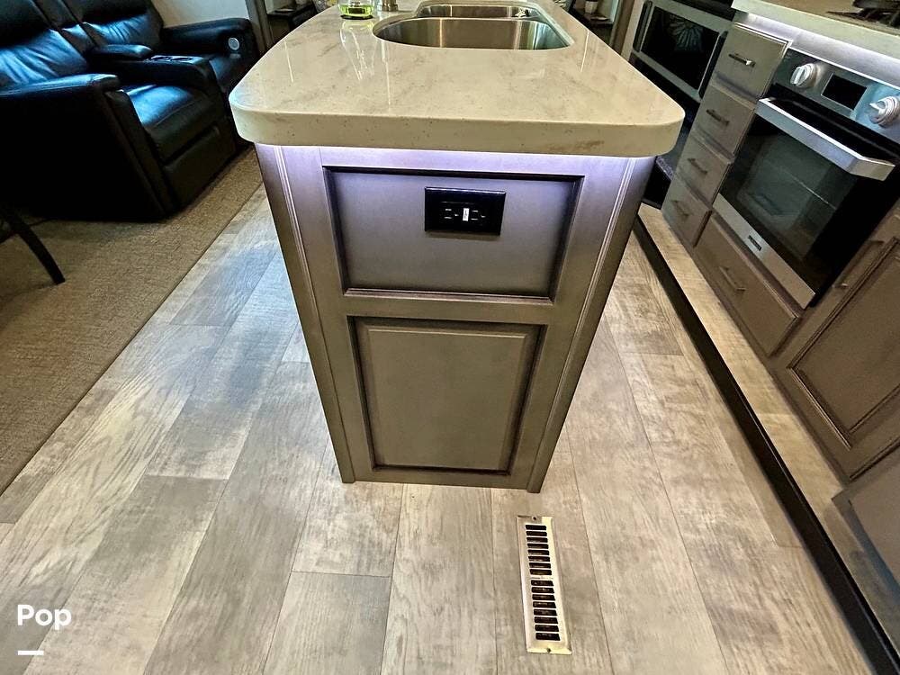 The spacious rear living layout features dual opposing slides that open up the main area, creating an inviting atmosphere for entertaining or relaxing. Enjoy the panoramic windows, an electric fireplace, and theater seating that faces a large LED TV.