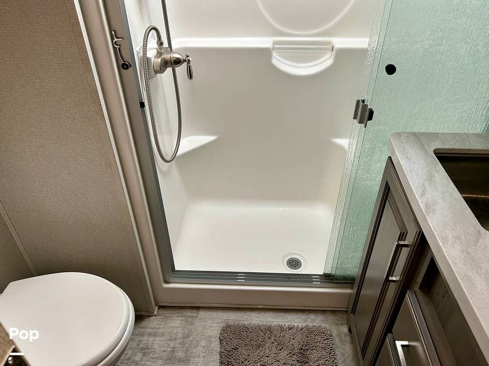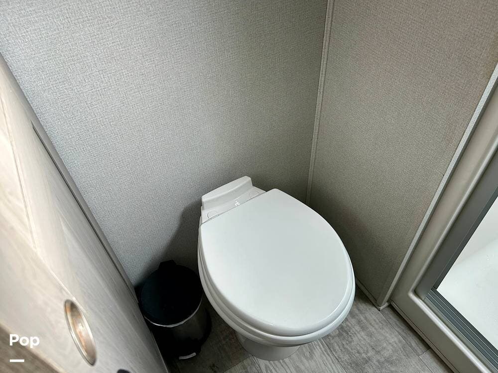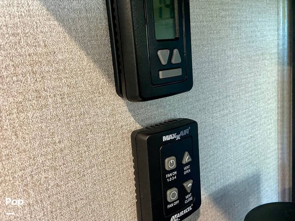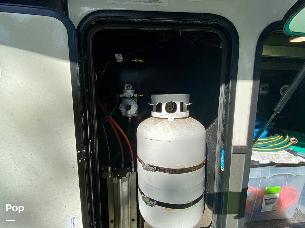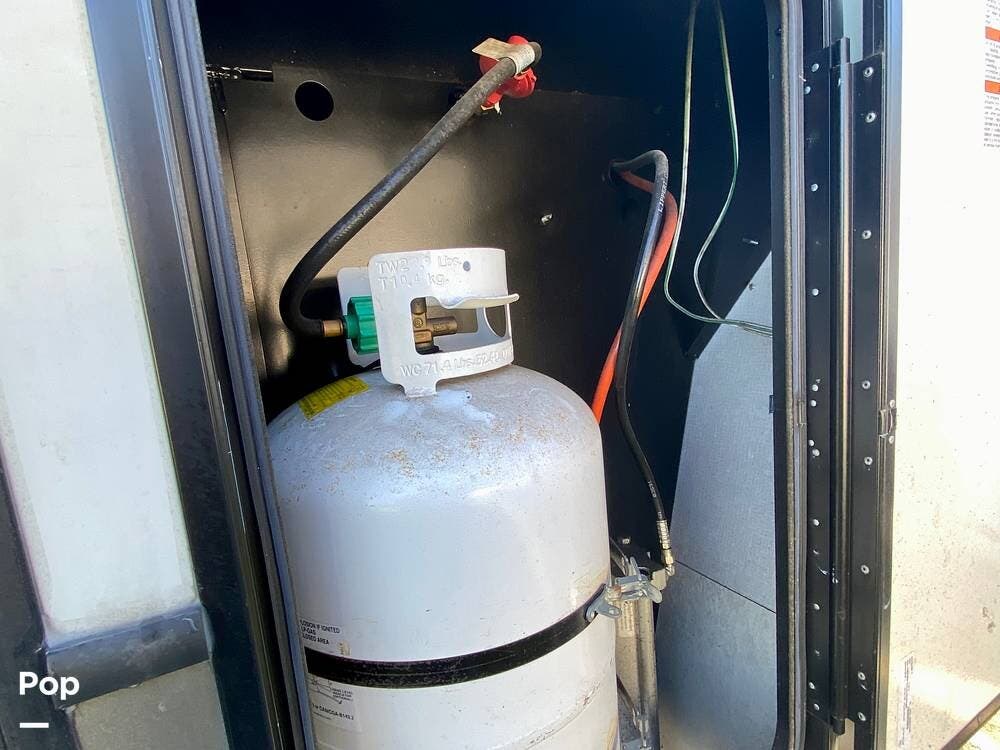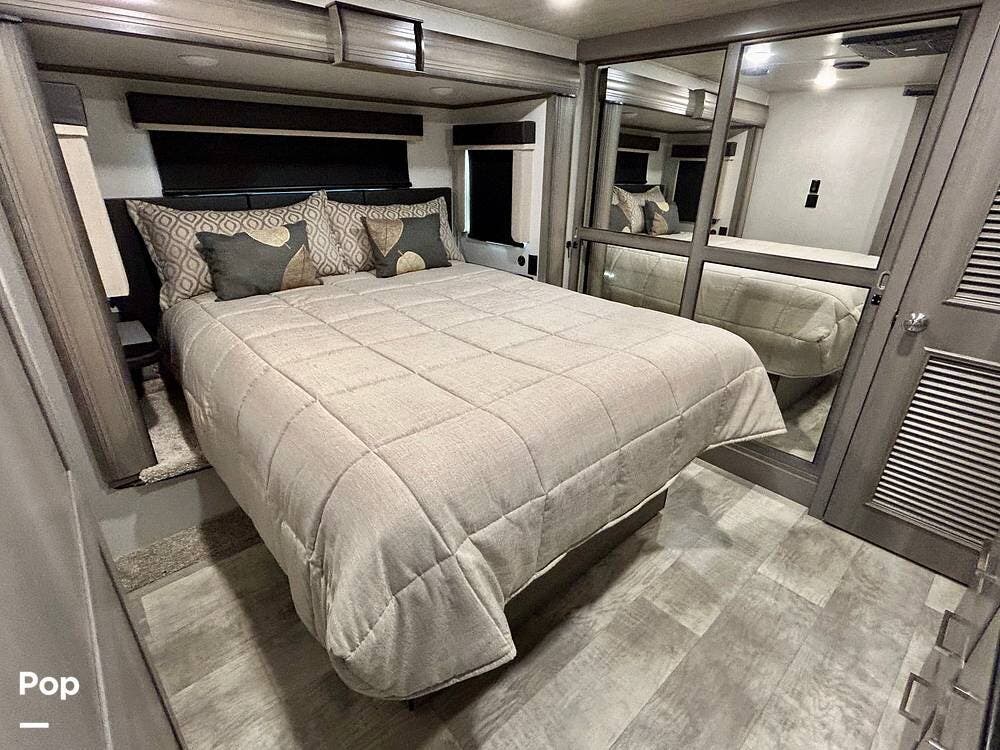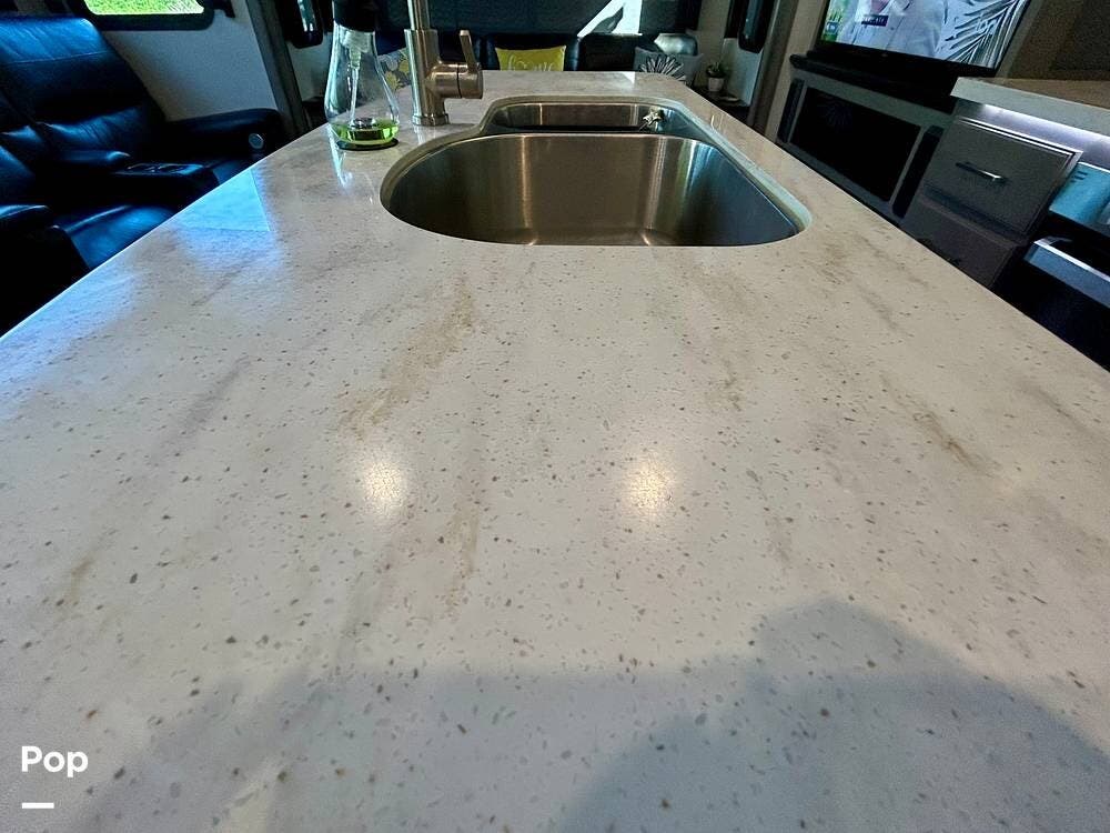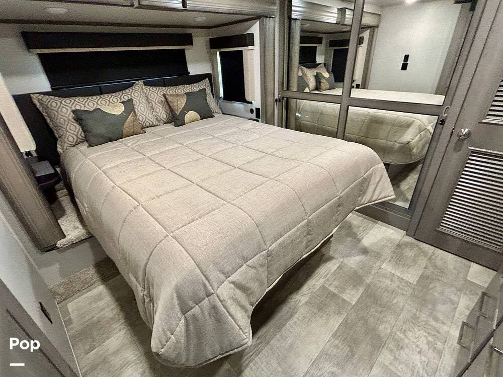 The spacious rear living layout features dual opposing slides that open up the main area, creating an inviting atmosphere for entertaining or relaxing. Enjoy the panoramic windows, an electric fireplace, and theater seating that faces a large LED TV.