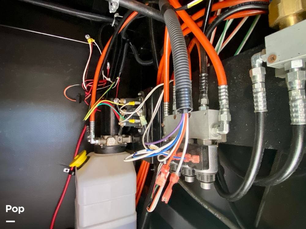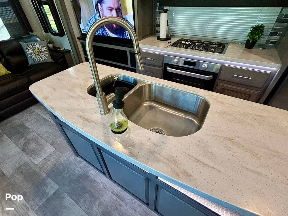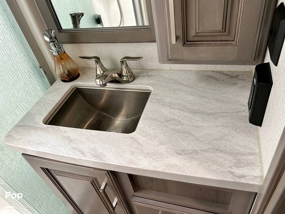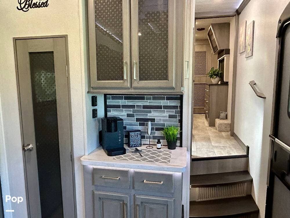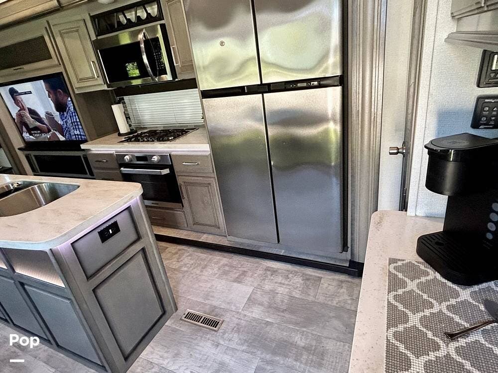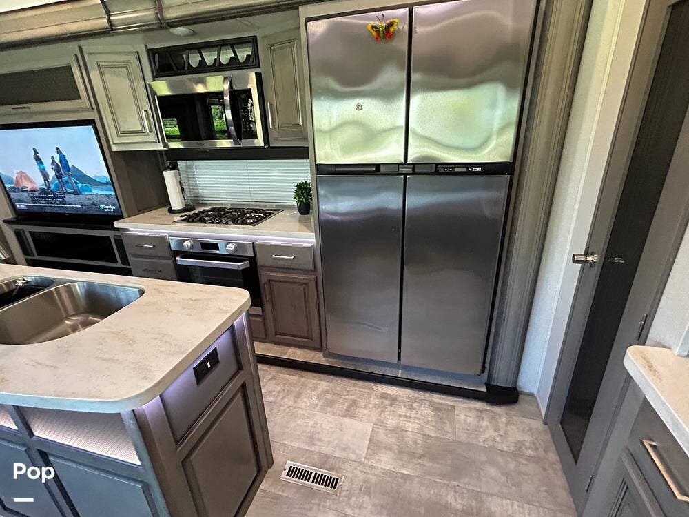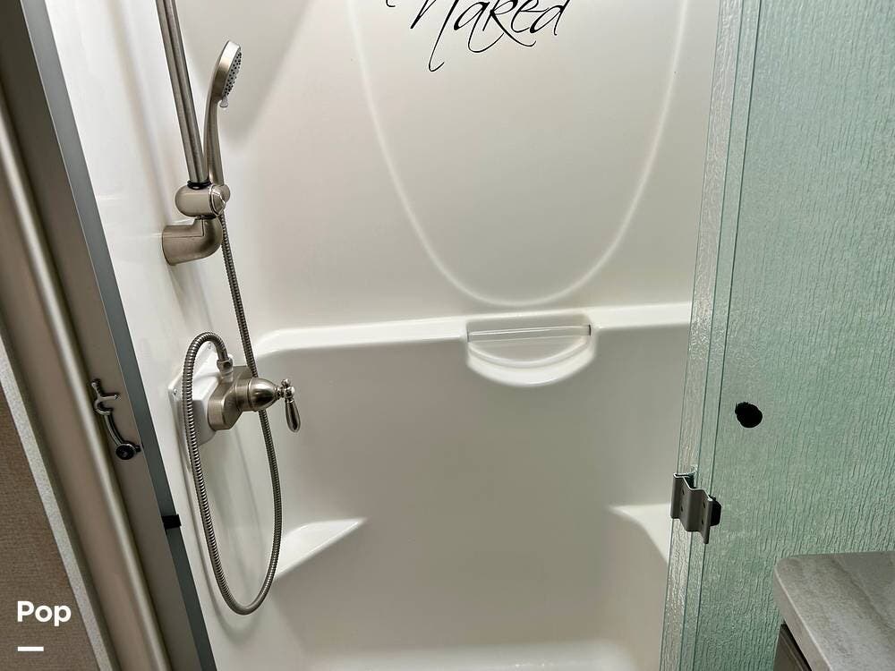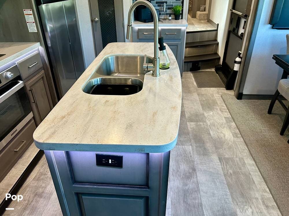 The spacious rear living layout features dual opposing slides that open up the main area, creating an inviting atmosphere for entertaining or relaxing. Enjoy the panoramic windows, an electric fireplace, and theater seating that faces a large LED TV.
