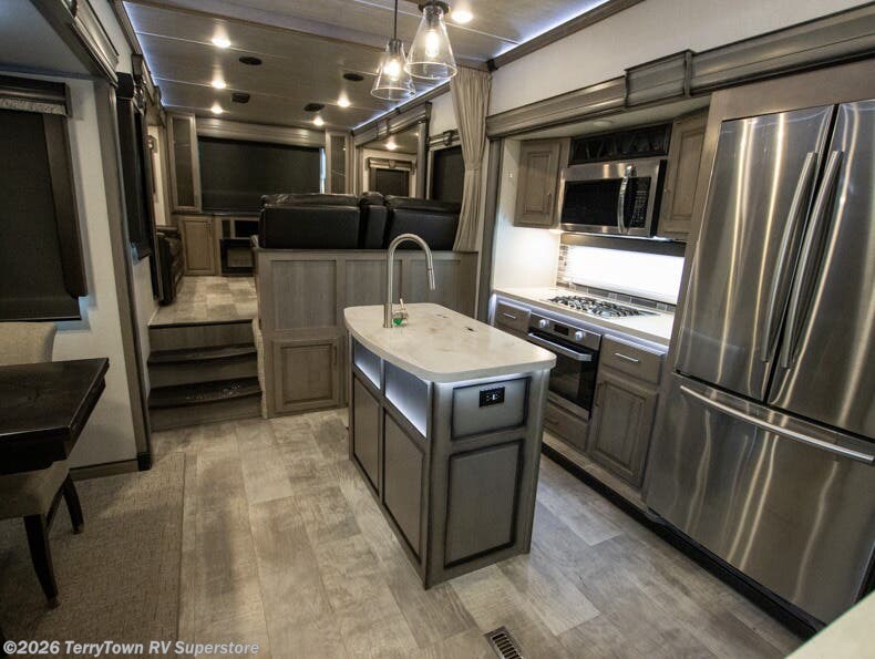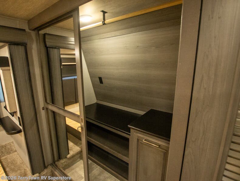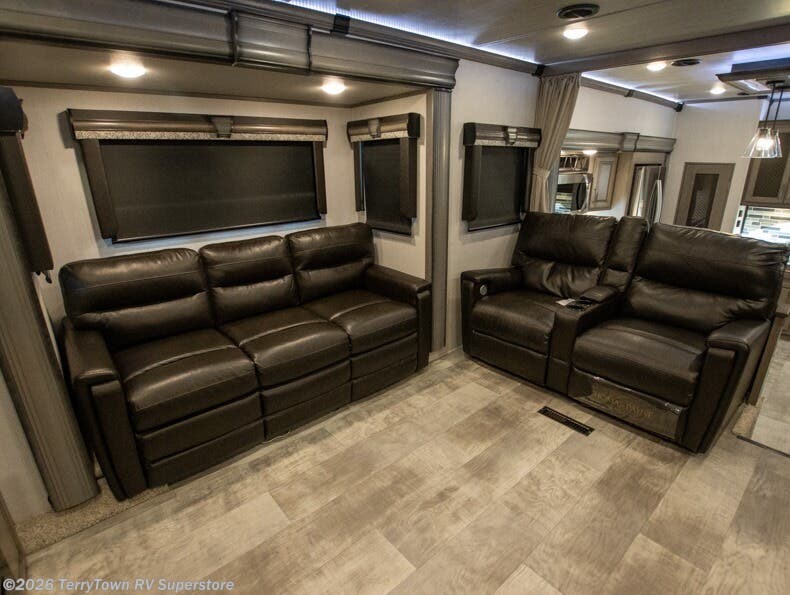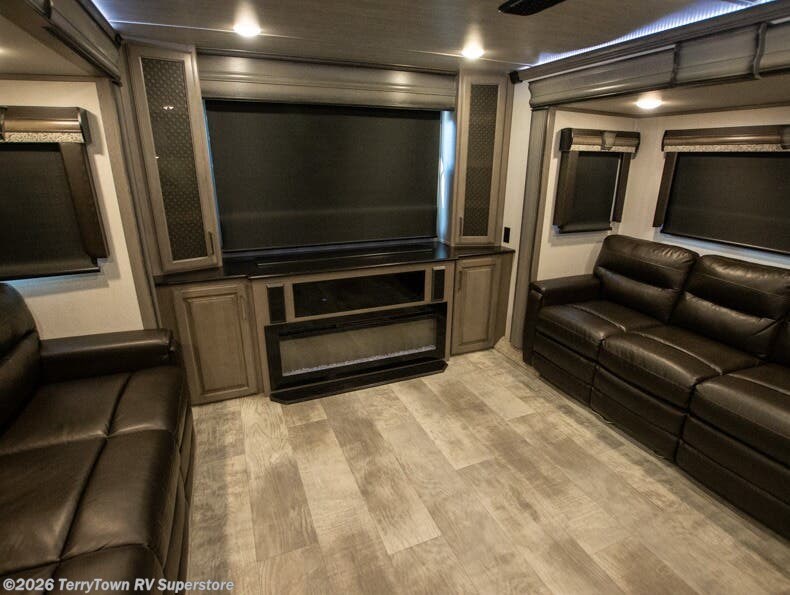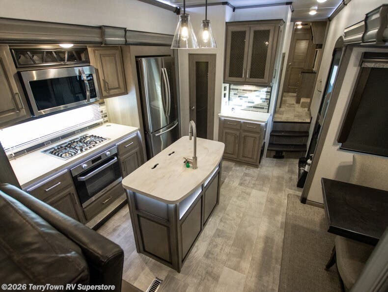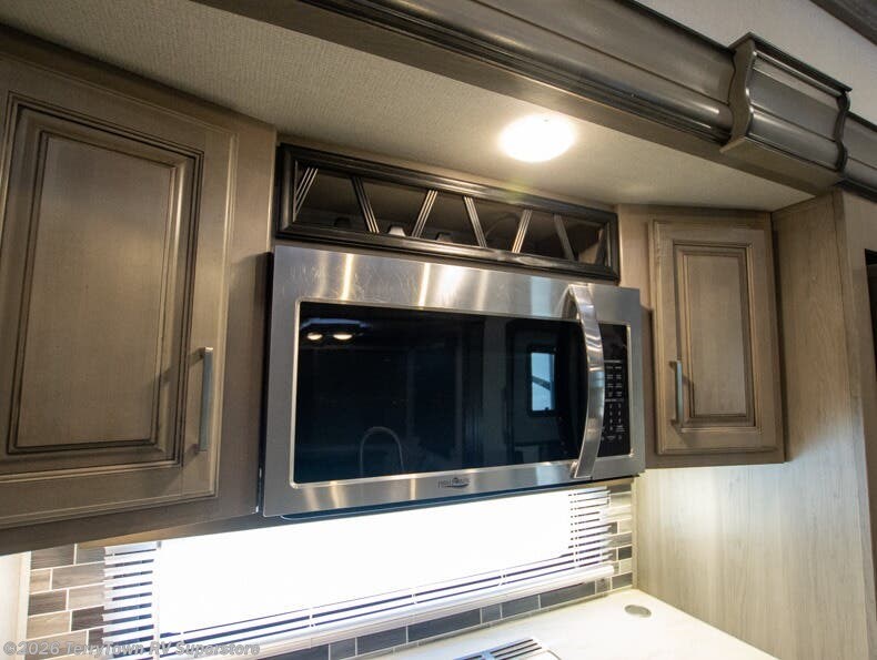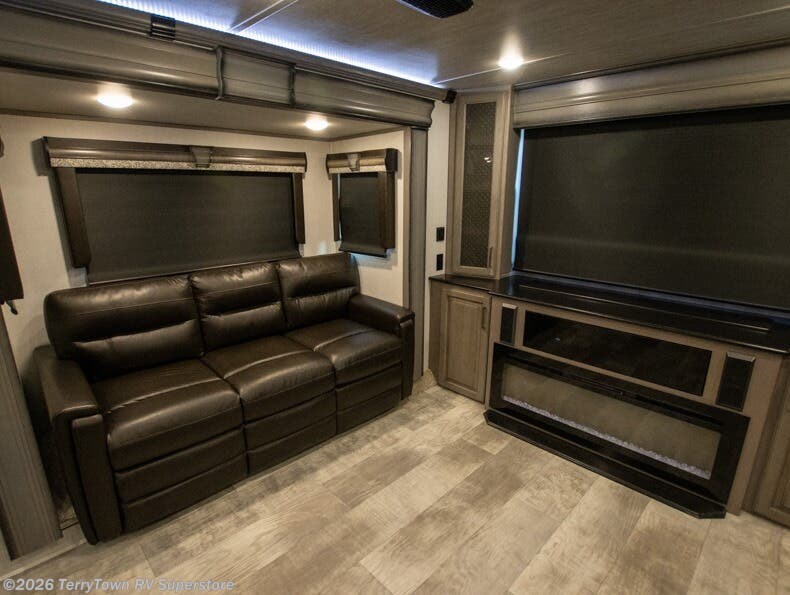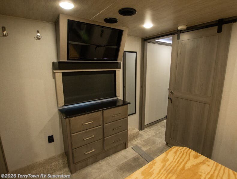 If you want your own space to cook, your own area to watch TV, and your own private bedroom, take a look at this Montana. The rear living and entertaining room includes dual hide-a-bed sofas and theatre seats with power recliners making a cozy place to gather around to talk about your day while staying warm. The kitchen offers a separate space to make and eat meals including a coffee station for the coffee lover in the family. You will also find a center island, an 18 cu. ft. residential refrigerator, a convection microwave, and a pantry allowing you to make any meal while away from home. The barn door into the front bedroom gives you more space, plus the bedroom includes plenty of storage and a place to add a washer and dryer option.