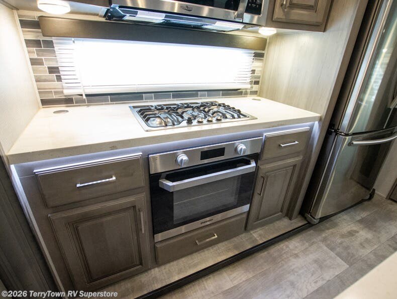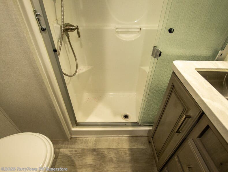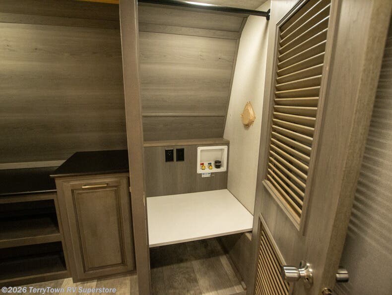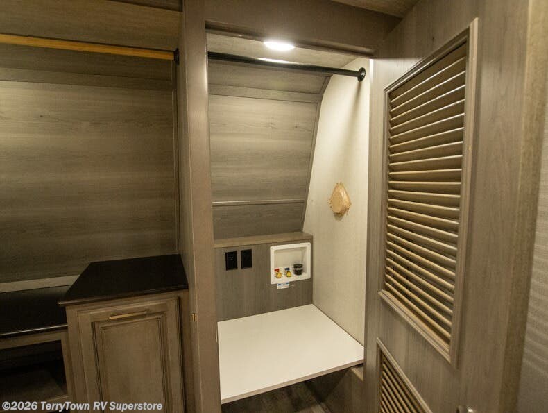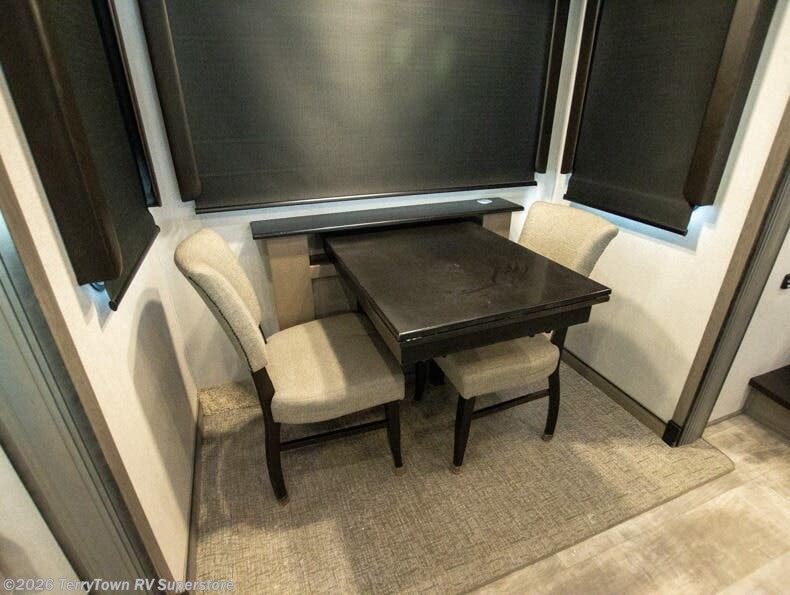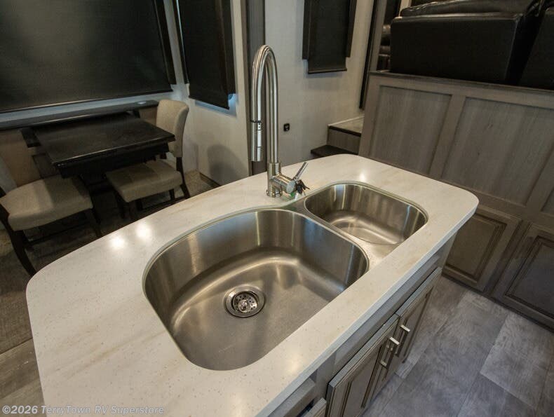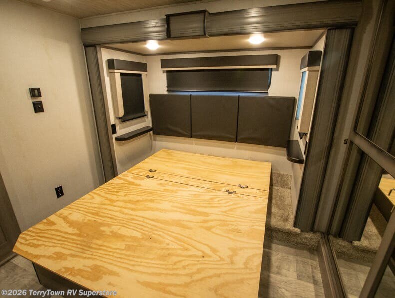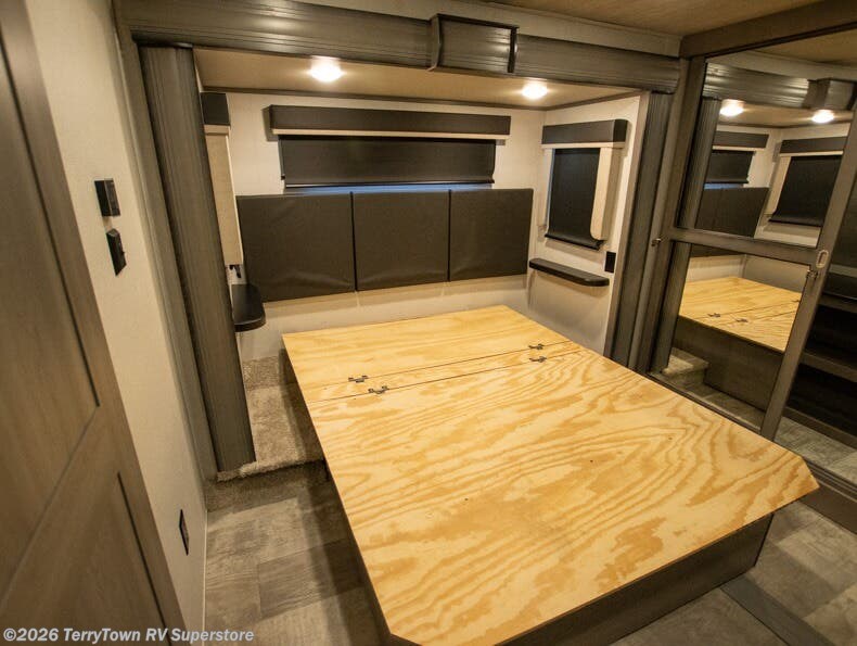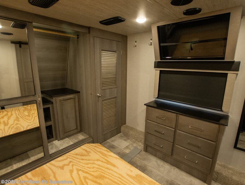 If you want your own space to cook, your own area to watch TV, and your own private bedroom, take a look at this Montana. The rear living and entertaining room includes dual hide-a-bed sofas and theatre seats with power recliners making a cozy place to gather around to talk about your day while staying warm. The kitchen offers a separate space to make and eat meals including a coffee station for the coffee lover in the family. You will also find a center island, an 18 cu. ft. residential refrigerator, a convection microwave, and a pantry allowing you to make any meal while away from home. The barn door into the front bedroom gives you more space, plus the bedroom includes plenty of storage and a place to add a washer and dryer option.