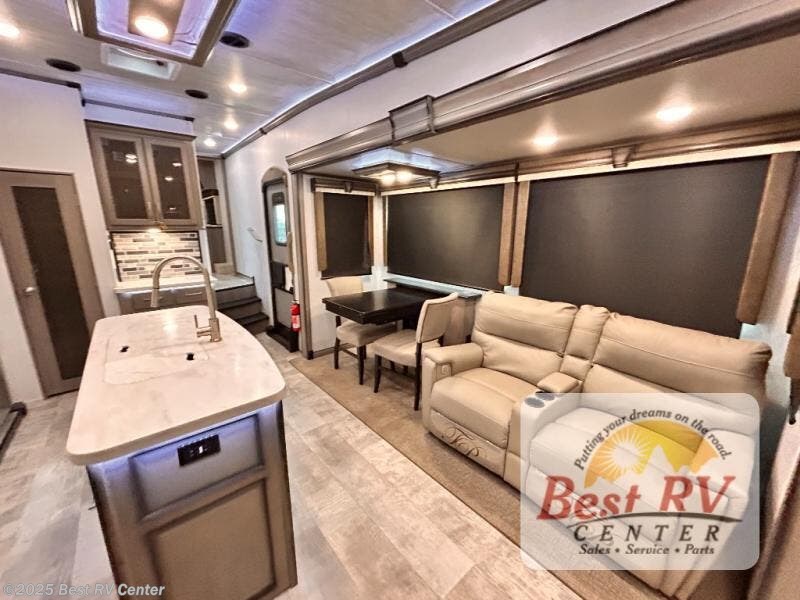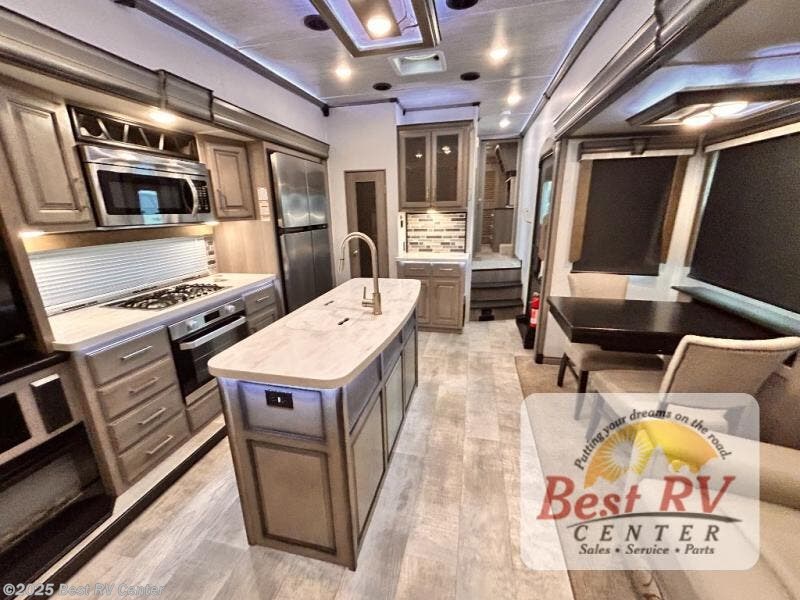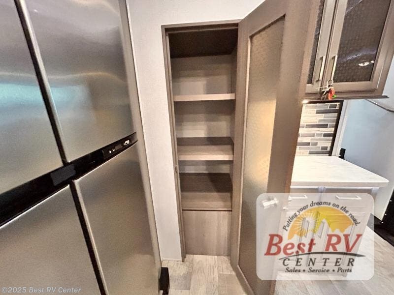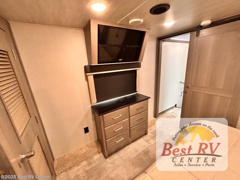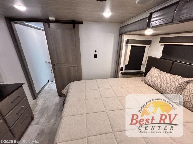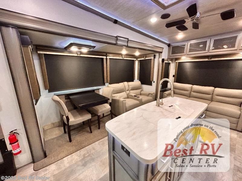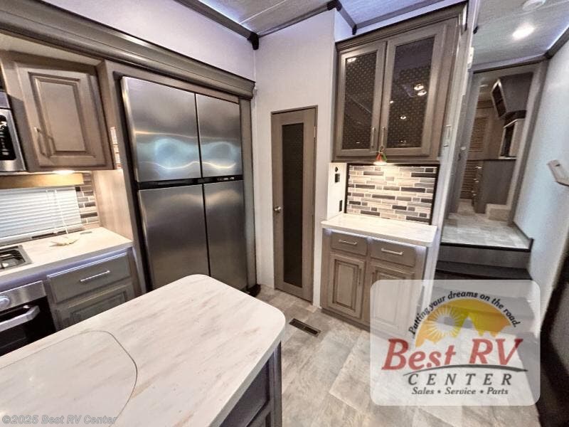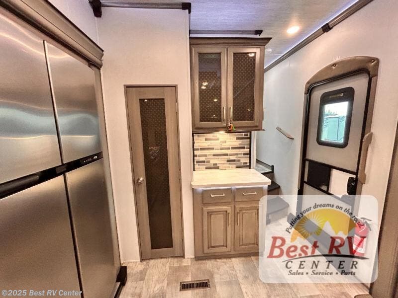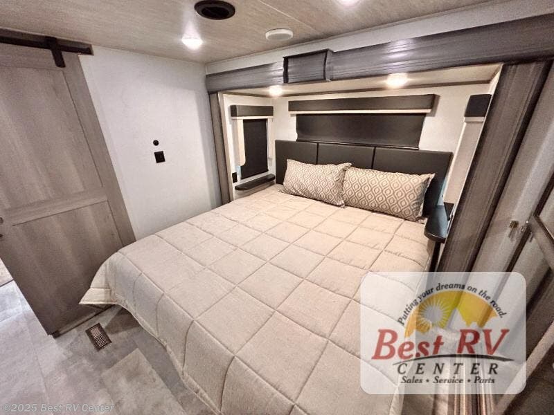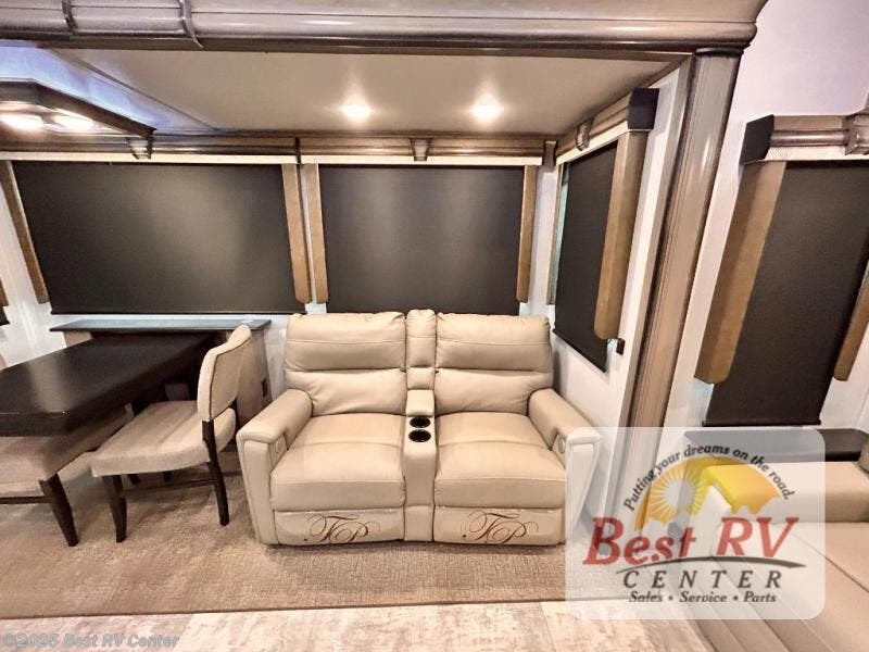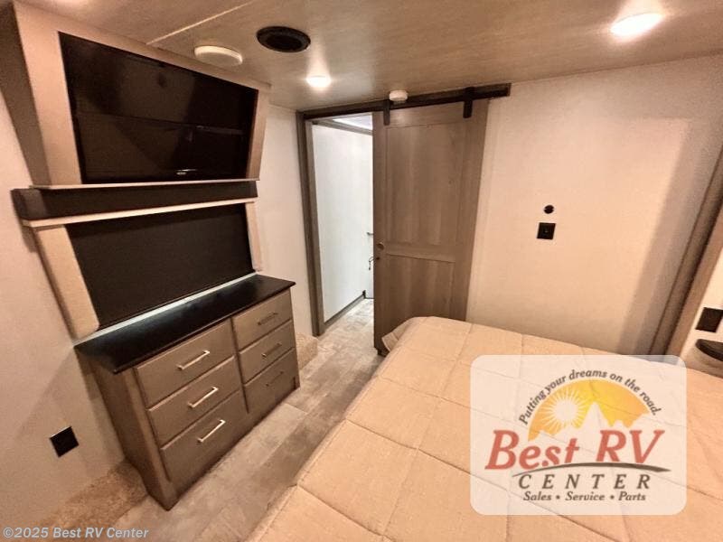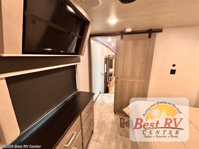 Watch your favorite show from the power theatre seating or the hide-a-bed sofa while the chef prepares a meal in the full kitchen including an island, a pantry and a coffee station. The convection microwave will probably be a favorite appliance for many. You will also love your master bedroom with a slide out queen bed or choose an optional king, plus you will have plenty of storage for everything under the bed, within a dresser, and inside the closet up front. There is a space to add a washer/dryer option and the barn door into this room offers style and saves space. You may like to relax outside with protection from two awnings, and the 2" towing hitch might come in handy as well.
