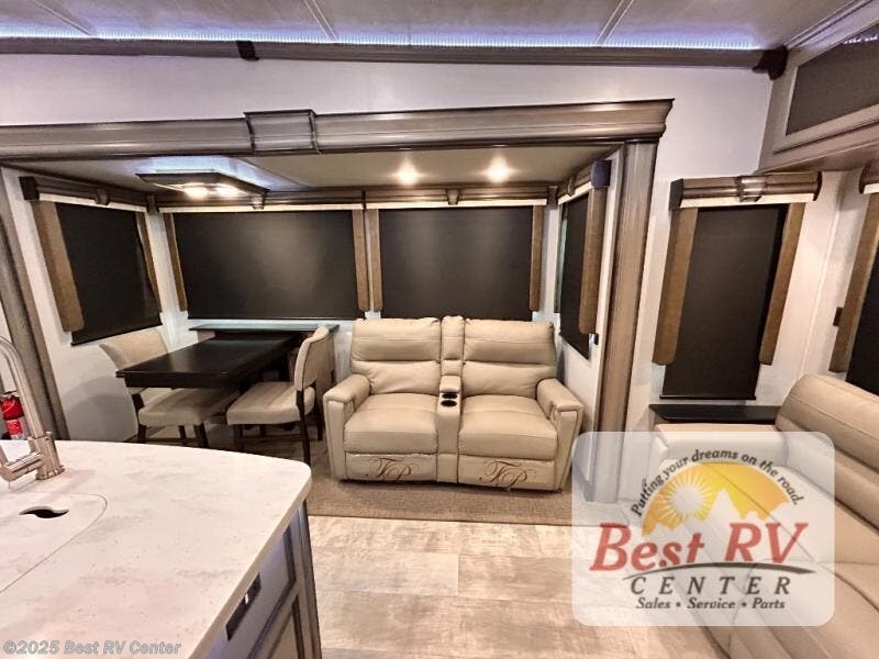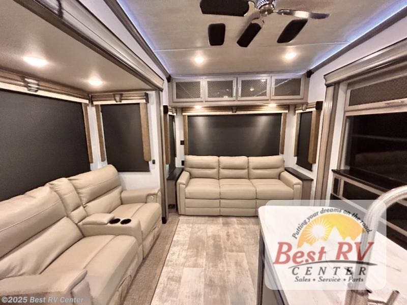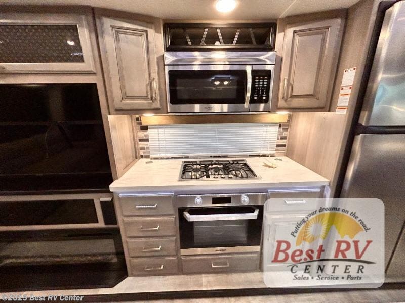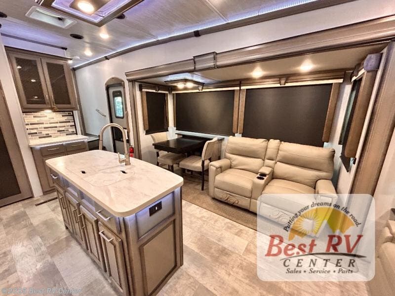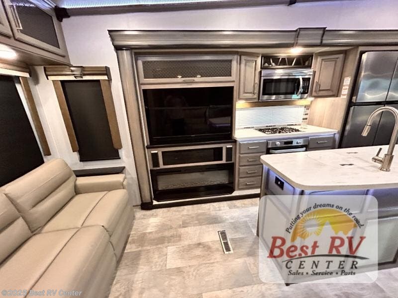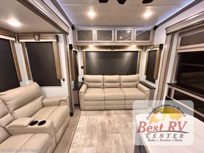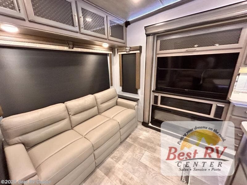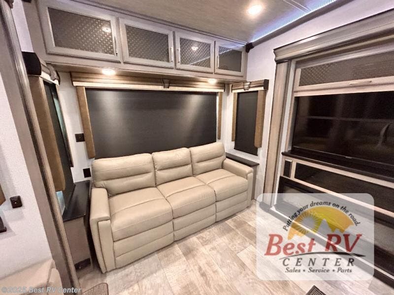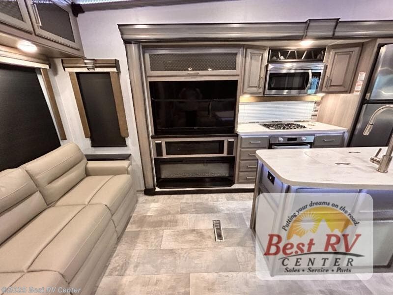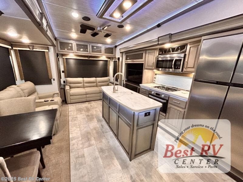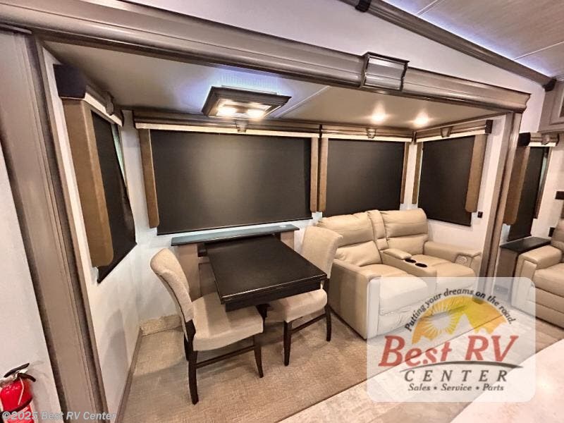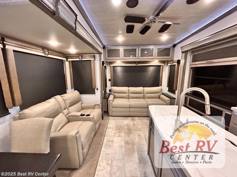 Watch your favorite show from the power theatre seating or the hide-a-bed sofa while the chef prepares a meal in the full kitchen including an island, a pantry and a coffee station. The convection microwave will probably be a favorite appliance for many. You will also love your master bedroom with a slide out queen bed or choose an optional king, plus you will have plenty of storage for everything under the bed, within a dresser, and inside the closet up front. There is a space to add a washer/dryer option and the barn door into this room offers style and saves space. You may like to relax outside with protection from two awnings, and the 2" towing hitch might come in handy as well.