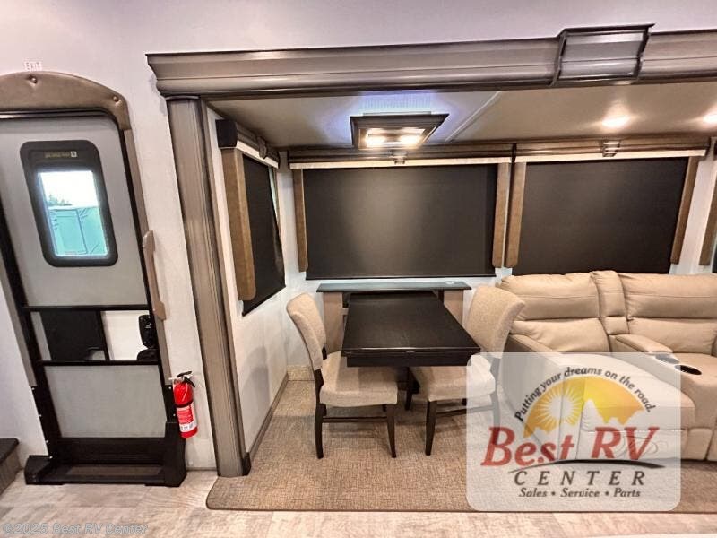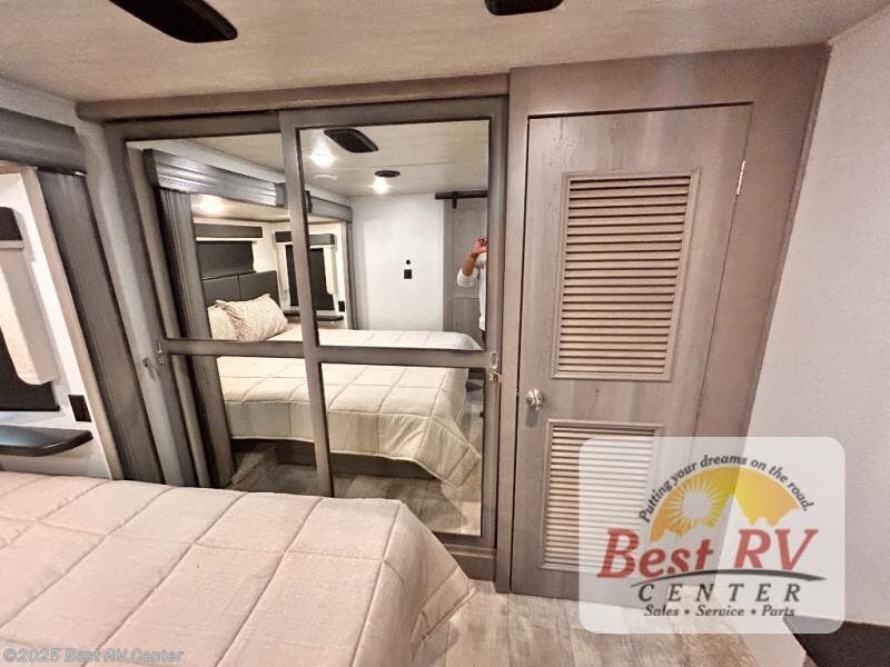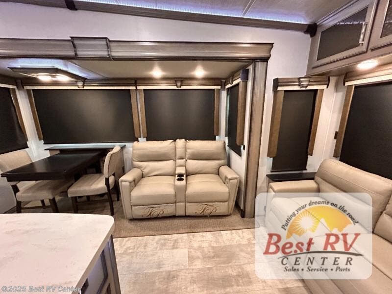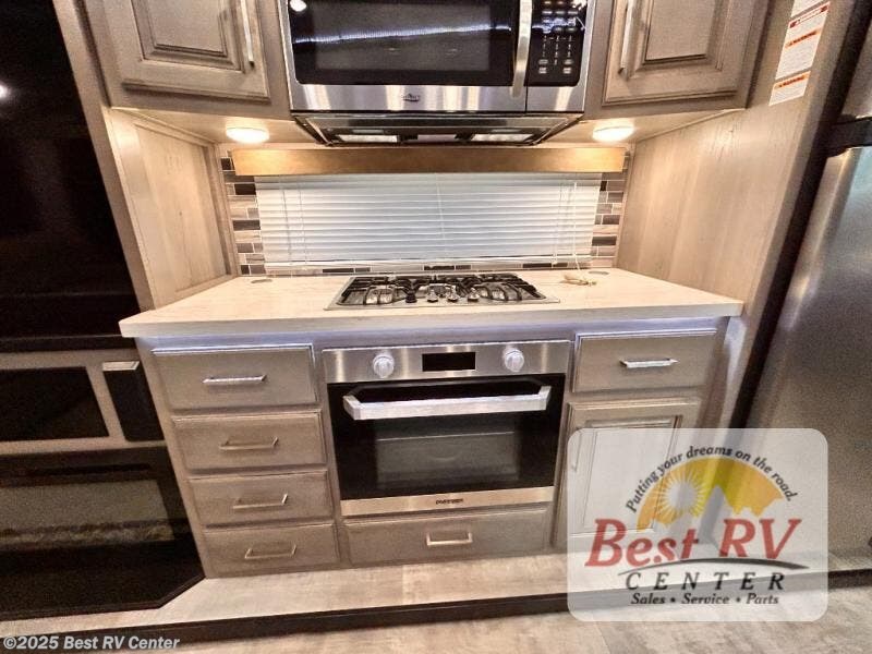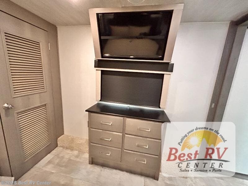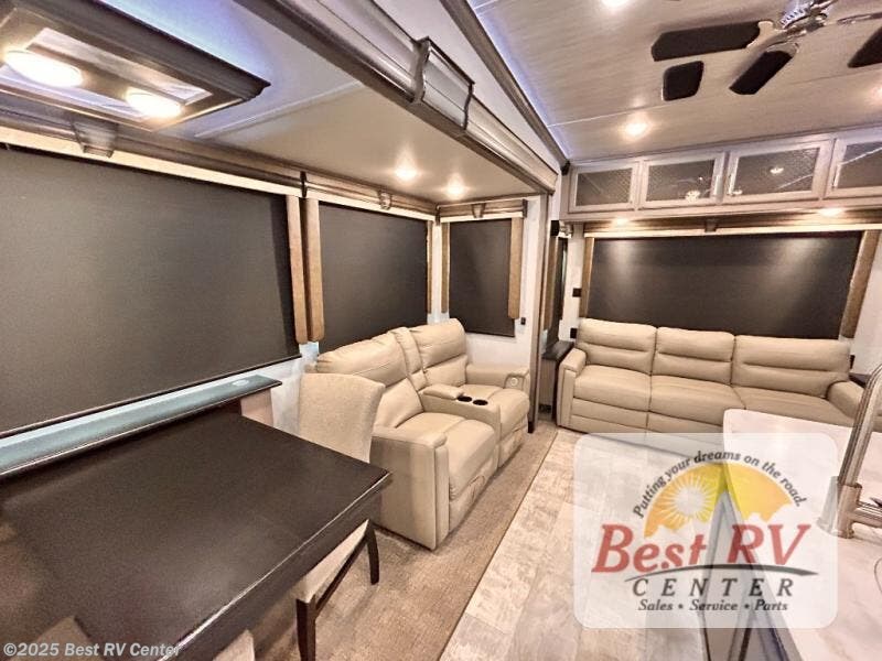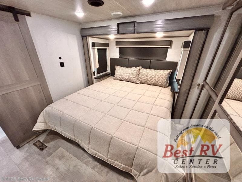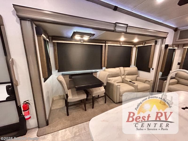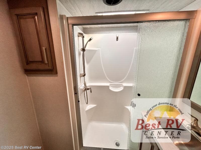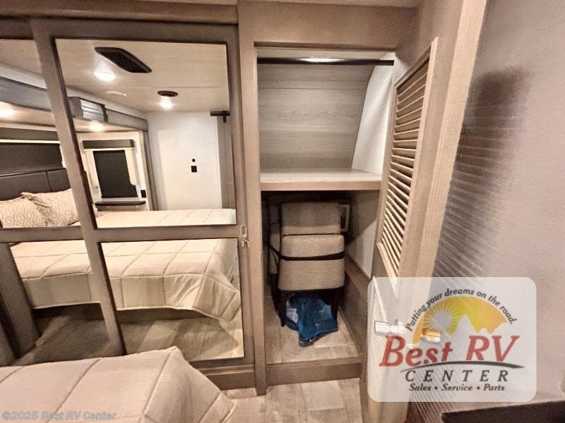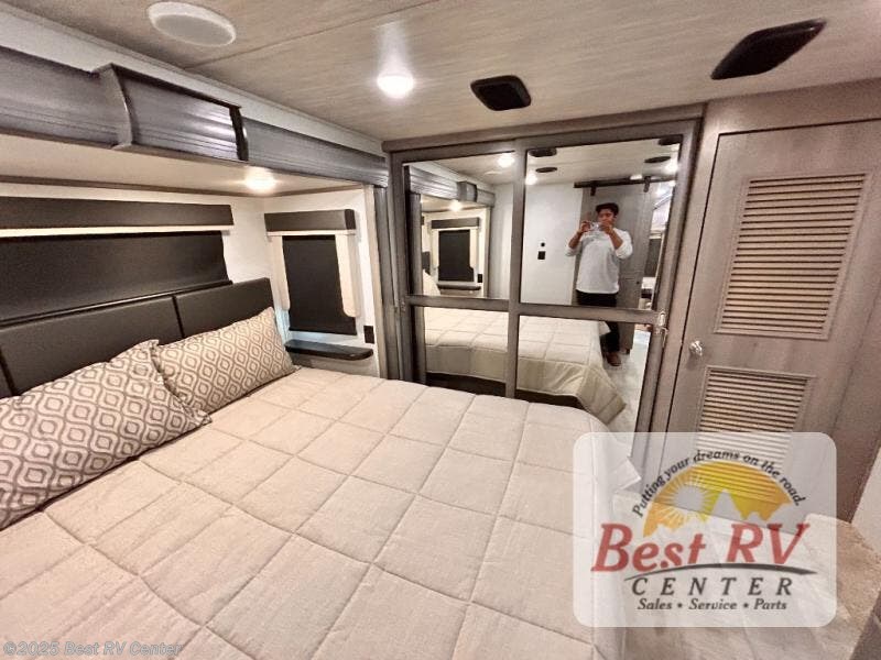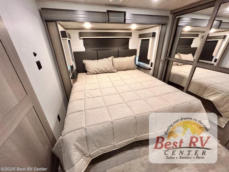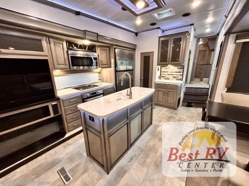 Watch your favorite show from the power theatre seating or the hide-a-bed sofa while the chef prepares a meal in the full kitchen including an island, a pantry and a coffee station. The convection microwave will probably be a favorite appliance for many. You will also love your master bedroom with a slide out queen bed or choose an optional king, plus you will have plenty of storage for everything under the bed, within a dresser, and inside the closet up front. There is a space to add a washer/dryer option and the barn door into this room offers style and saves space. You may like to relax outside with protection from two awnings, and the 2" towing hitch might come in handy as well.