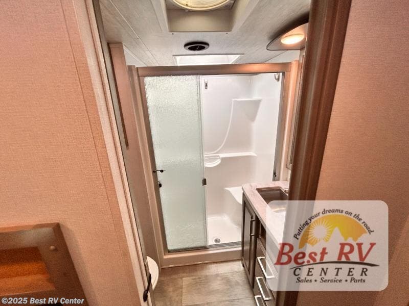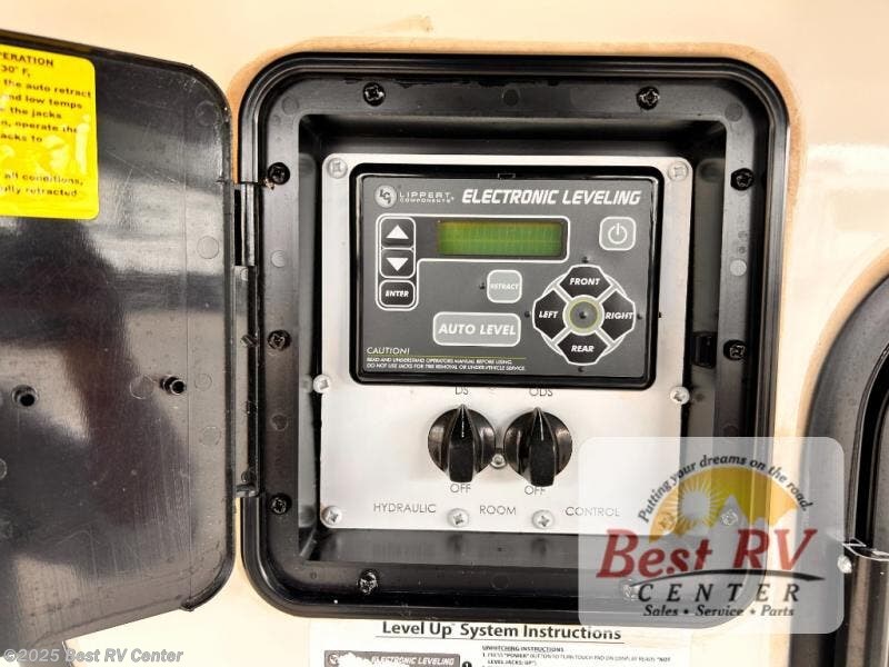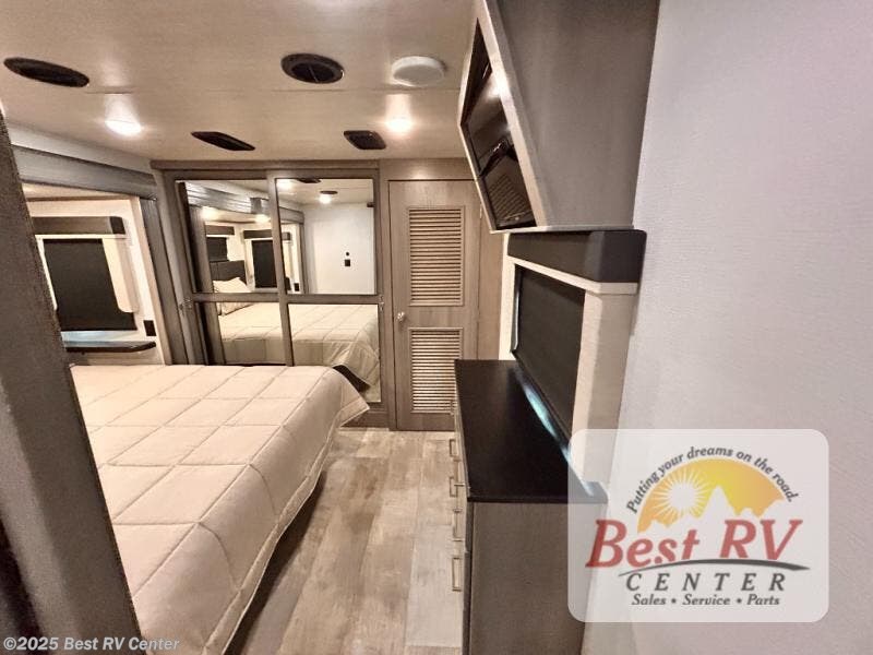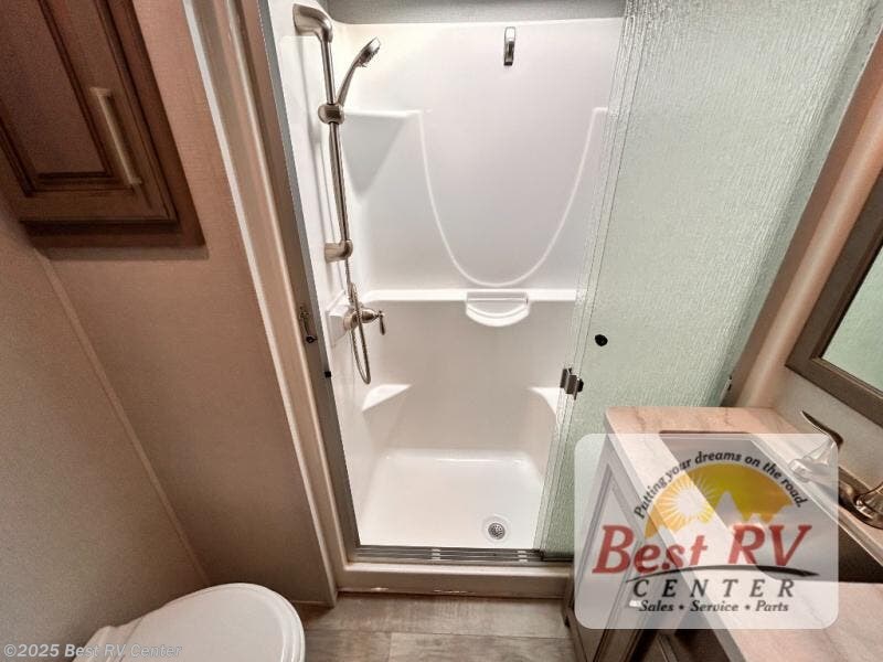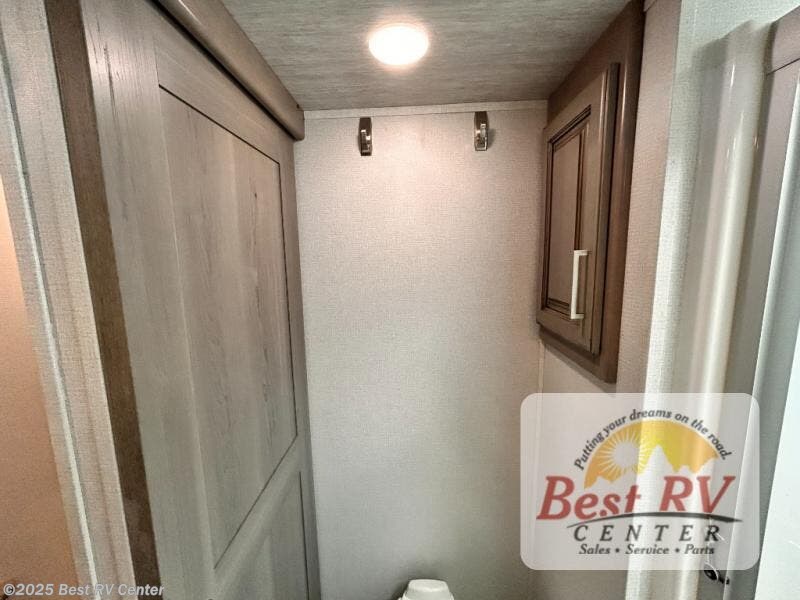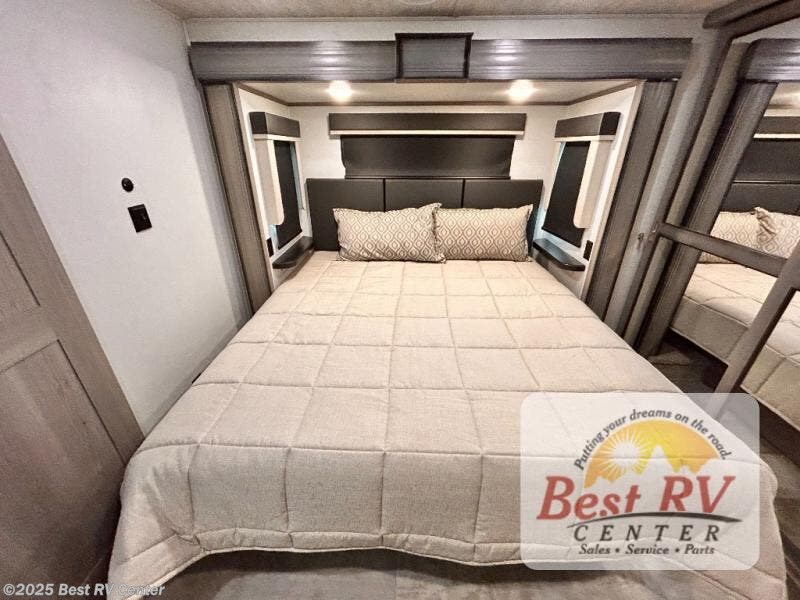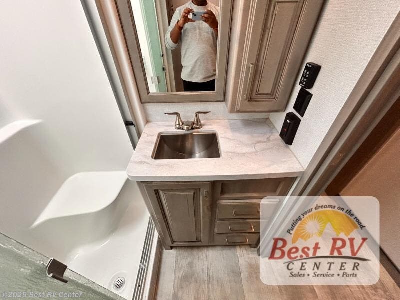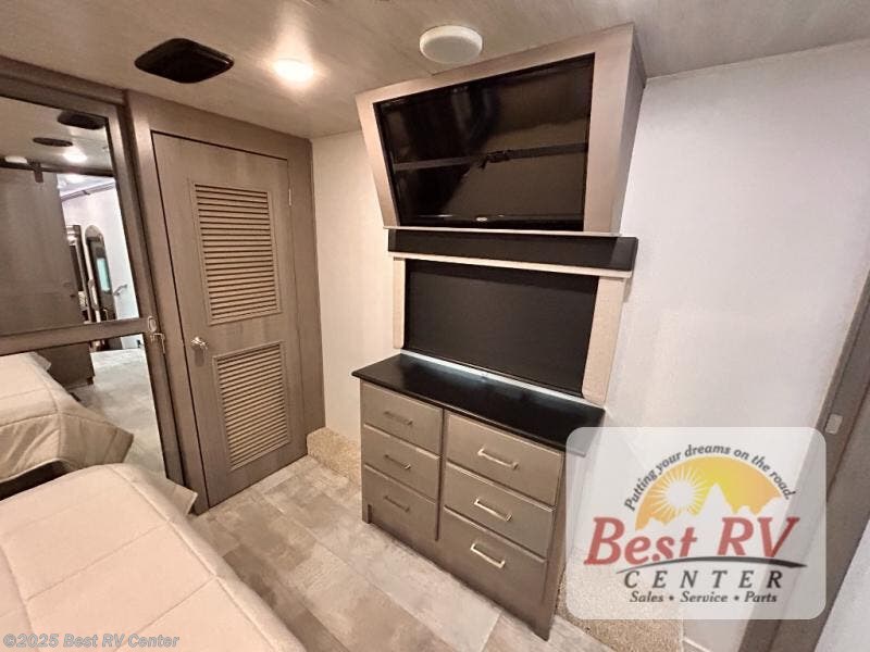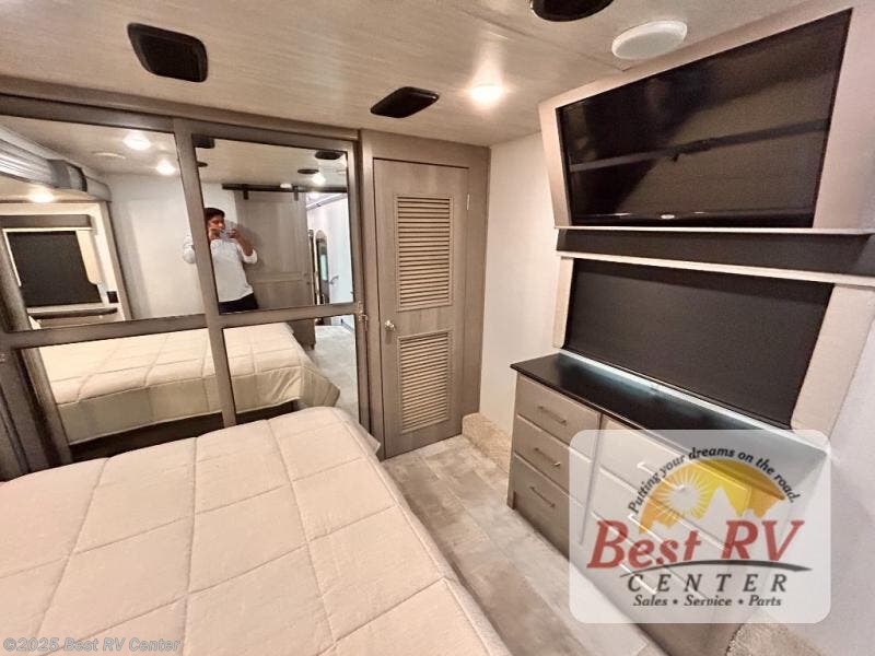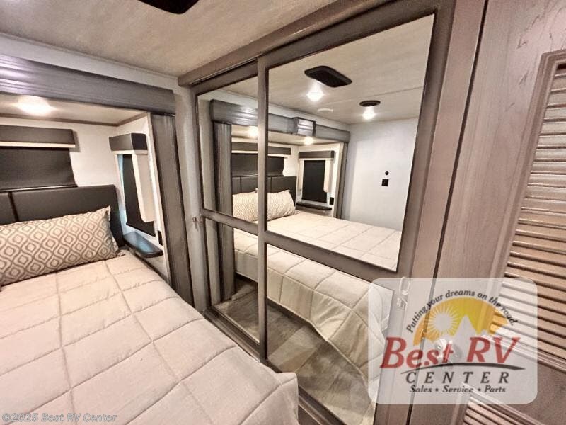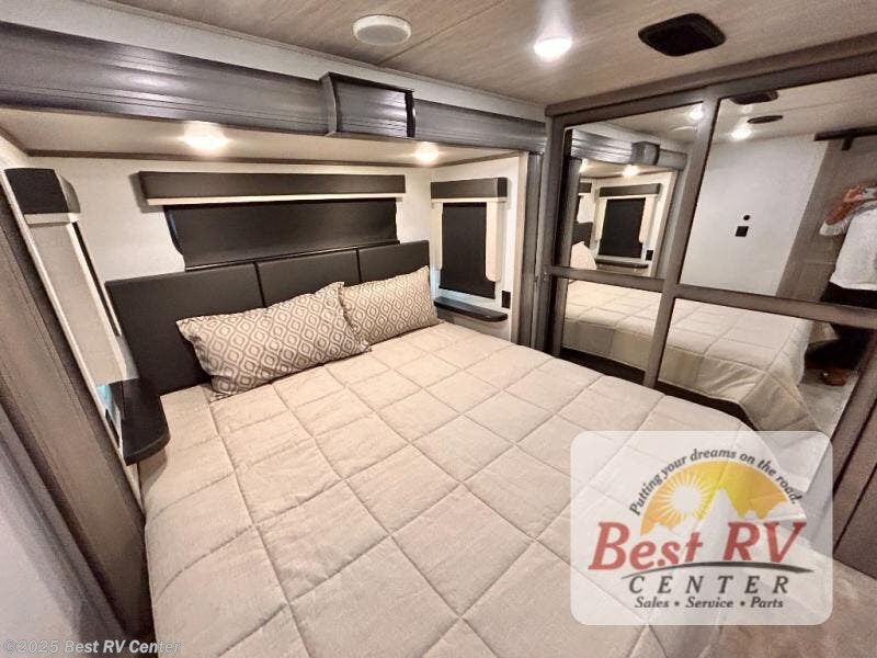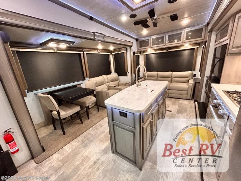Watch your favorite show from the power theatre seating or the hide-a-bed sofa while the chef prepares a meal in the full kitchen including an island, a pantry and a coffee station. The convection microwave will probably be a favorite appliance for many. You will also love your master bedroom with a slide out queen bed or choose an optional king, plus you will have plenty of storage for everything under the bed, within a dresser, and inside the closet up front. There is a space to add a washer/dryer option and the barn door into this room offers style and saves space. You may like to relax outside with protection from two awnings, and the 2" towing hitch might come in handy as well.