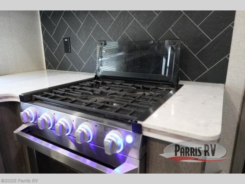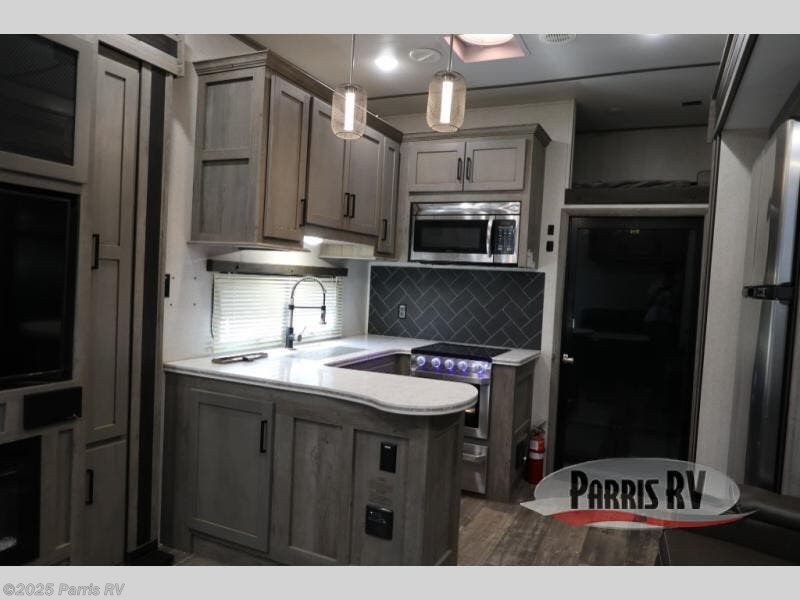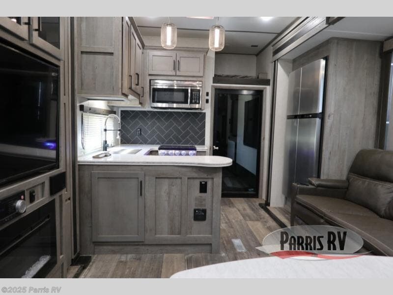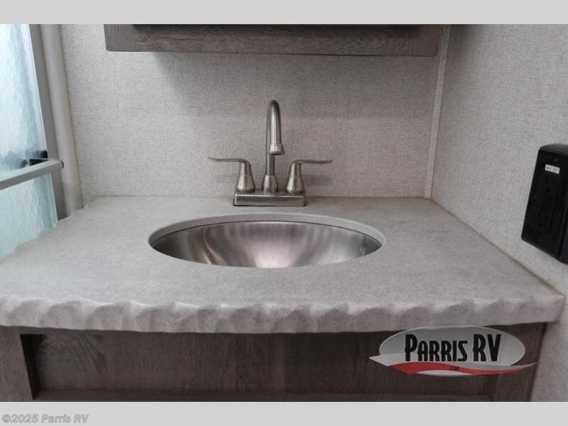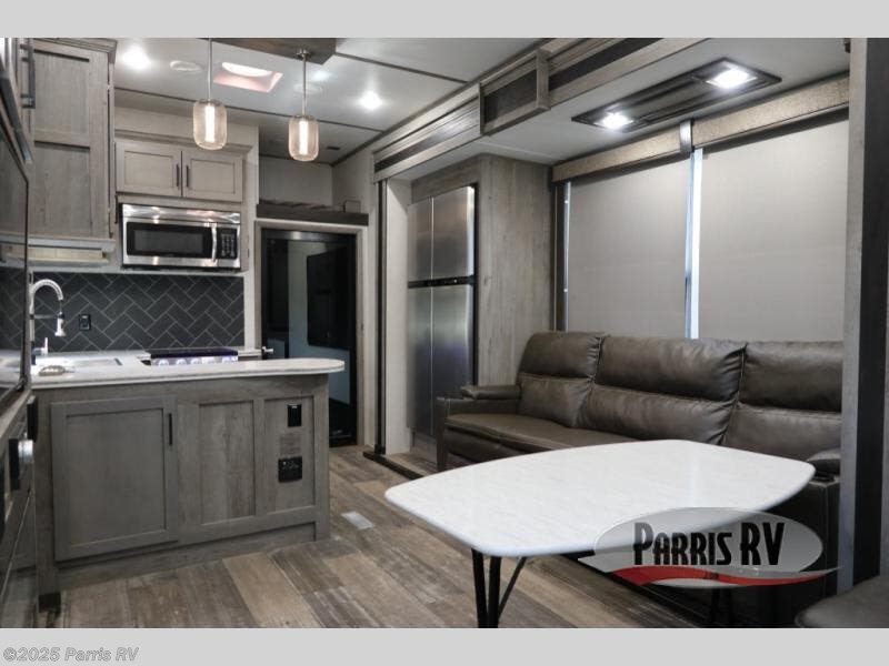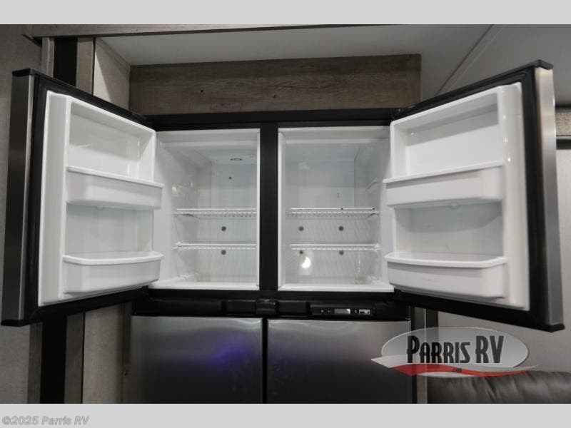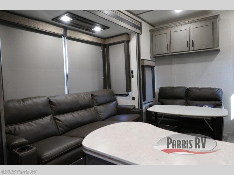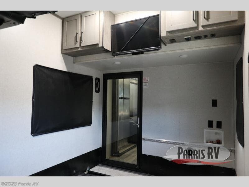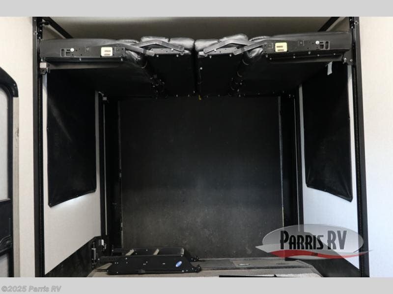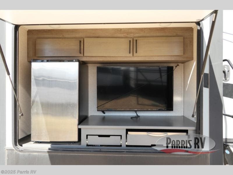 You will have everything you need after your hikes, dirt bike rides, and family walks around the campgrounds! From the outdoor kitchen and TV, the fuel tanks, and the two electric awnings with LED lights, to the queen-size bed unless you choose the Raptor king option, and the double entry bathroom offering convenience, there is comfortable camping throughout. The main living area offers seating with recliners for five, and the U-shaped kitchen countertop allows you to make meals without having to move for anyone walking around. And the garage provides sleeping space for four with opposing sofas and the electric bunk, plus a washer/dryer prepped space, overhead cabinets, and much more!
