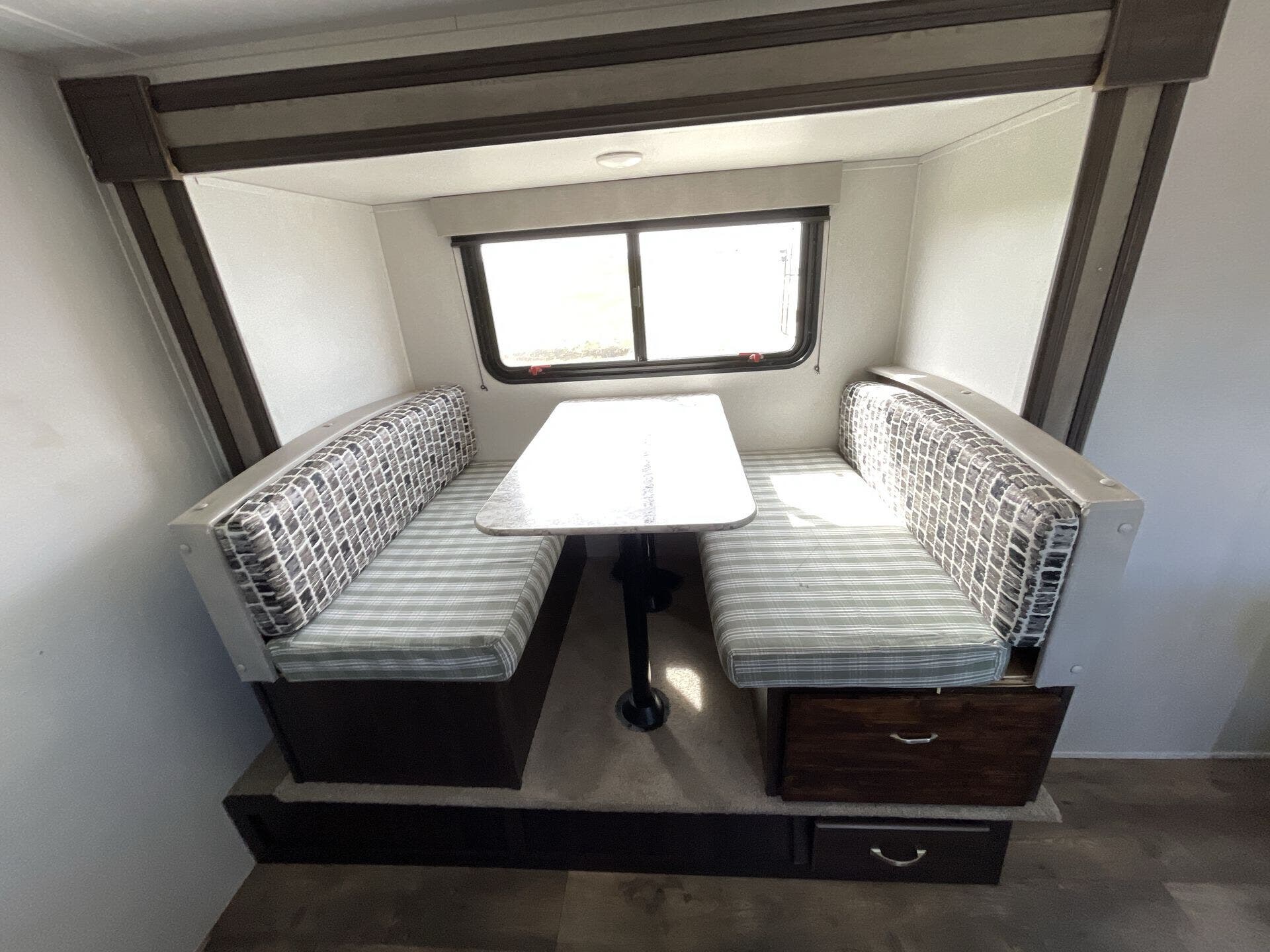 The 1790FQ showcases a well-thought-out front bedroom, mid kitchen, rear bath, and rear dinette layout. The front bedroom accommodates a queen bed for restful nights, while the rear dinette provides a cozy dining area that can flex into additional seating. A mid kitchen keeps cooking basics within easy reach, and the rear bath keeps the living area uncluttered. With one air conditioner and a slide-out enhancing the main living space, this floorplan prioritizes comfort and practicality in a compact travel trailer.
