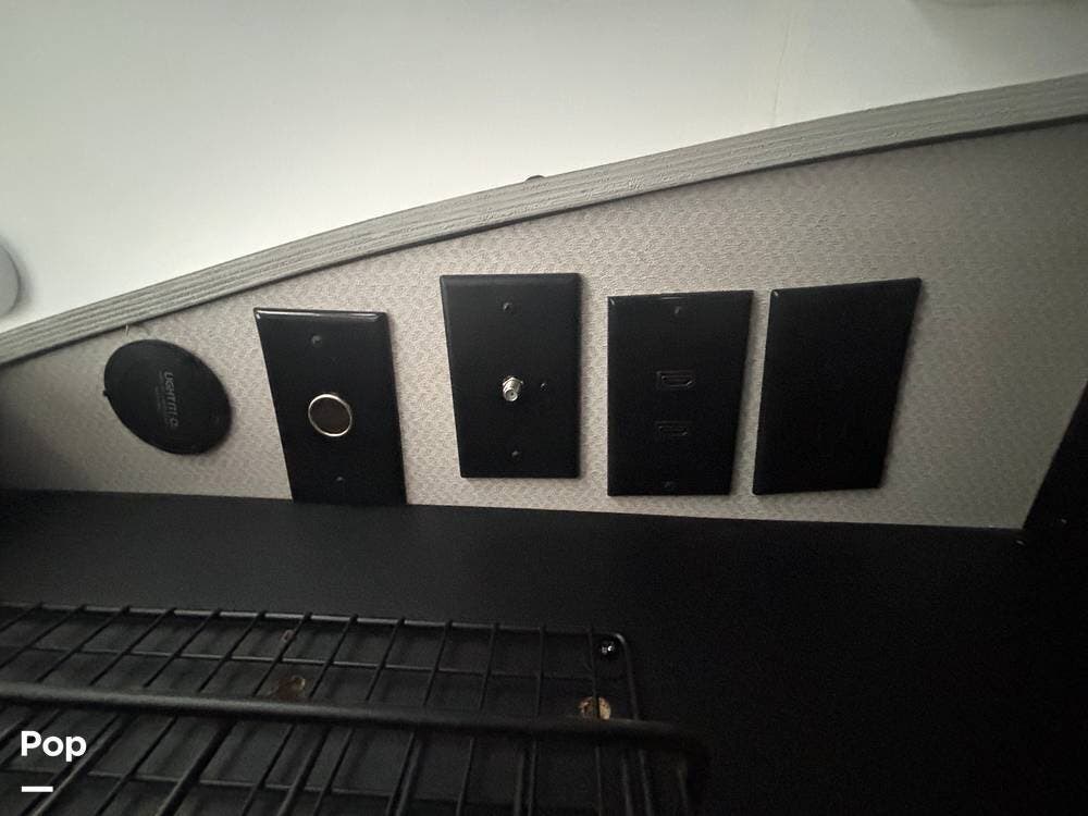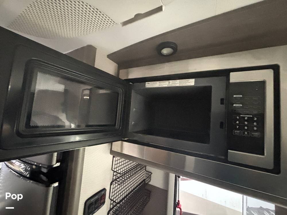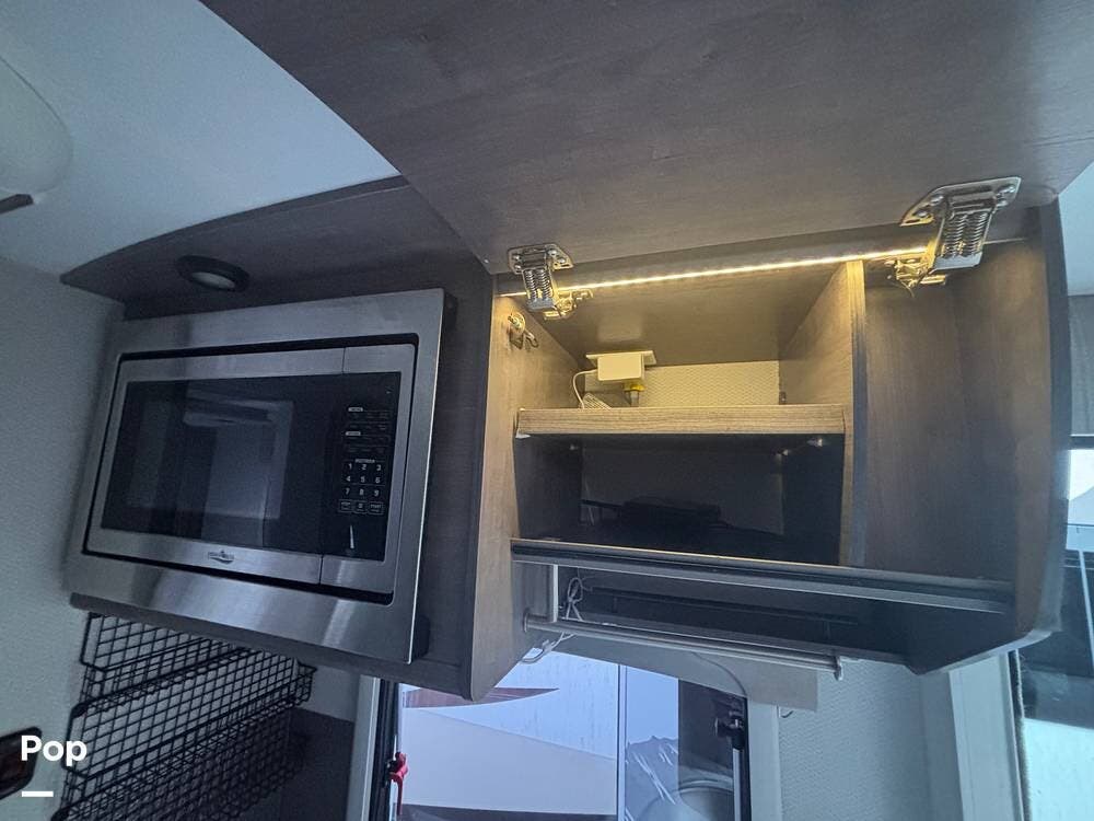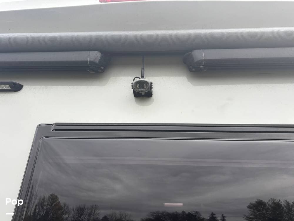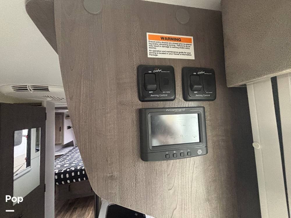Outside, you'll find an awning on the side and one in the rear, a pull-out fridge in the rear storage, propane tanks, storage, and a backup camera.