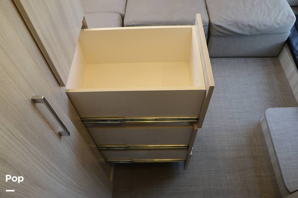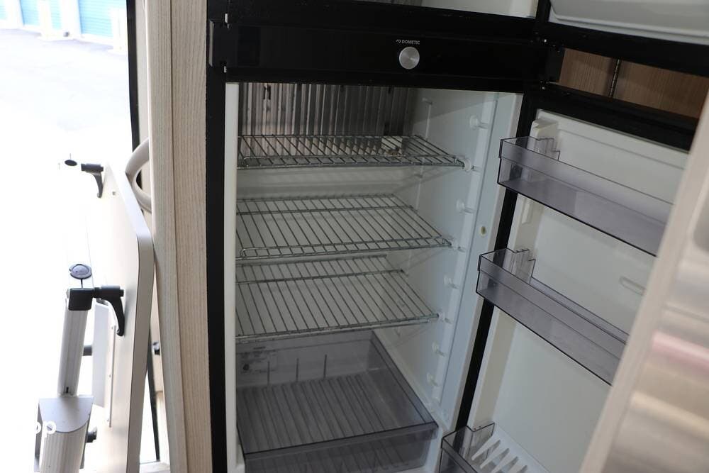 The Murphy Bed in the rear quickly moves up and out of the way, and can be lowered when it is time to go to bed. When it is up, the L-Shaped lounger provides a comfortable living area with lots of storage space available above and below the lounger.