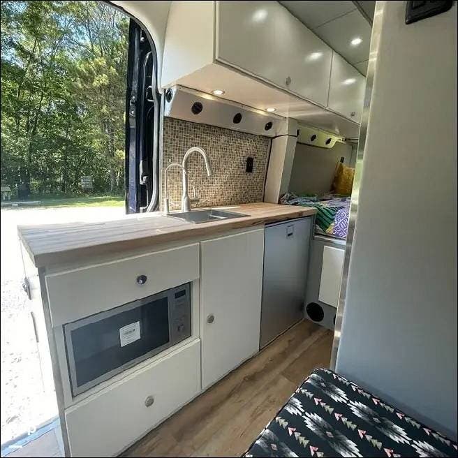 A built-in kitchenette includes a sink, microwave, and refrigerator, while a compact toilet adds convenience on longer journeys.