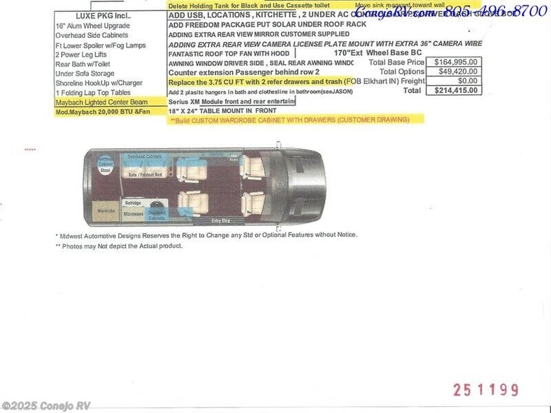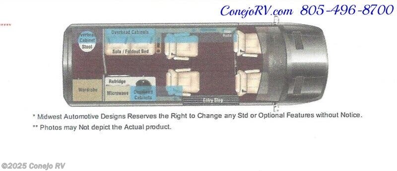 2020 Midwest Automotive Designs Custom Designed Day Cruiser 144 Luxury Touring Coach Mercedes Turbo Diesel 7K Miles **114,990** ***Optional Upgrades Include Apple Tv, Wireless Internet Router, Rear Tailgate Prep Kit, Power Awning W LED Lighting, Exterior Shower, Fantastic Roof Fan, Deluxe Seat Massage & Heat Captains Seats, Custom Wardrobe & Drawers, Side Screen Door, Awning Window Drivers Side, Roof Rack & Custom Ladder, 4 Camera Viewing System, 600AH Lithium Eco-Freedom Package W 20,000BTU Roof AC, Suspension Upgrade Package, Rear Hitch W/ Wiring package, Cassette Toilet*** Luxury Touring Coach with Bathroom and Kitchenette, Mercedes 2500 144 Chassis, 3.0L Mercedes Turbo Diesel Engine, Automatic Transmission, Inverter, Ultra Leather Fold Out Couch, Wall Consoles With Cup holders, Multi Passenger Rear Maybach Style Seating, Stowable Drivers Side Table, Rear Wall With Door Offers Fully Enclosed Bathroom, Galley With Solid Surface Counter Top With Sink, Dometic Fridge & Freezer, Microwave, Soft Touch Interior Roof & Walls, AutoPro BD1208 Media Center, Flat Screen TV, Infotainment Center With Bluetooth/Blueray/HDMI/NAV/SD/AM/FM/CD/Sirius Ready Stereo System, Ultra Leather Seating Throughout With Captains Seats That Slide/Swivel/Recline, Seats 6, Steering Wheel Controls With Wood/Leather Steering Wheel, Night Shades Throughout, Complete Privacy Shade Package, Dark Tinted Side & Rear Windows, Deluxe Lighting Controls, Overhead and Floor Courtesy Lighting, Dual Rear Wheels, Alloy Wheels, Tow Package, Gently Used with Low Miles! ***Only $114,990*** We have some fantastic financing and take trades also! It is our #1 goal that your experience with our company is an enjoyable one with our staff of industry professionals, Conejo Wholesale Auto & RV, Exclusive Ventura County Dealer For Winnebago Navion, Revel, Solis, Ekko, and Travato, All Storyteller Products, Outside Van Syncline and Approach, Tiffin GH1, All Roadtrek Products, We Also Carry Some Quality Pre-Owned Motorhomes which come with Our 45 Day/1000 Mile In-House Warranty at No Charge, Conejo RV, 661 E. Thousand Oaks Blvd, Thousand Oaks, CA 91360, 805-496-8700, Open 7 Days, 9am to 6pm, All Coaches Fully Inspected, Serviced and Detailed, Come Experience the No Pressure No Haggle Sales Approach at Conejo RV, We Also Buy Clean Late Model Coaches, 1 Year Free Camping Membership Included Ask For Details! (***plus tax & license fees***)