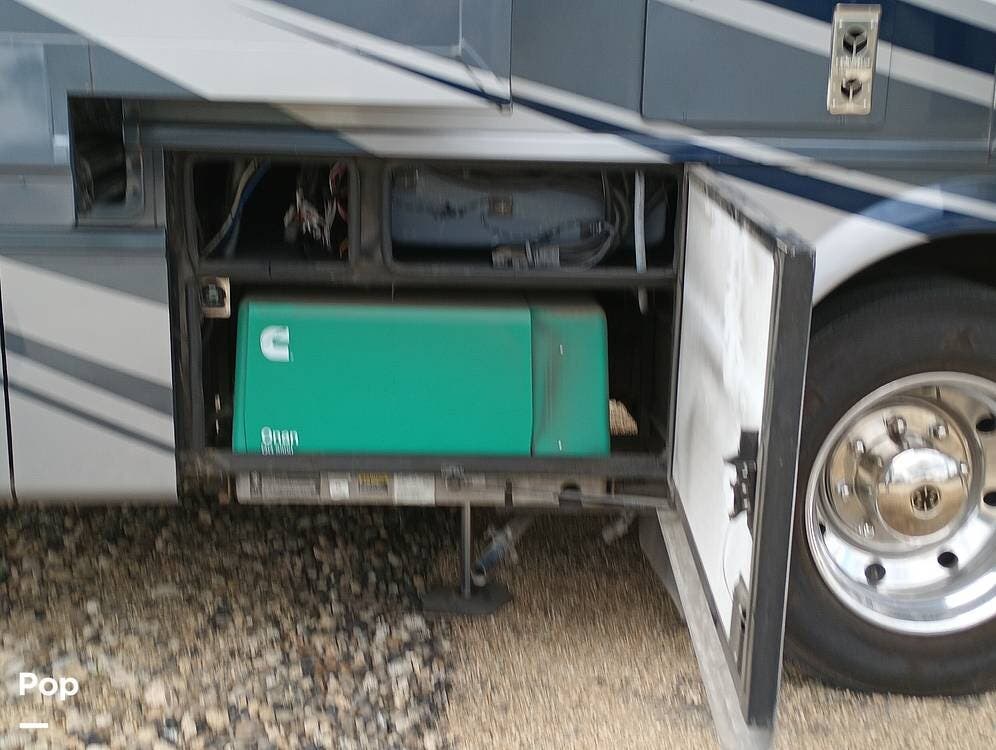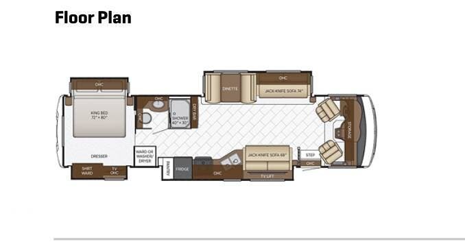 This coach has a lit basement storage, an automatic entry step, a generator, side-hinged baggage doors, hydraulic leveling jacks, and double-pane windows.