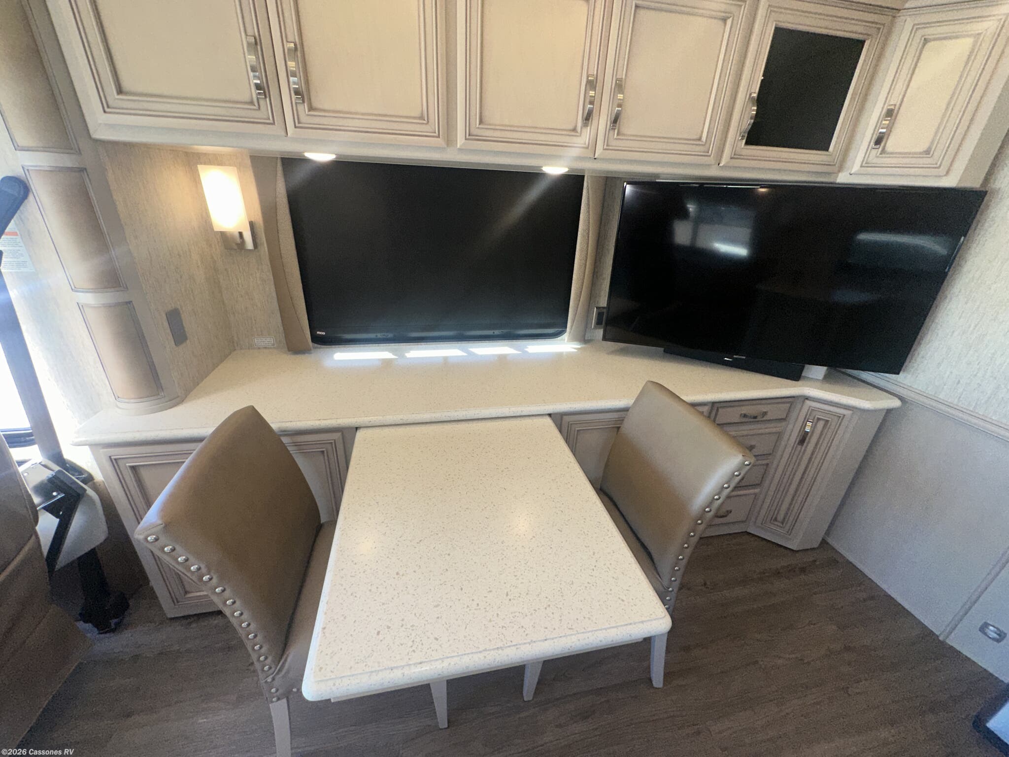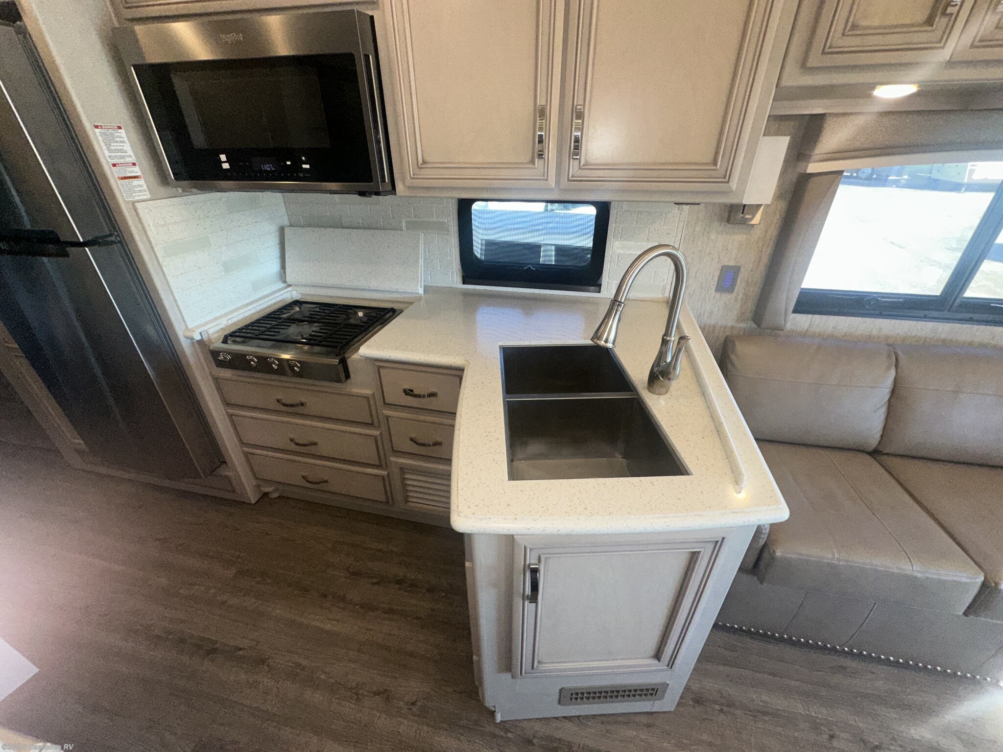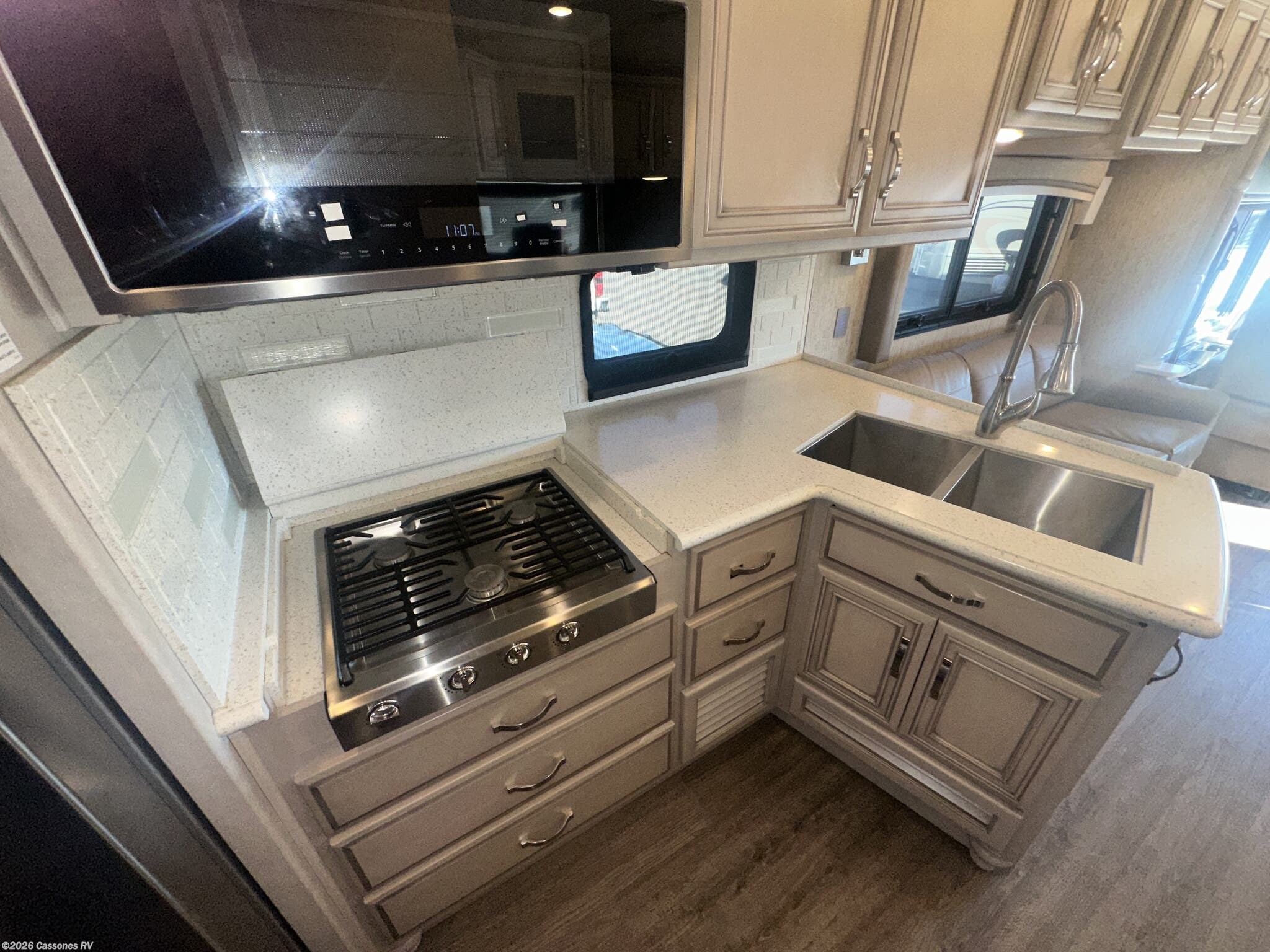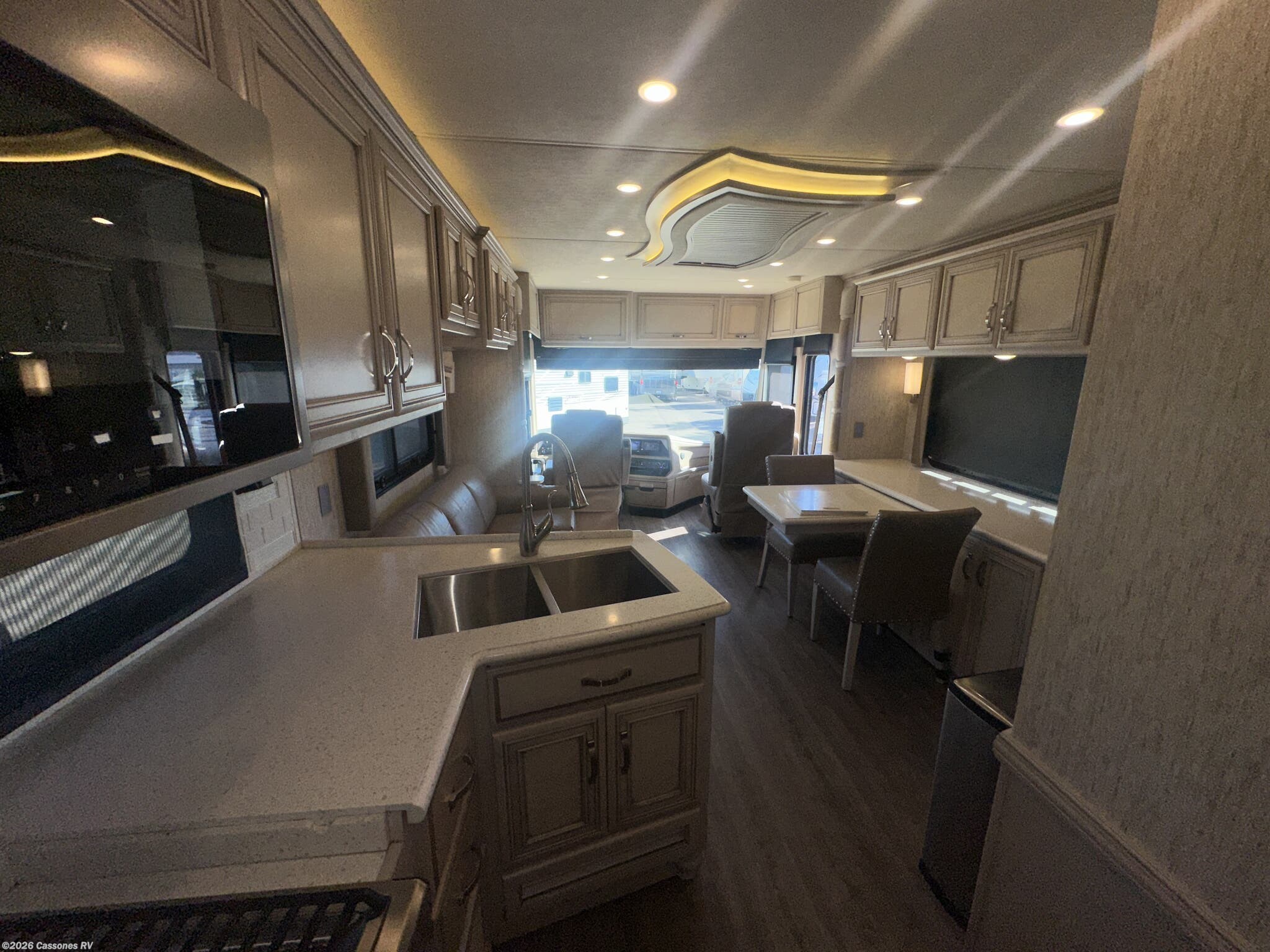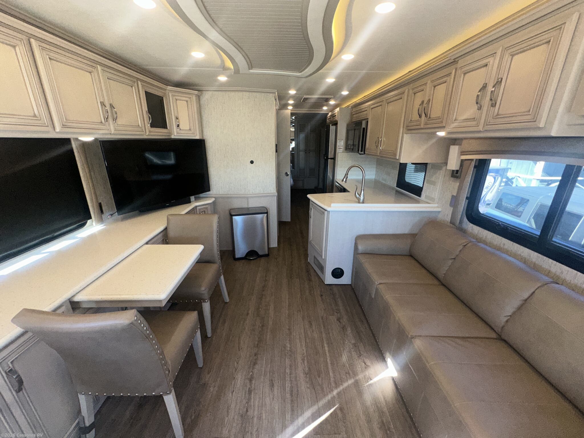 Interior Luxury: Solid surface countertops, hardwood cabinetry, tile flooring, and LED lighting throughout
